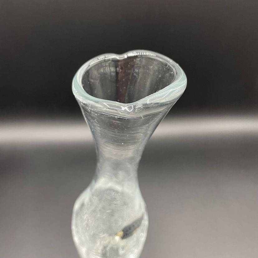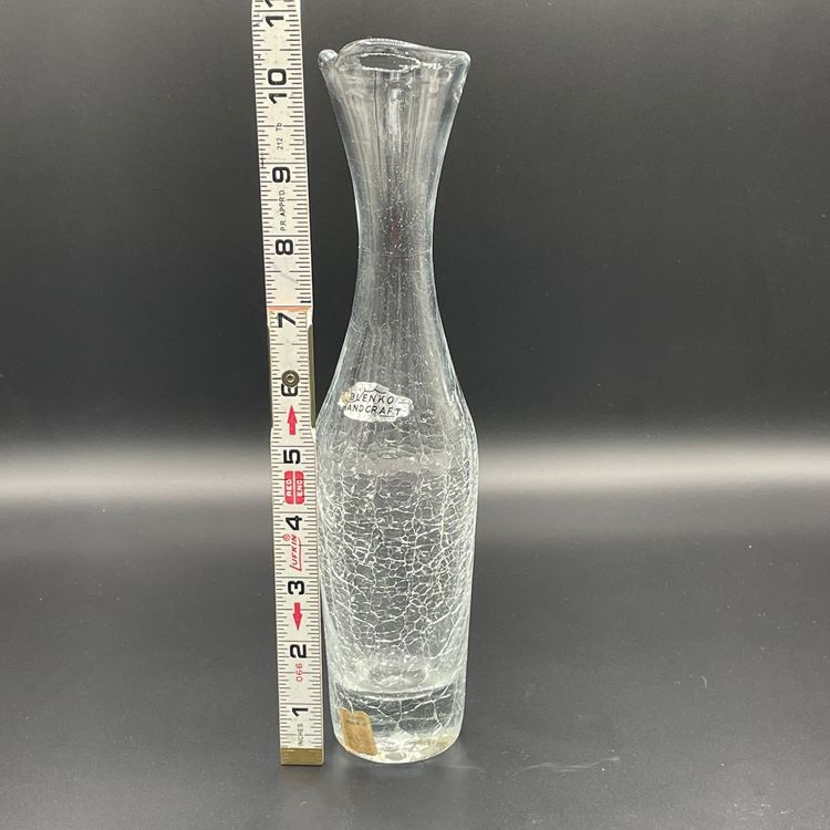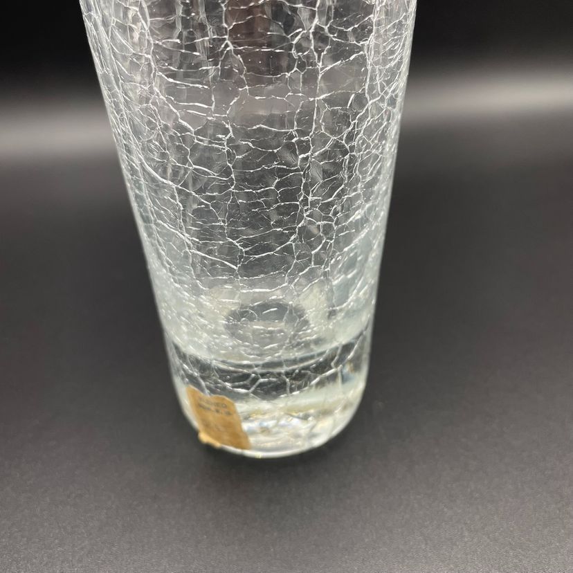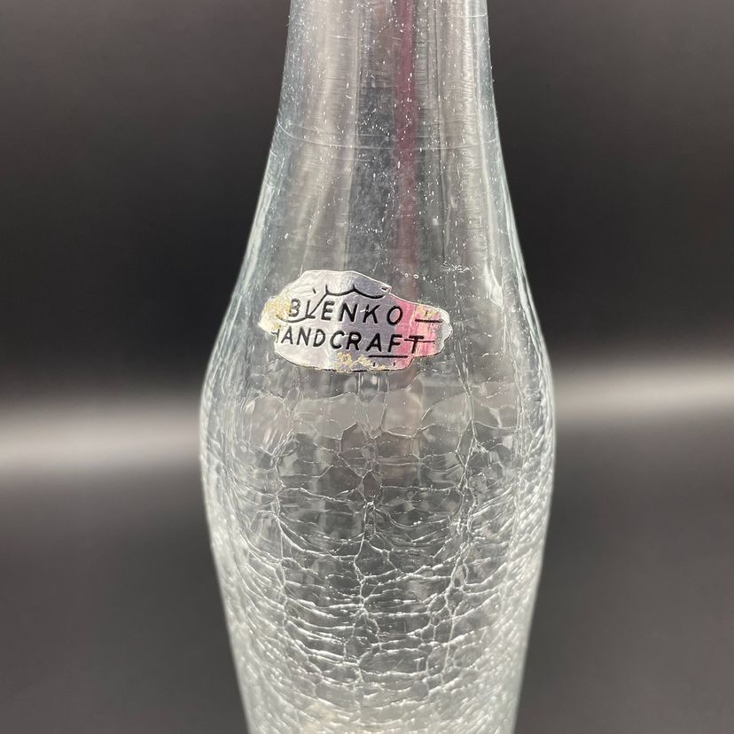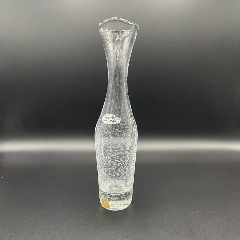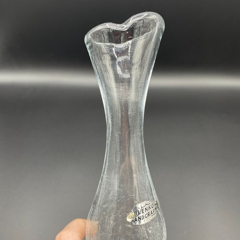 Beautiful Blenko clear crackle vase with original store sticker and Blenko sticker.