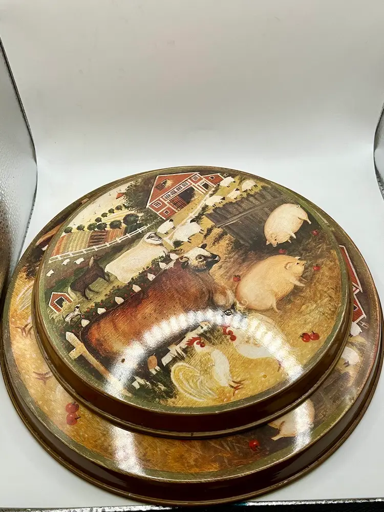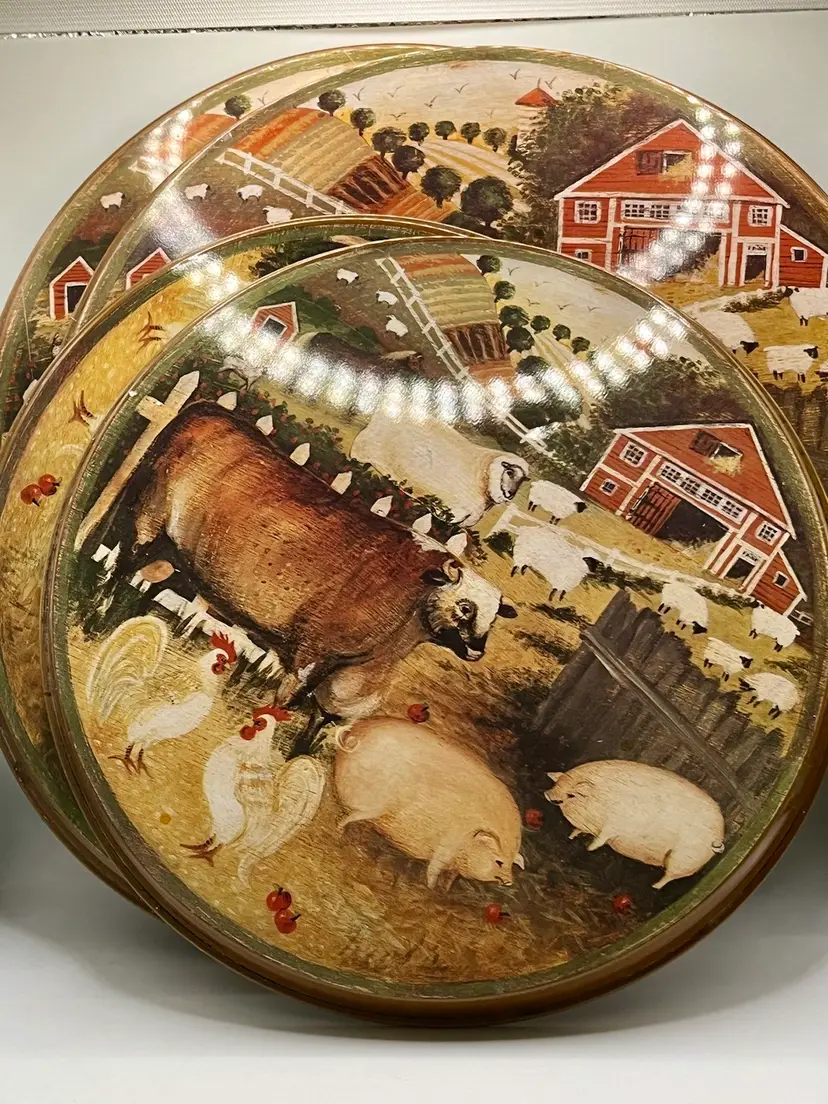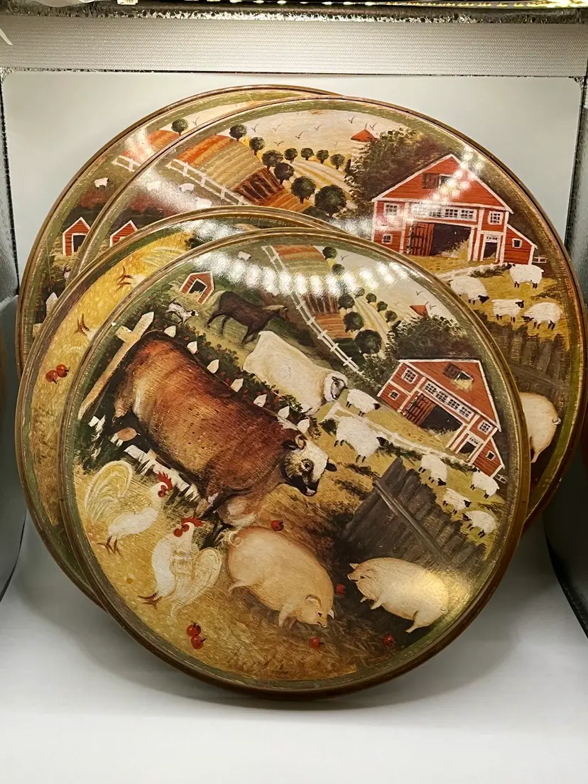 Vintage Block Country Farm Gear Collection Stove Top Covers Metal Set Of Four. No Condition Issue. 11”
