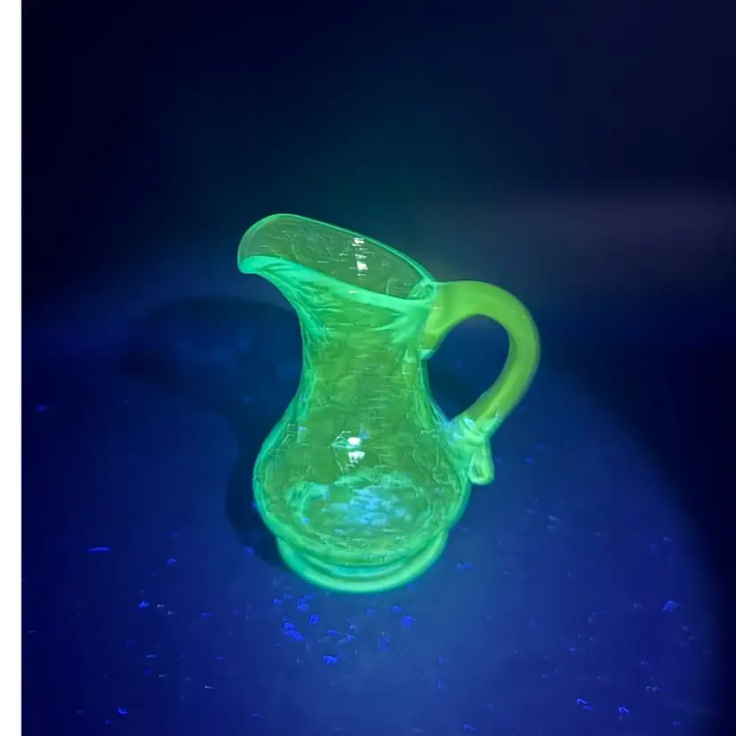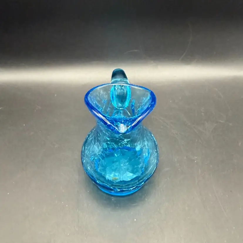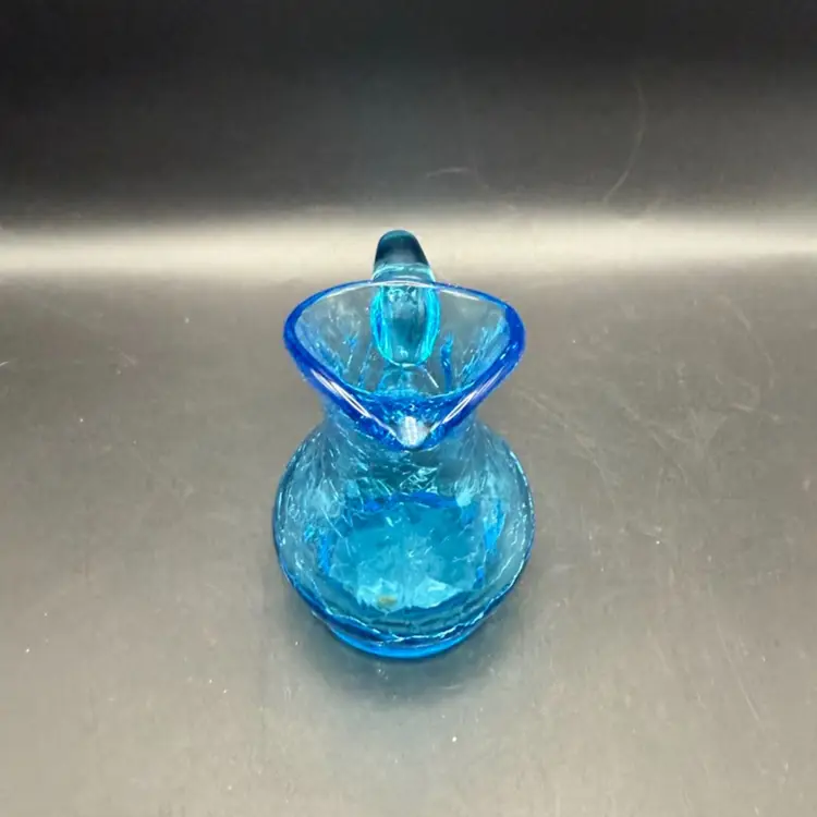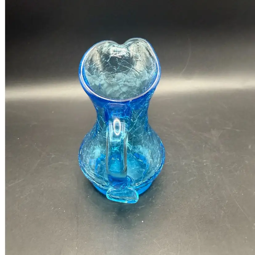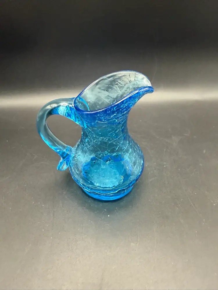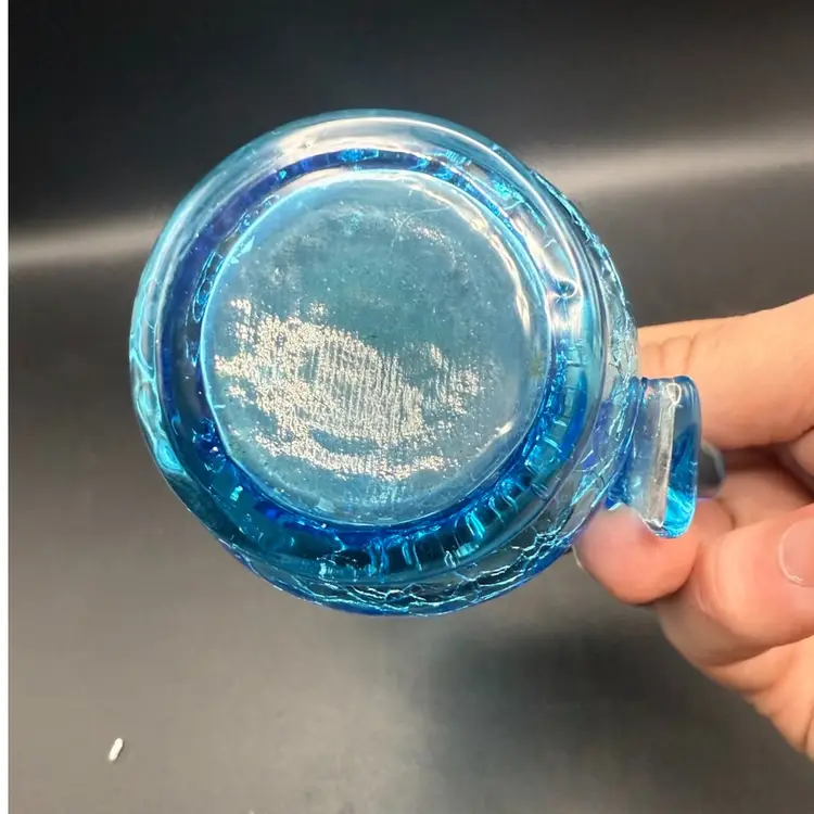 Crackle glass, also known as ice glass, is a decorative glass technique where the glass is reheated after being cooled, causing a network of fine cracks to form. These cracks are then often filled with a contrasting color, typically silver or gold, to enhance the visual effect. This technique was particularly popular in the mid-20th century. This is 3.5 inches.