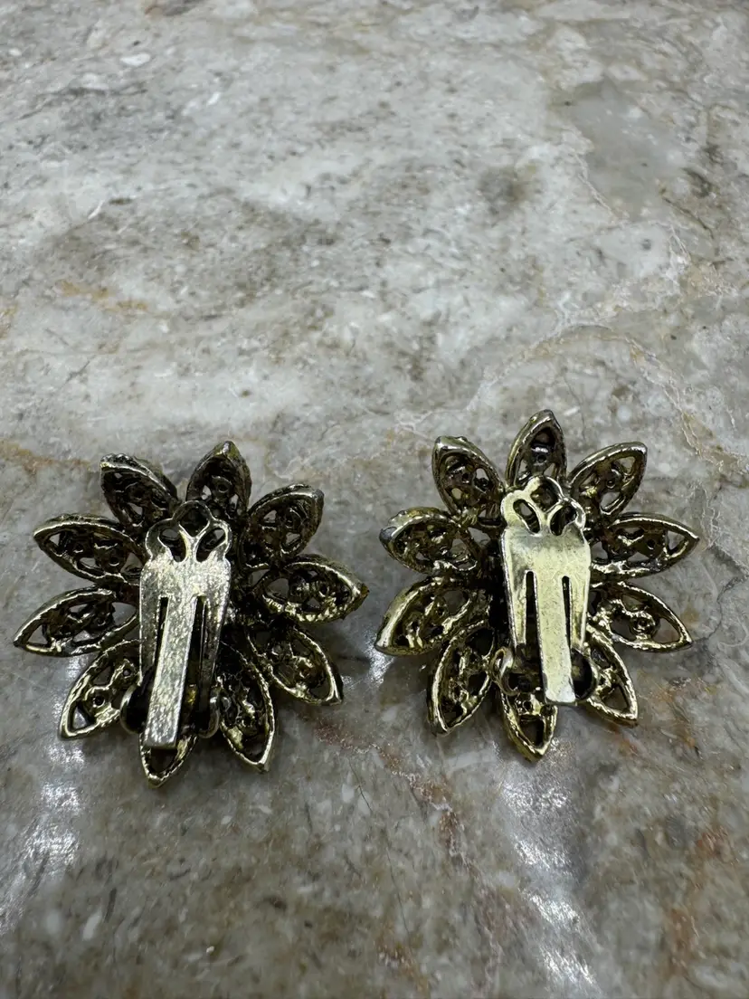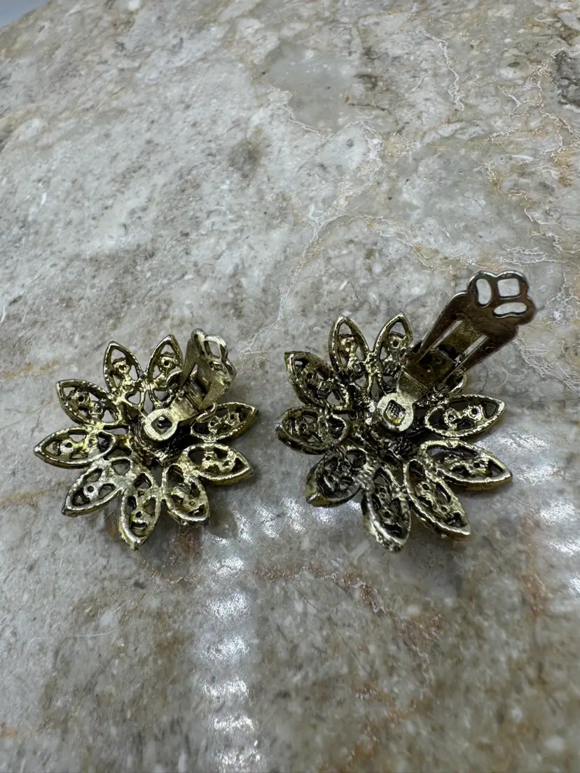 These gorgeous sparkly Vintage Glass Rhinestone & Faux Pearl Gold Tone Clip Earrings are amazing! Beautiful blue hues. Excellent condition. Measure