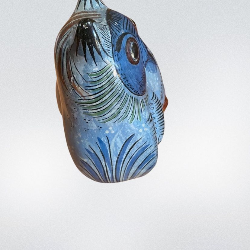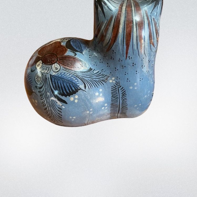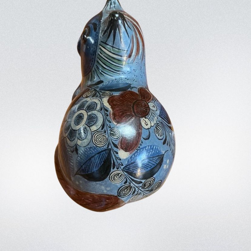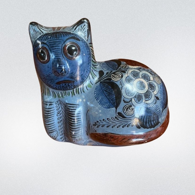Lovely blue Tonala pottery cat. Unsigned. Letter “E” imprinted on bottom. 4.5” tall. 5” long. Minor paint wear for age. No chips. No cracks. Most likely Mexico.