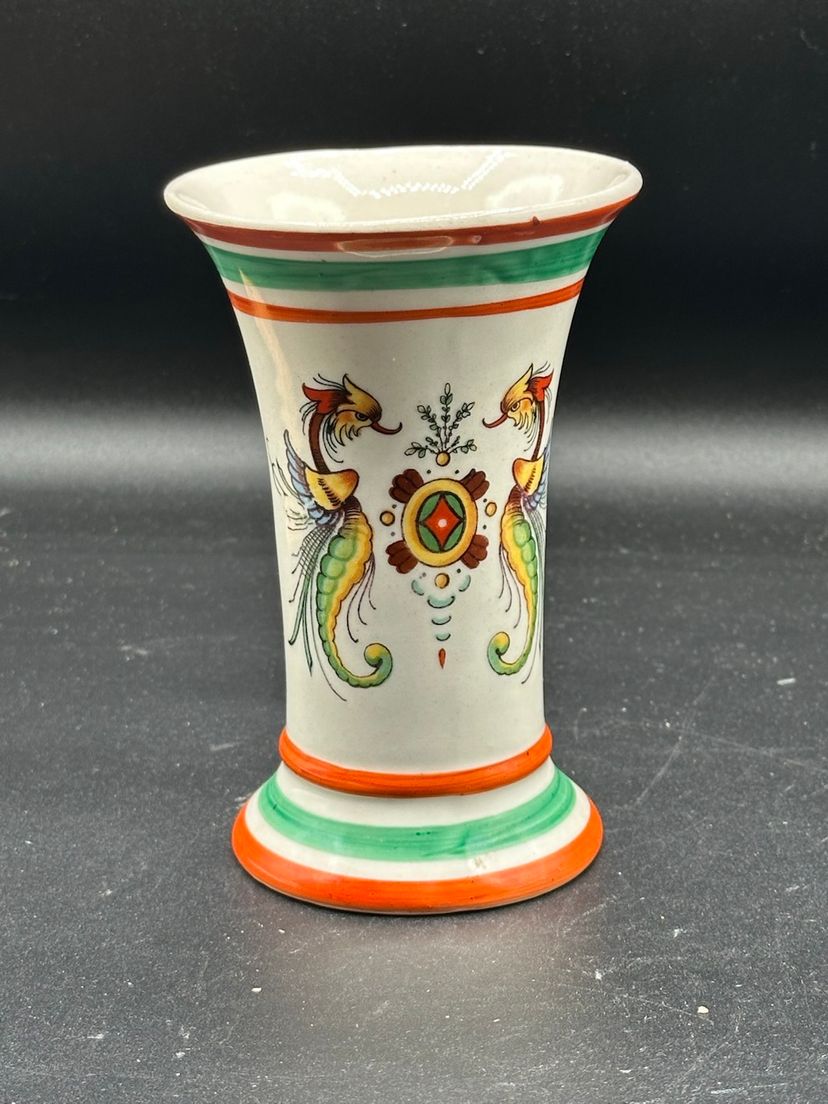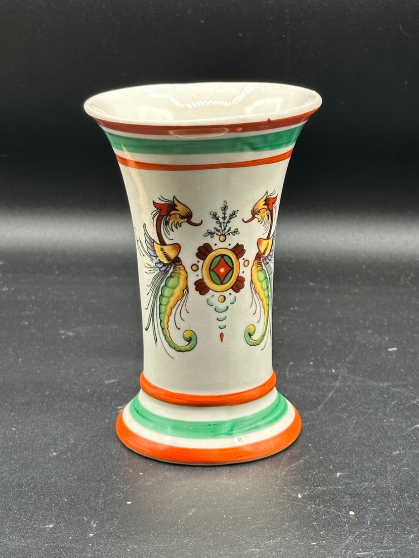 This beautiful vintage vase from Bohemian Czech features a stunning phoenix and dragon pattern in ivory color. The vase is made of ceramic and was crafted using traditional pottery techniques. The piece exudes a Bohemian style and is a perfect addition to any home decor.