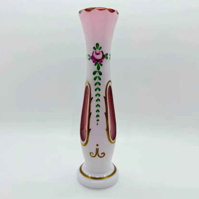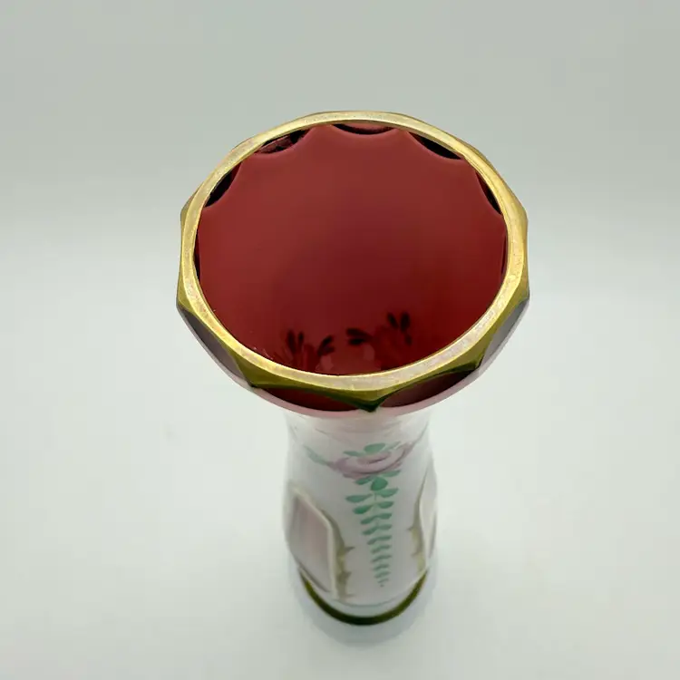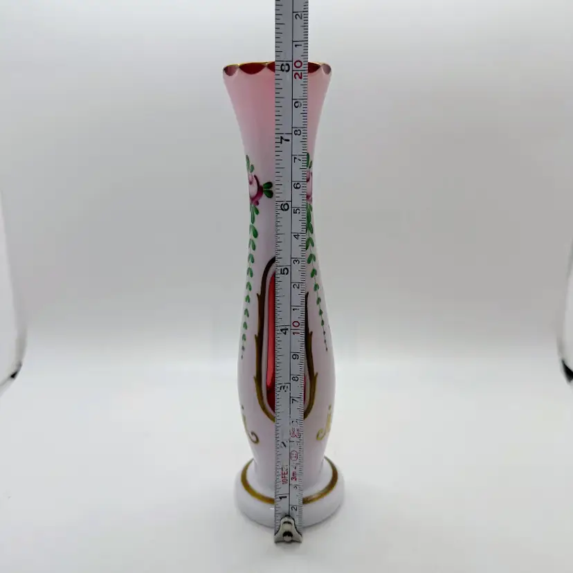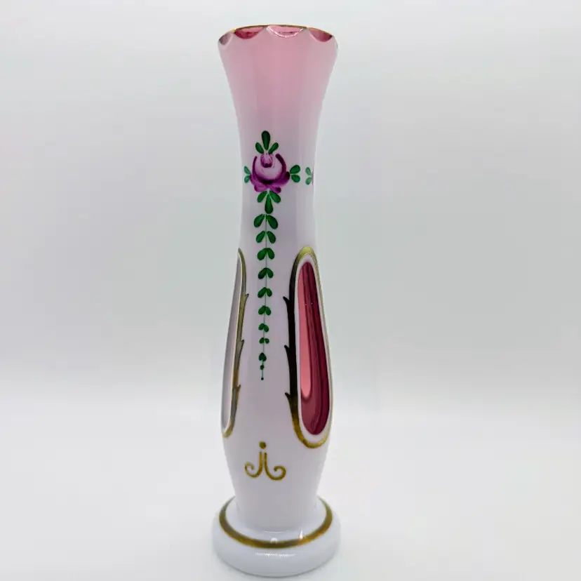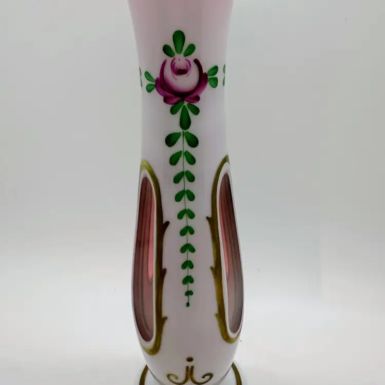 Vintage Bohemian Czech White Glass Cased Cut to Cranberry Pink Hand Painted Bud Vase. Hand painted roses. No chips or cracks. Signs of wear and use. Tarnishing and are to the gold metallic accents. Please see pictures.