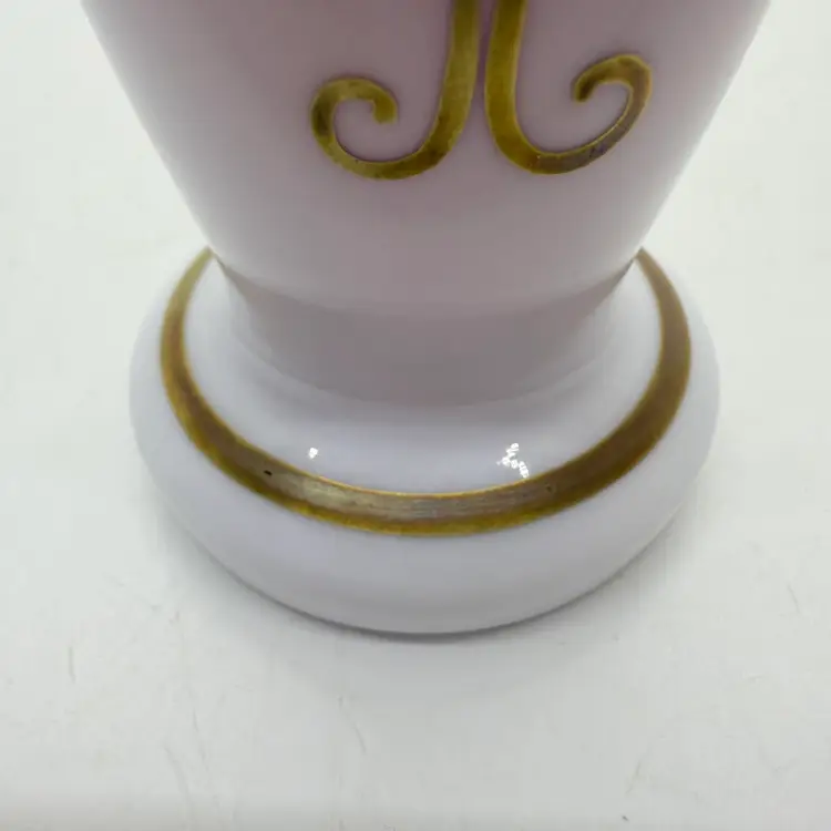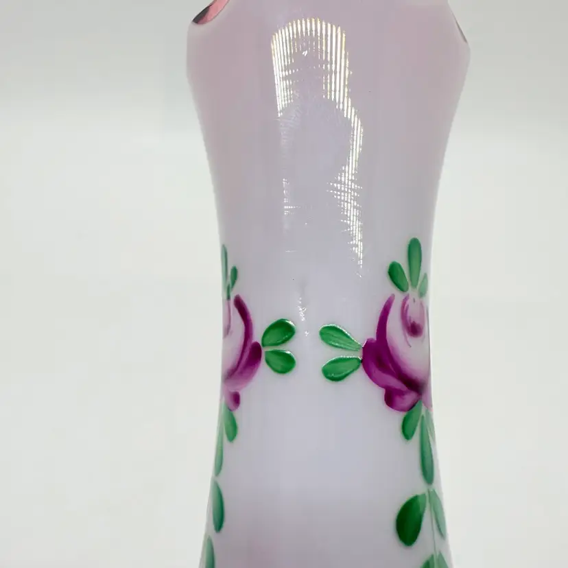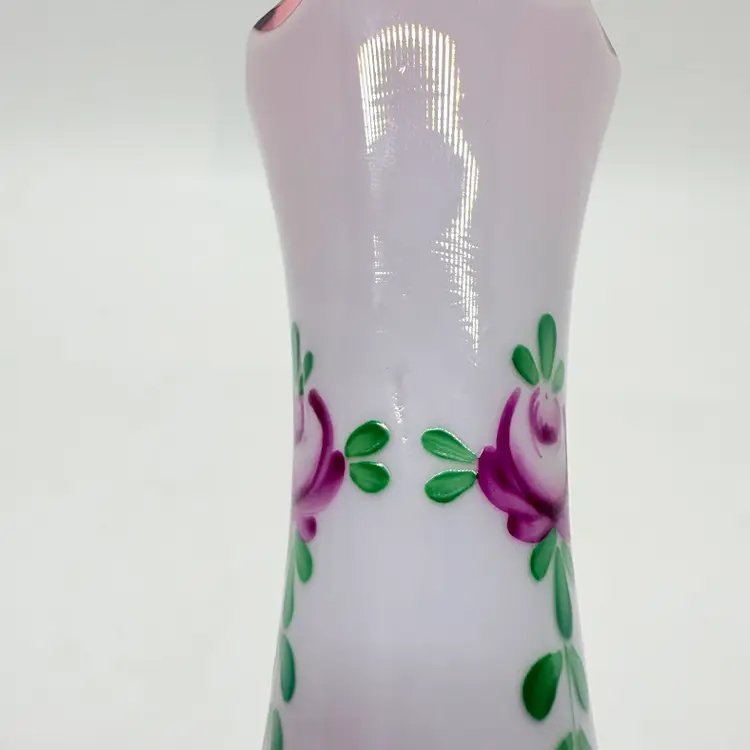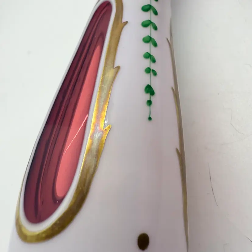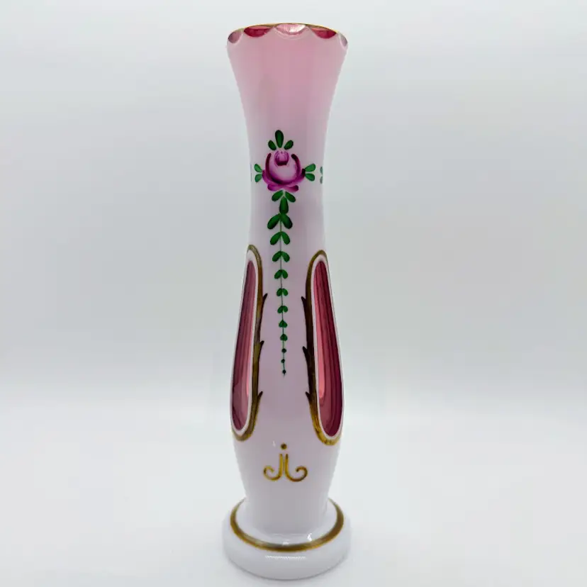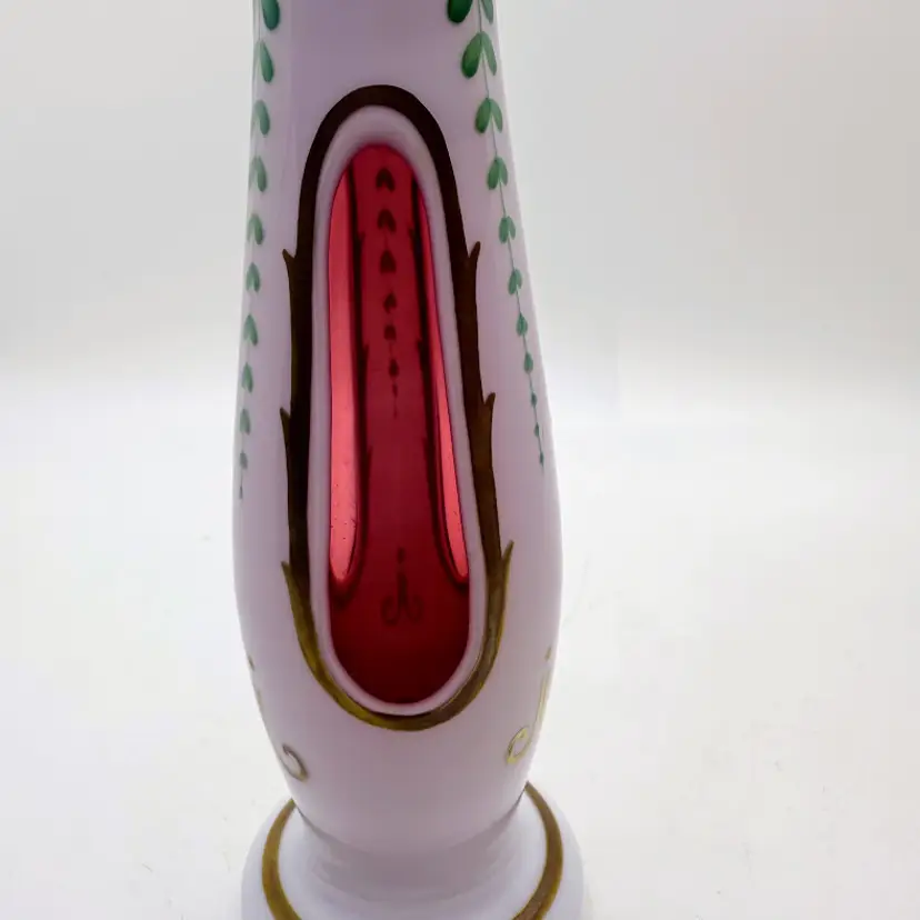 Vintage Bohemian Czech White Glass Cased Cut to Cranberry Pink Hand Painted Bud Vase. Hand painted roses. No chips or cracks. Signs of wear and use. Tarnishing and are to the gold metallic accents. Please see pictures.