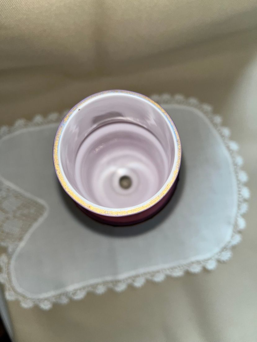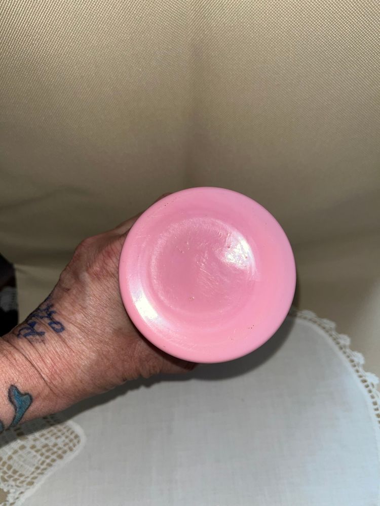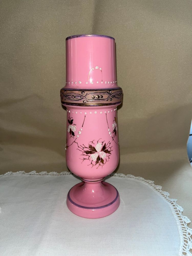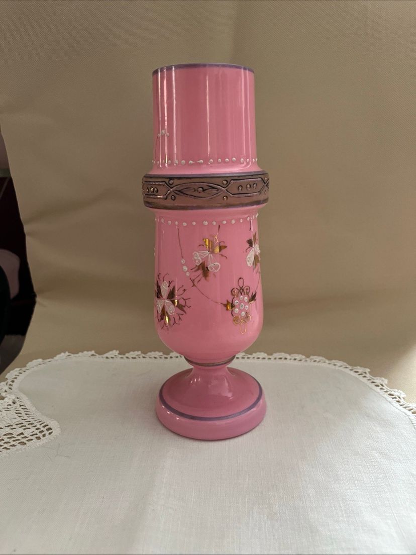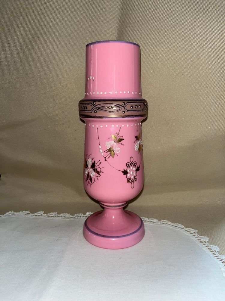 Beautiful Bohemian pink glass vase with enamel painting in excellent condition. No chips or cracks. 8 1/2” tall 3 1/2” wide.