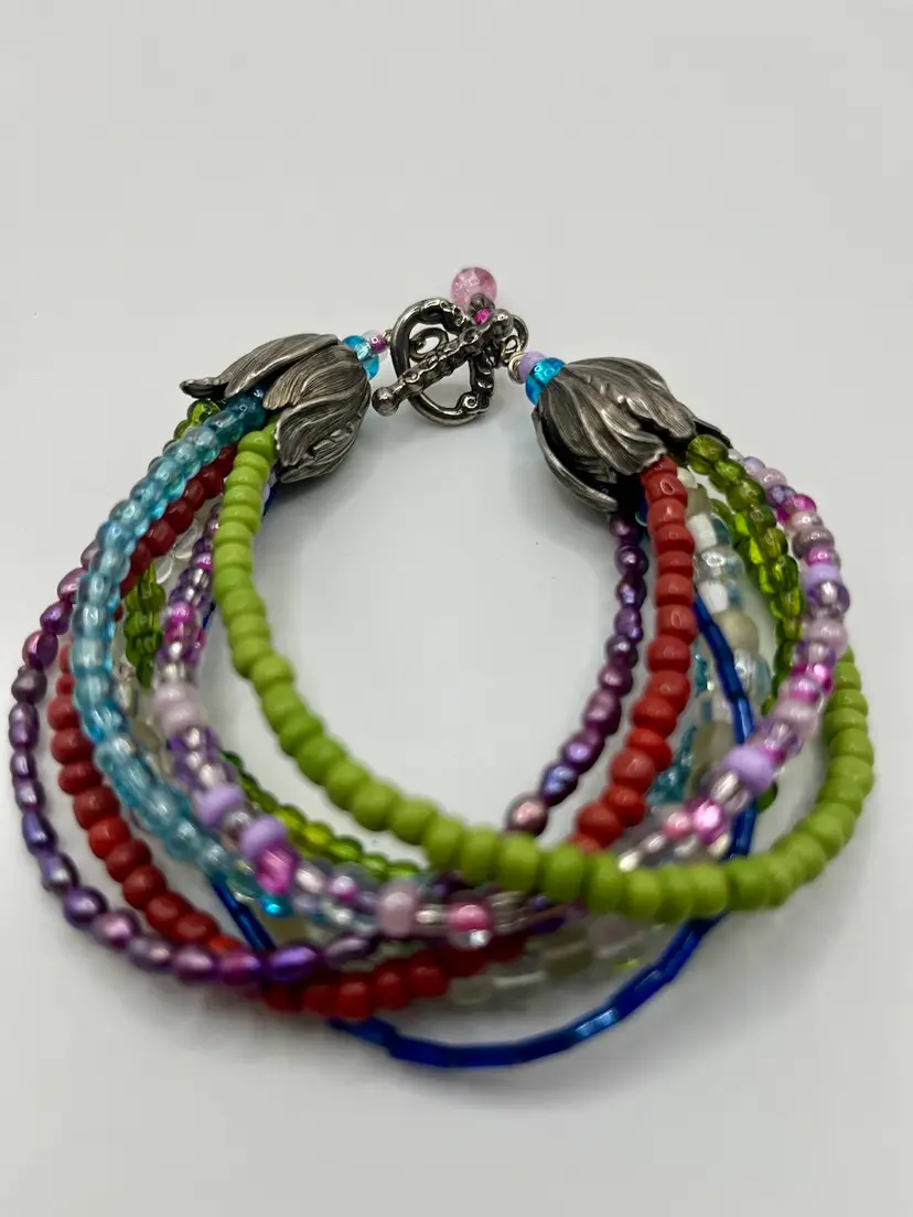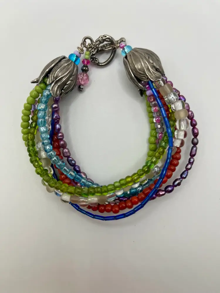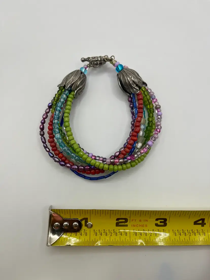 Vintage Boho Chunky Multi Strand Beaded Bracelet Cabbage Rose Ends Colorful. Silver Tone. No Condition Issue. 3”