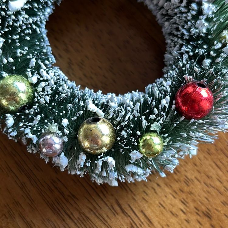 Vintage 4” Bottle Brush Wreath with mercury glass beads. In excellent condition.