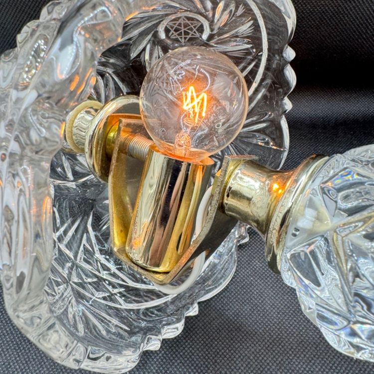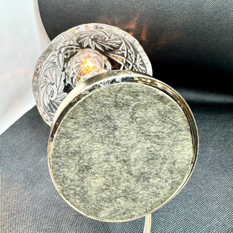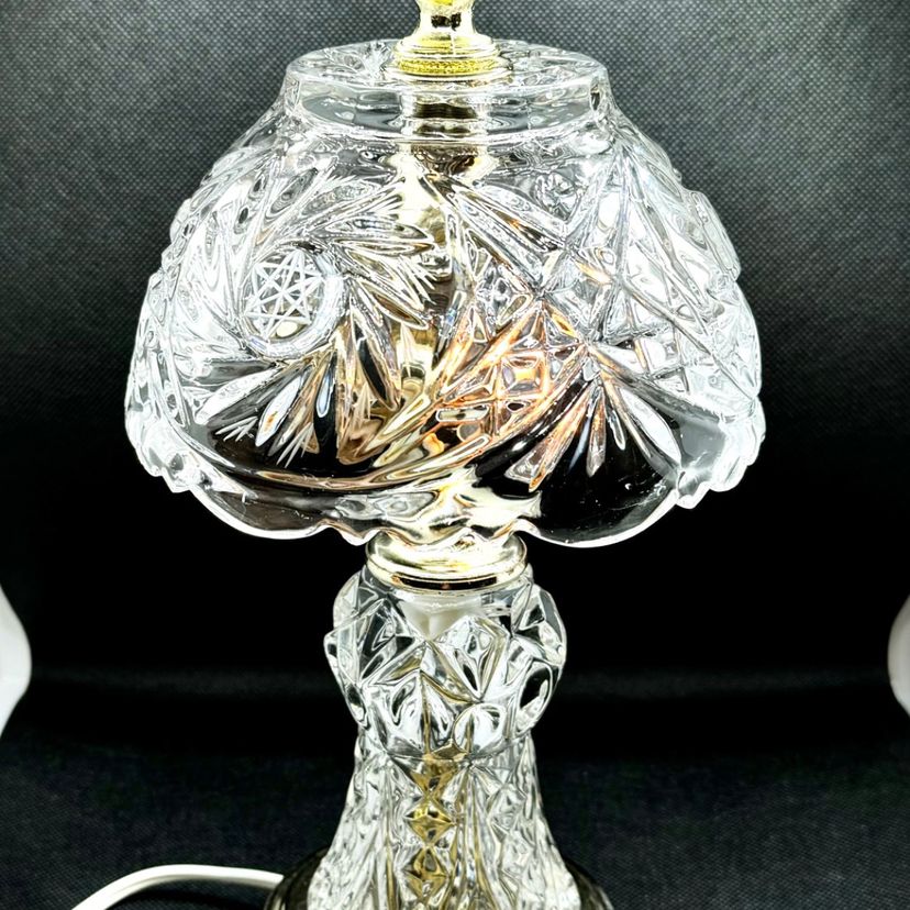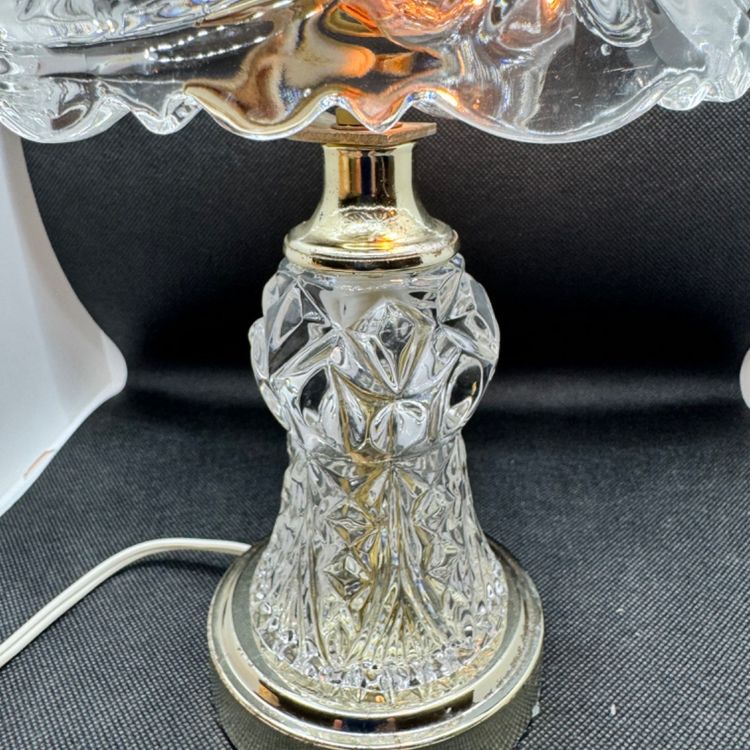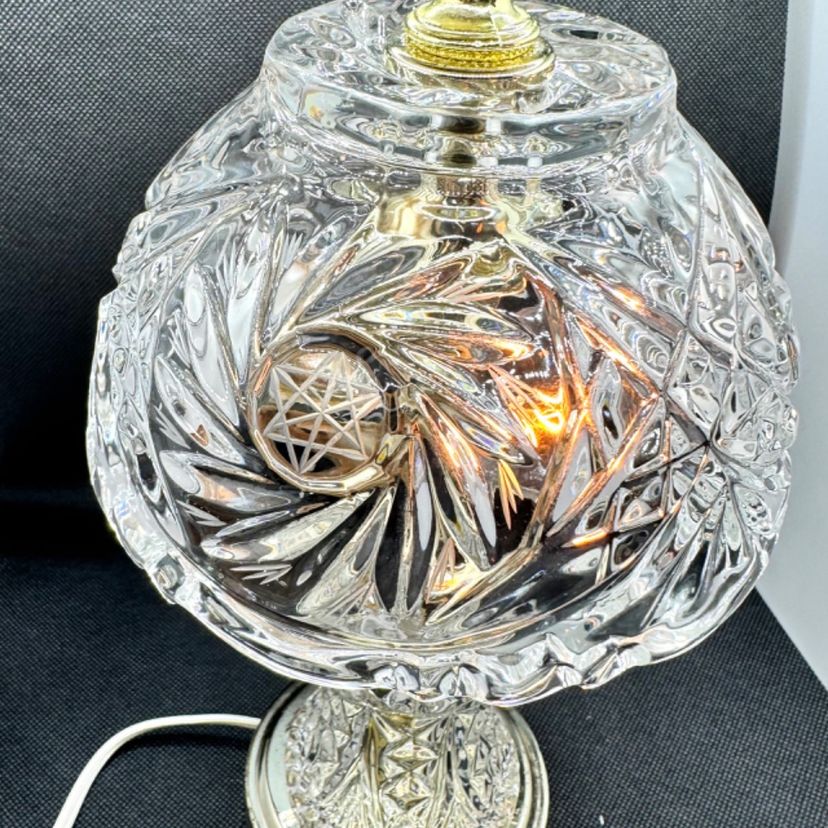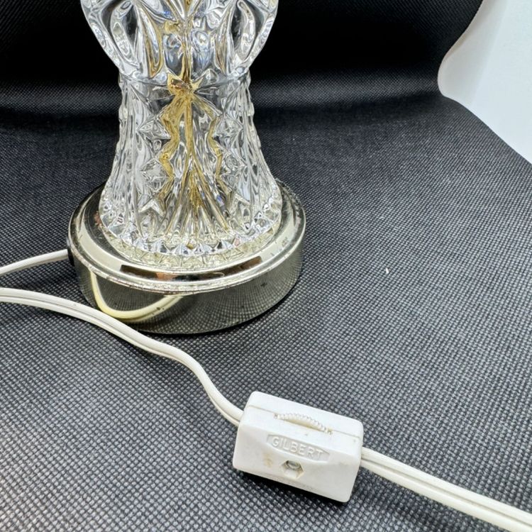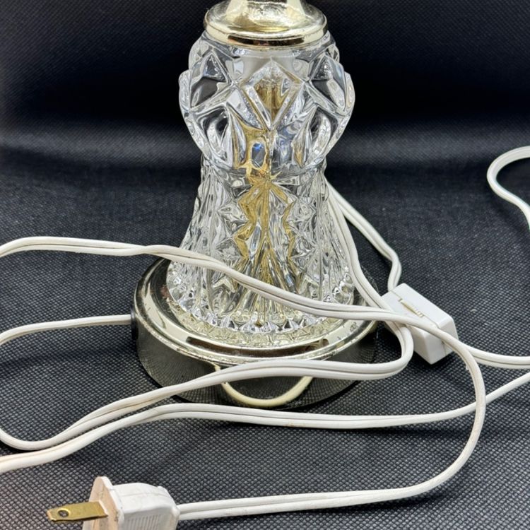 Vintage boudoir small table night light lamp handcrafted pinwheel cut crystal clear glass. Very beautiful and a night it’s amazing. No chips or cracks, metal base has a few rough spots. Measures 6x12.5x3.5. Weighs 3lb 8oz.