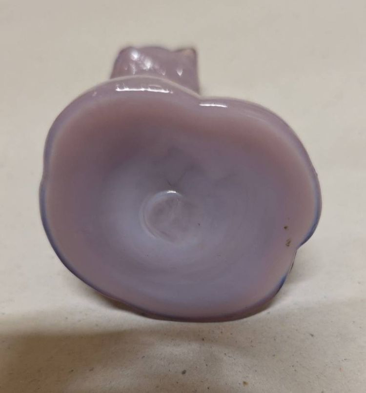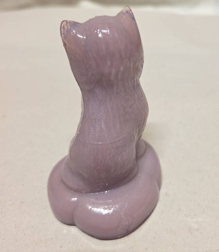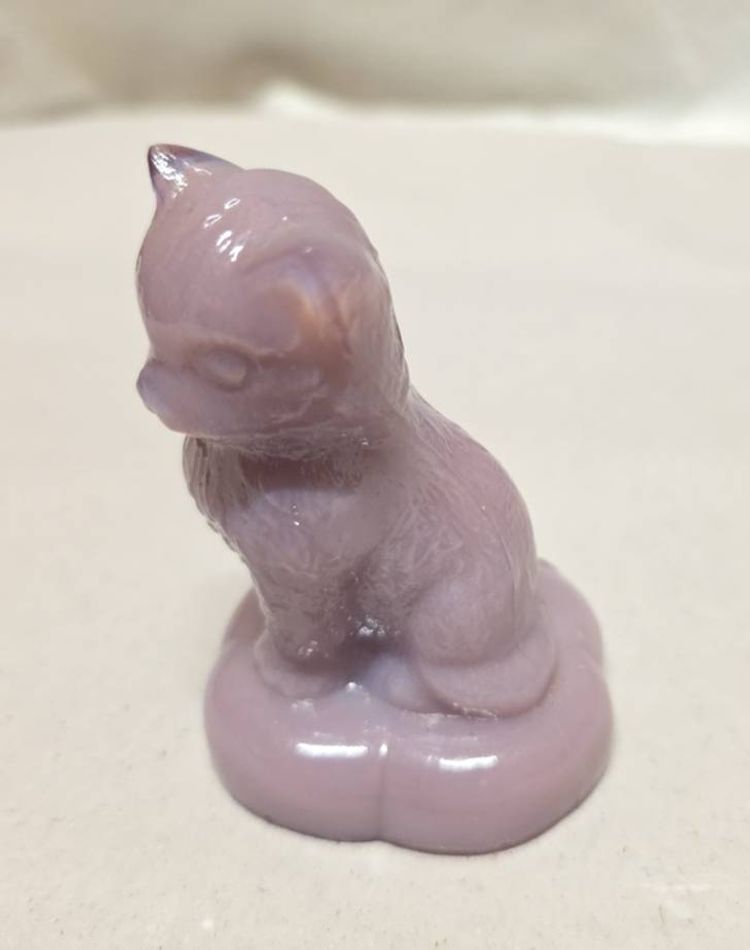 The product is a vintage Boyd's Art Glass kitten on a pillow, featuring a lavender slag purple Miss Cotton Cat design. This collectible figurine is made of glass and was manufactured in the United States. The brand, Boyd's Glass, is known for producing high-quality glass collectibles. This unique piece would make a charming addition to any cat lover's or glass lovers collection or as a decorative accent in a home.