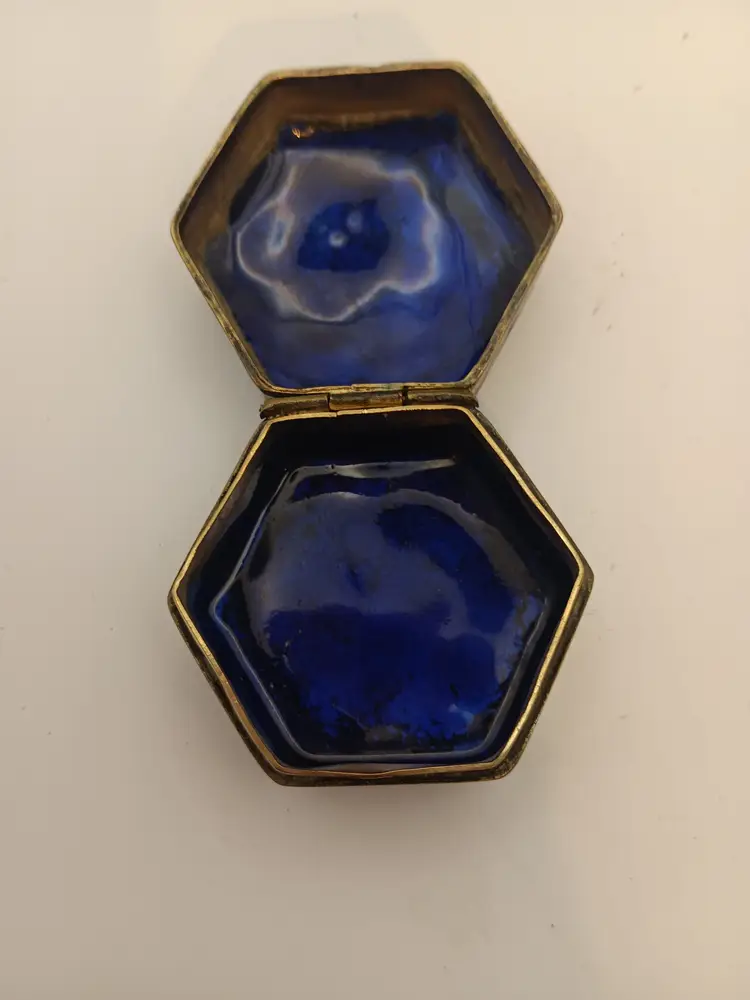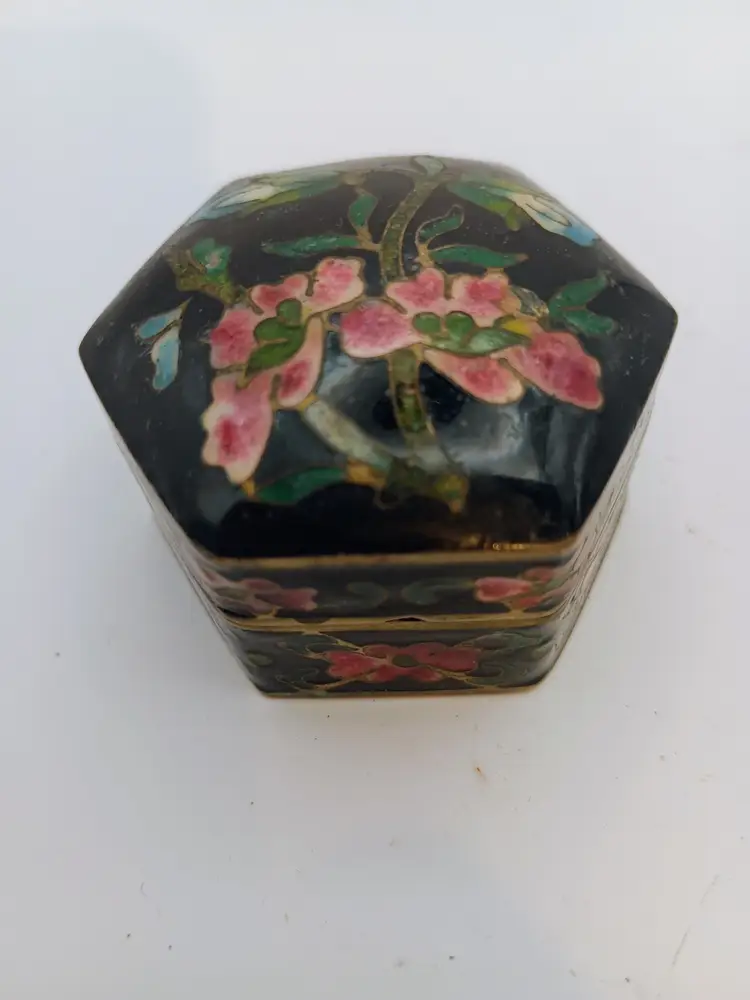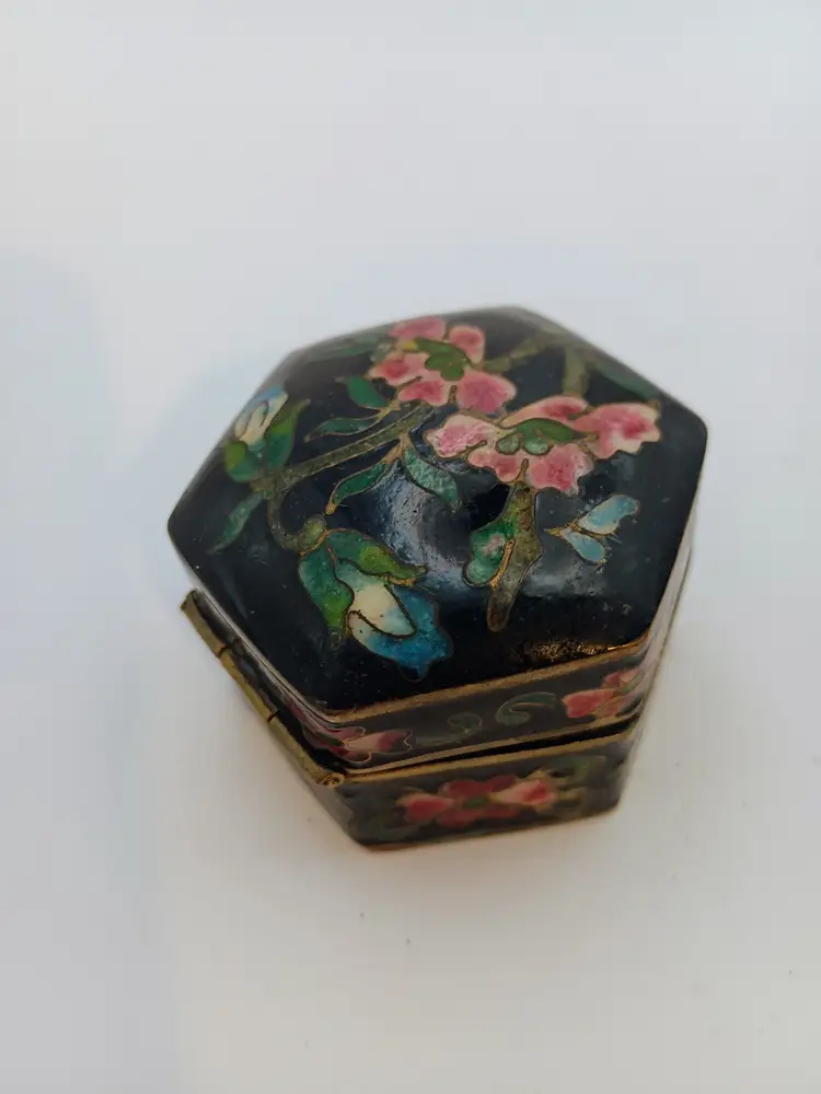 HI thanks for looking at this beautiful piece. You will receive one blue cloisonne trinket box. The lid has hinges. The trinket box is adorned with pink and blue flowers. This box is approximately 1 inch tall. One small bend in the front. In amazing vintage condition!
