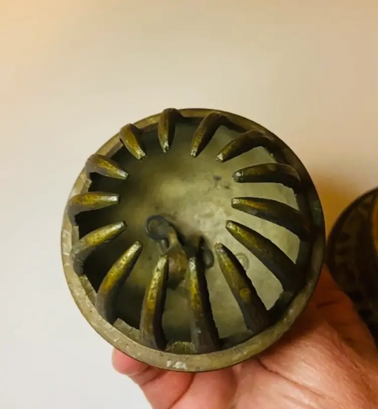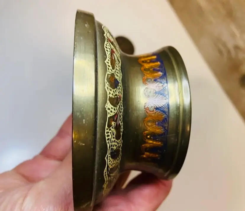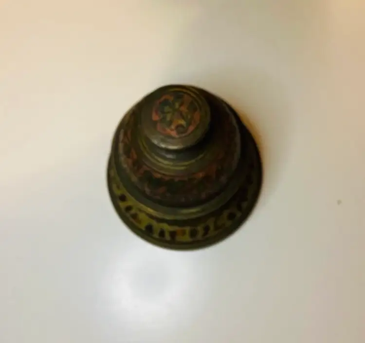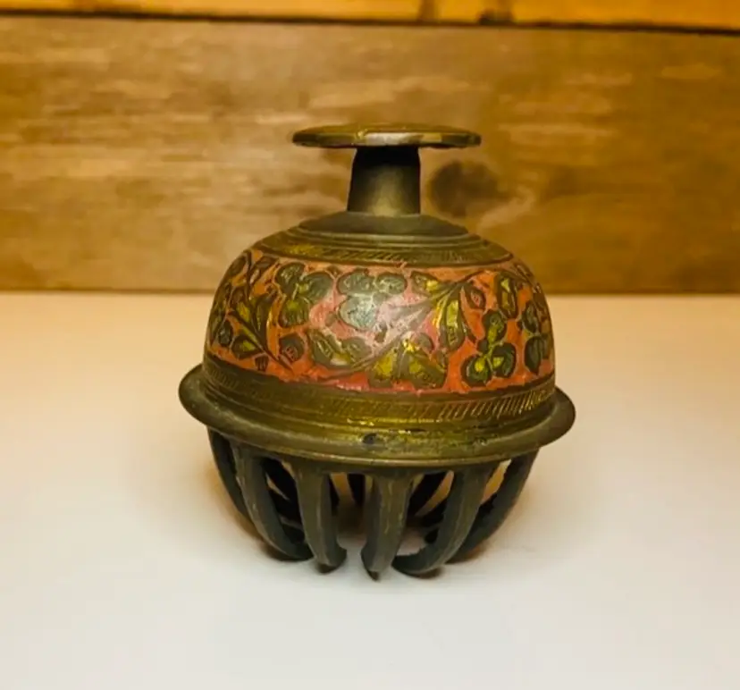 Vintage Brass Elephant Claw Bell with Matching Stand. Expertly crafted from solid brass, the bell features a beautifully detailed elephant claw design, capturing both artistry and timeless appeal. Has red and blue and white painted in the etching. In good used condition. Still has dinger.
