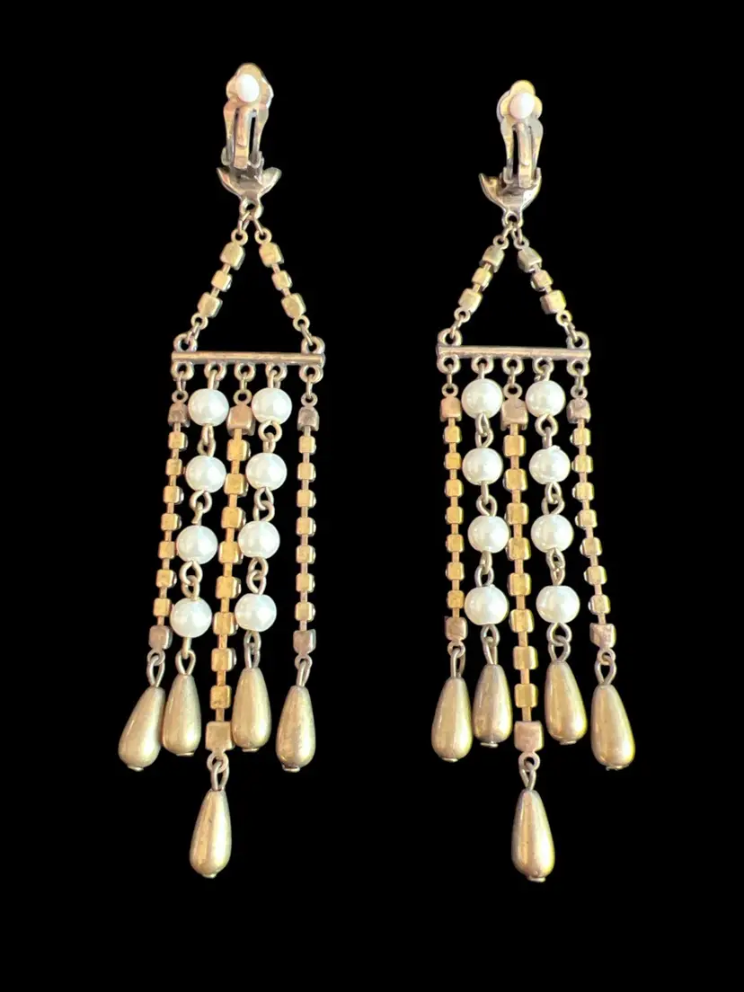 Vintage Brass Faux Pearl Dangle Cha Cha Clear Rhinestones Clip on Earrings #ofc-3