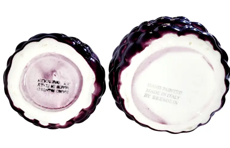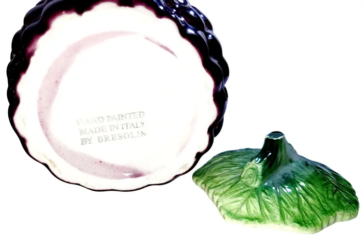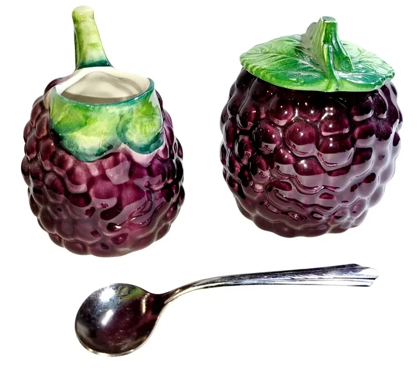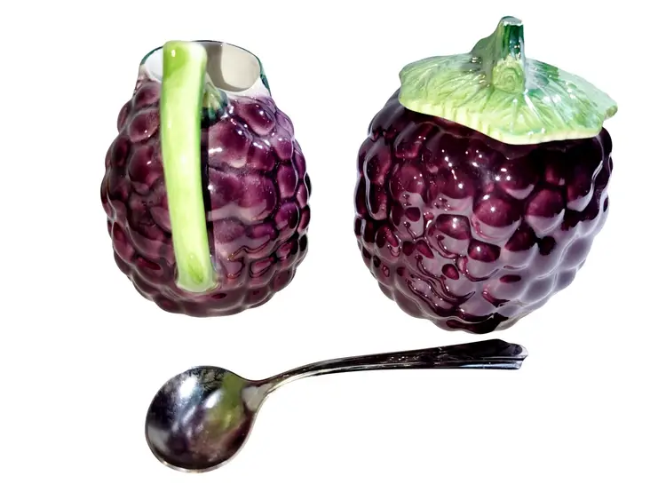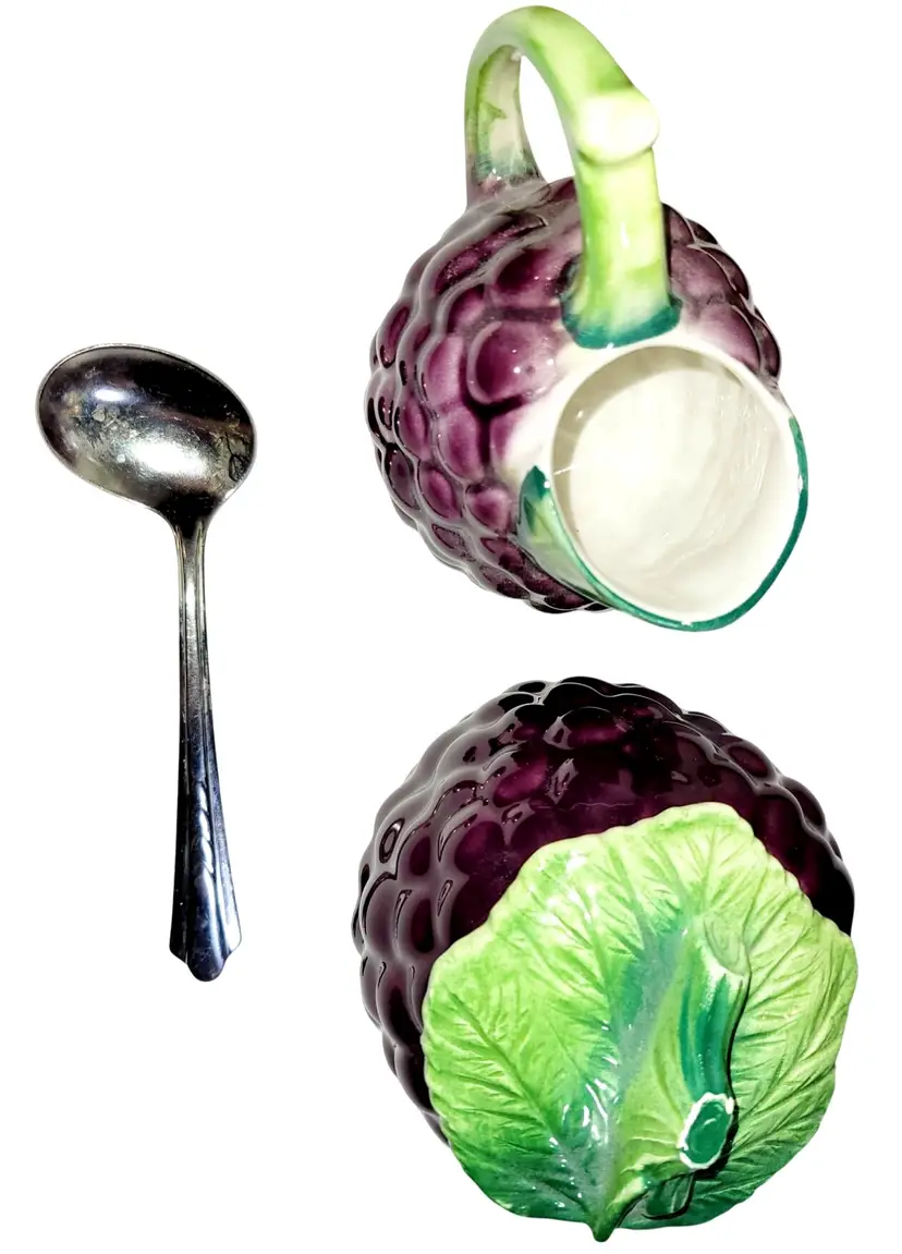 This vintage Bresolin hand-painted grape-themed creamer and sugar set showcases Italian craftsmanship. With rich detailing and complementary sugar spoon, it evokes timeless elegance.