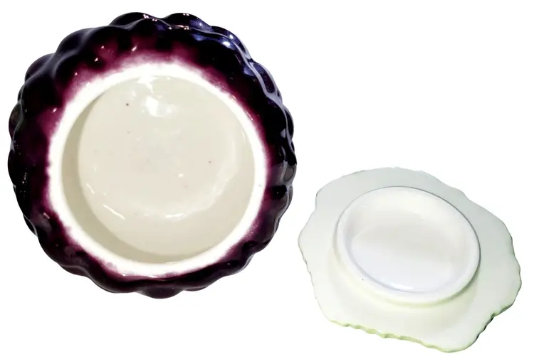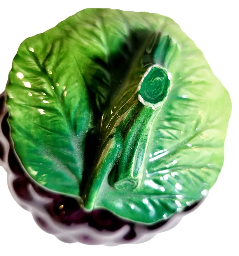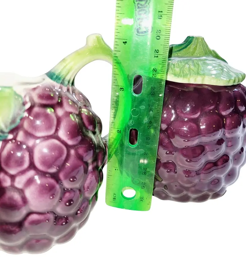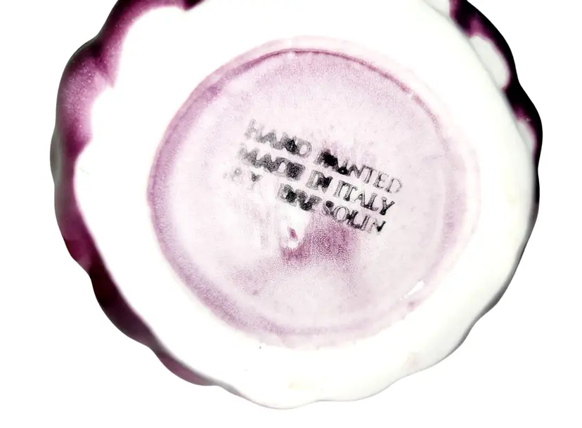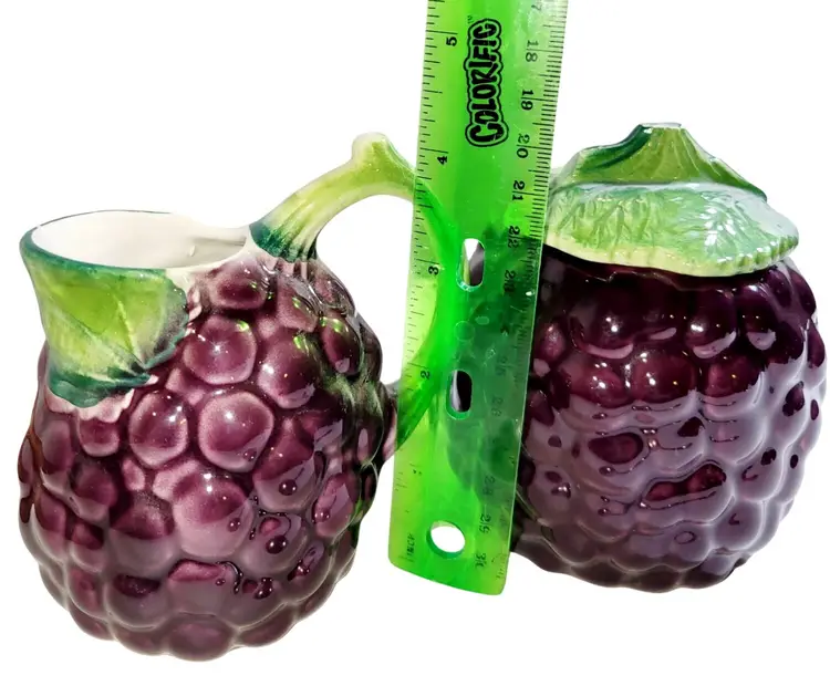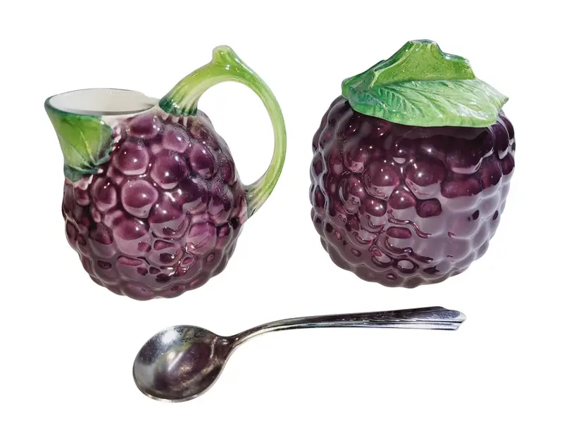 • Made from Italian Majolica ceramic • Hand-painted grape bunch design • Includes creamer, sugar with lid, and sugar spoon • Vibrant purple and green hues • Vintage collectible pieces