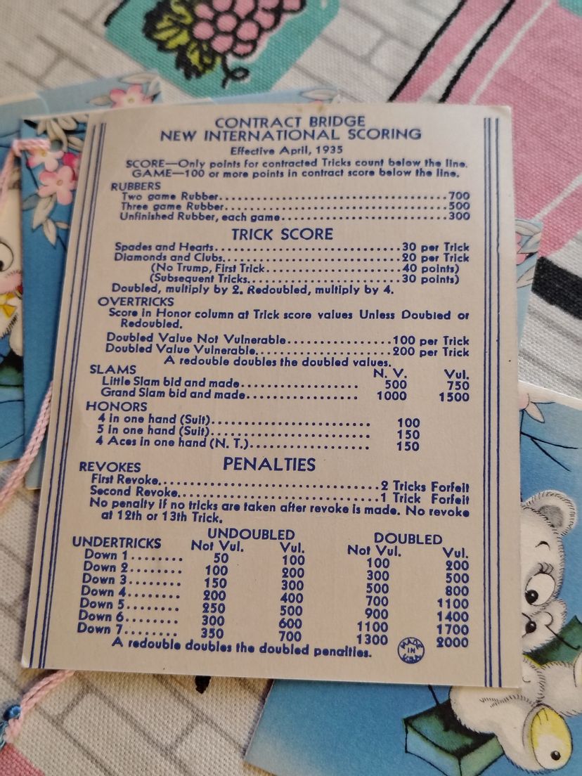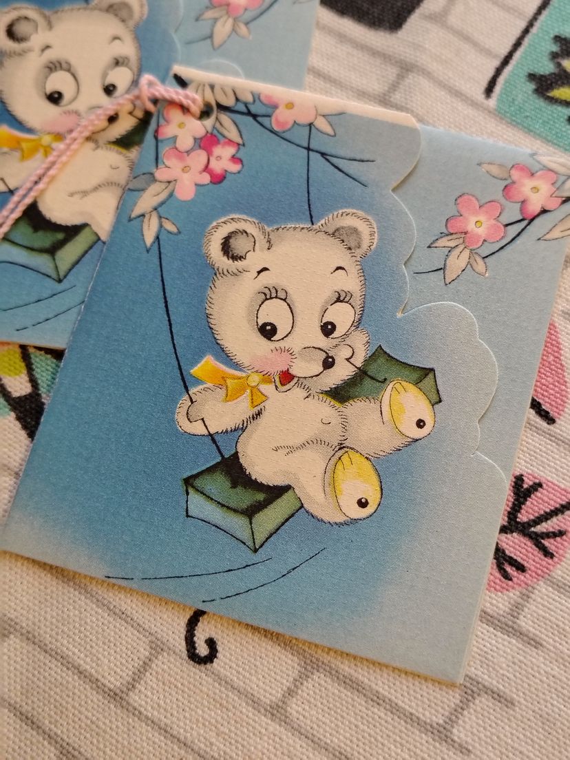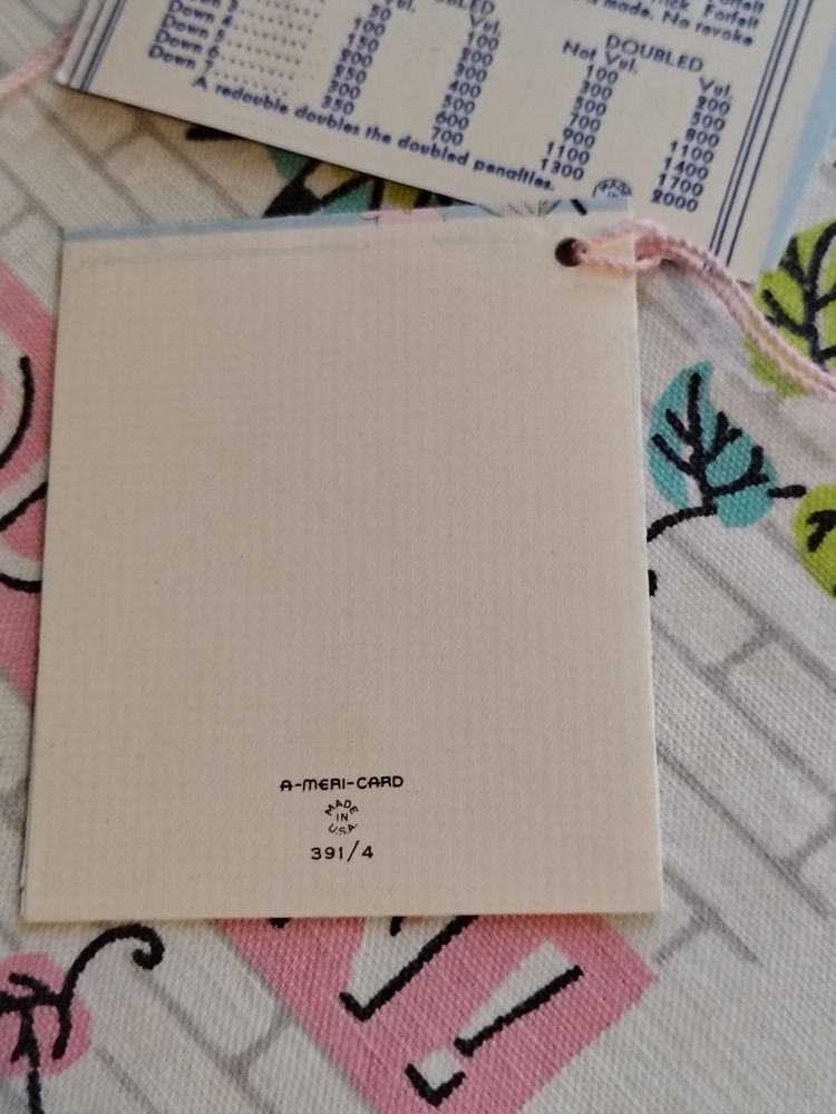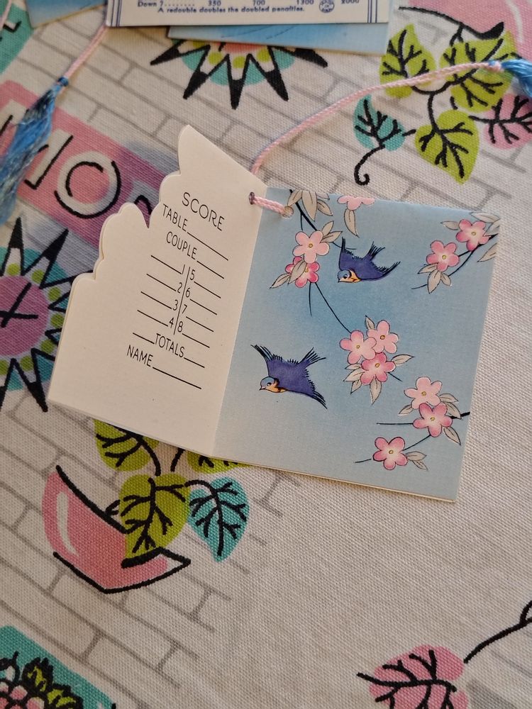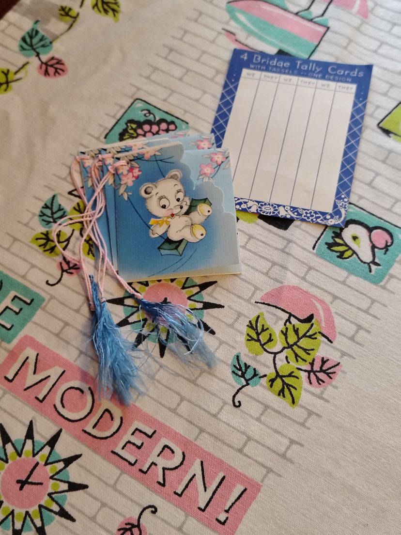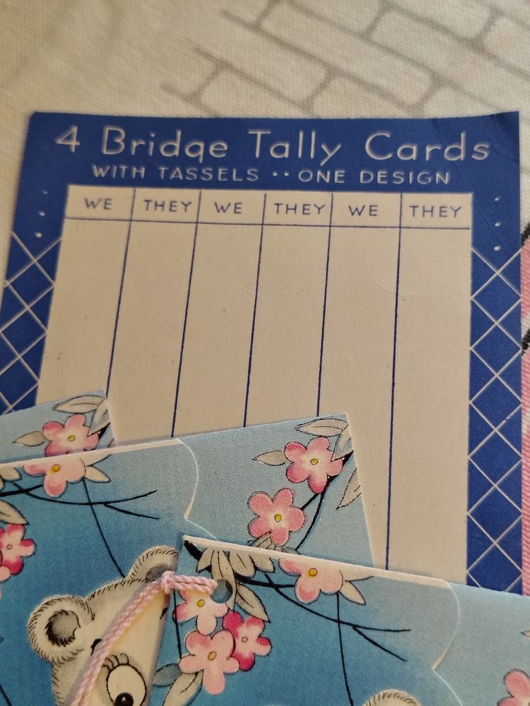 This is a set of bridge tally cards, decorated with a darling little bear! Made during the 1940s, by A-Meri-Card, this set of four tasseled tallies also comes with the score card, complete with the rules on the back, so you and your friends are all ready for a game. A very cute game at that! Condition: This set is in Excellent shape! The tallies and the scorecard are all unused, and those long tassels all seem to be completely intact. No weird stains or smells either, just cute little bears swinging away! Included but not pictured is their original wrapper - It's just some brown waxy paper, but it protected them so well for all this time! Size: Each tally measures 2½" x 3", and the cord and tassel are about 5" long.