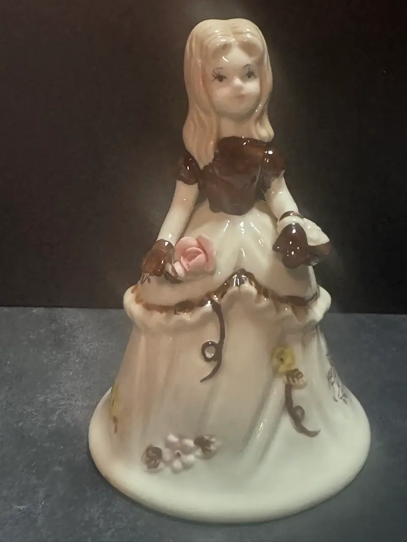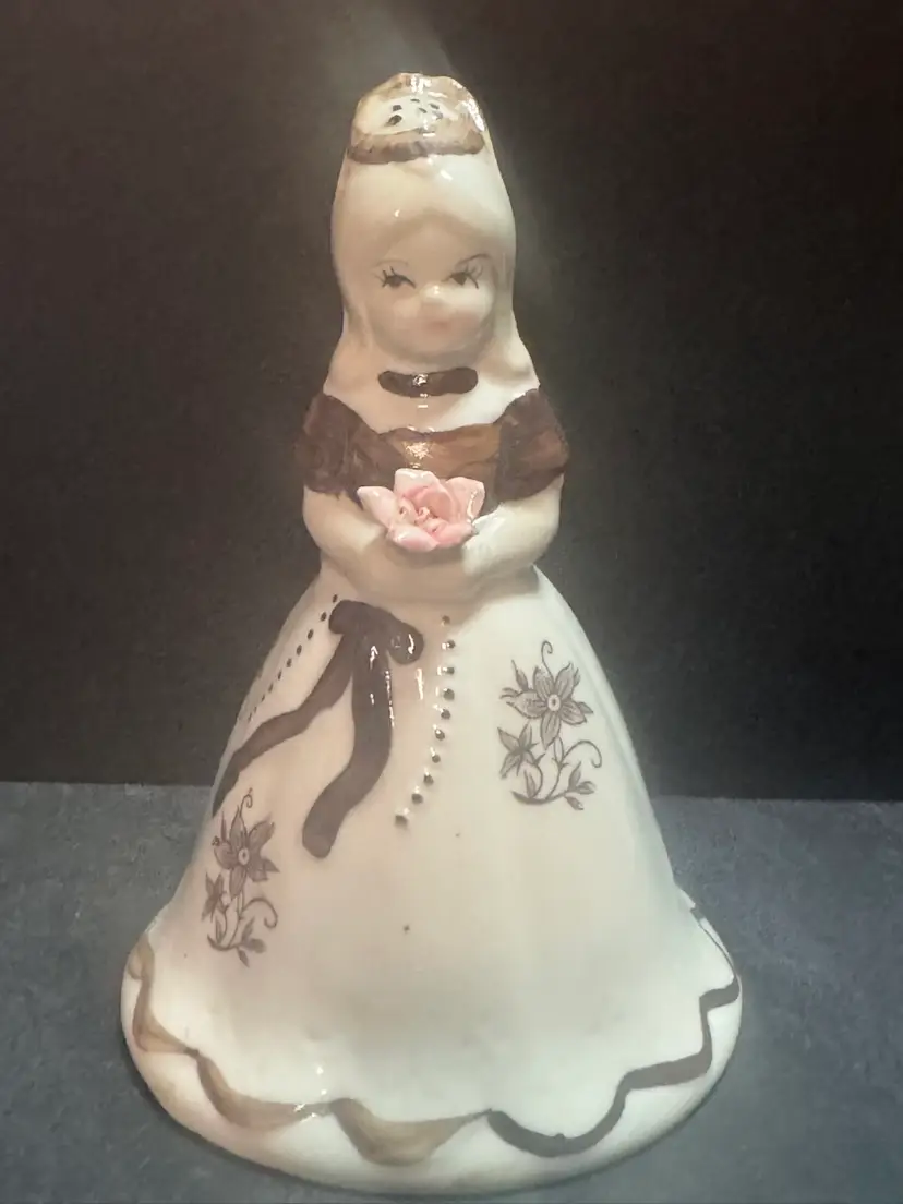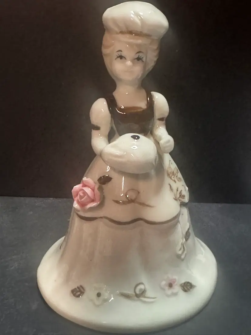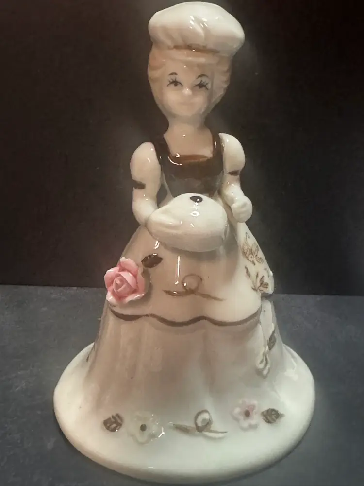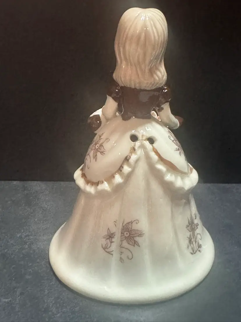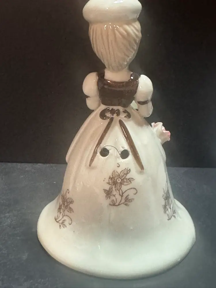 This is a vintage Brinn & Co. Victorian-style ceramic bell figurine of a girl holding a pink flower. It is made of glazed porcelain and features hand-painted details. The dress is primarily white or cream with brown accents, including floral and ribbon designs. It functions as both a decorative figurine and a working hand bell. No chips or cracks. Like new condition.