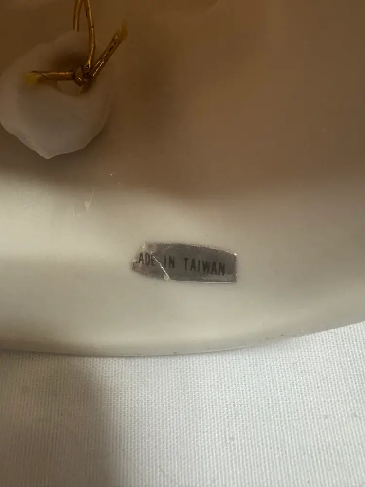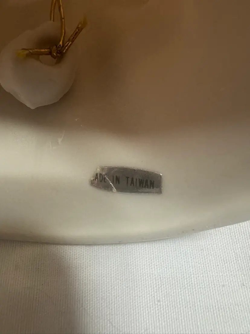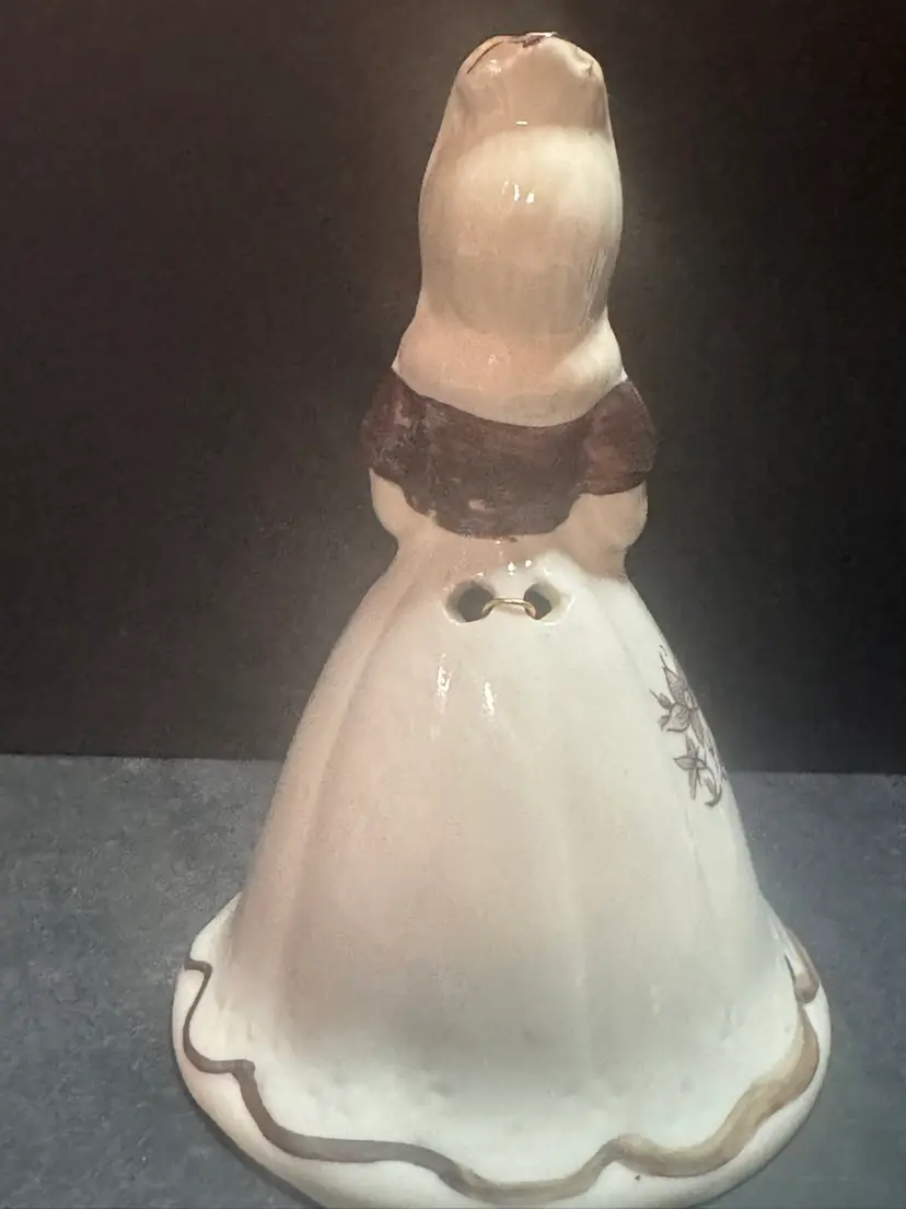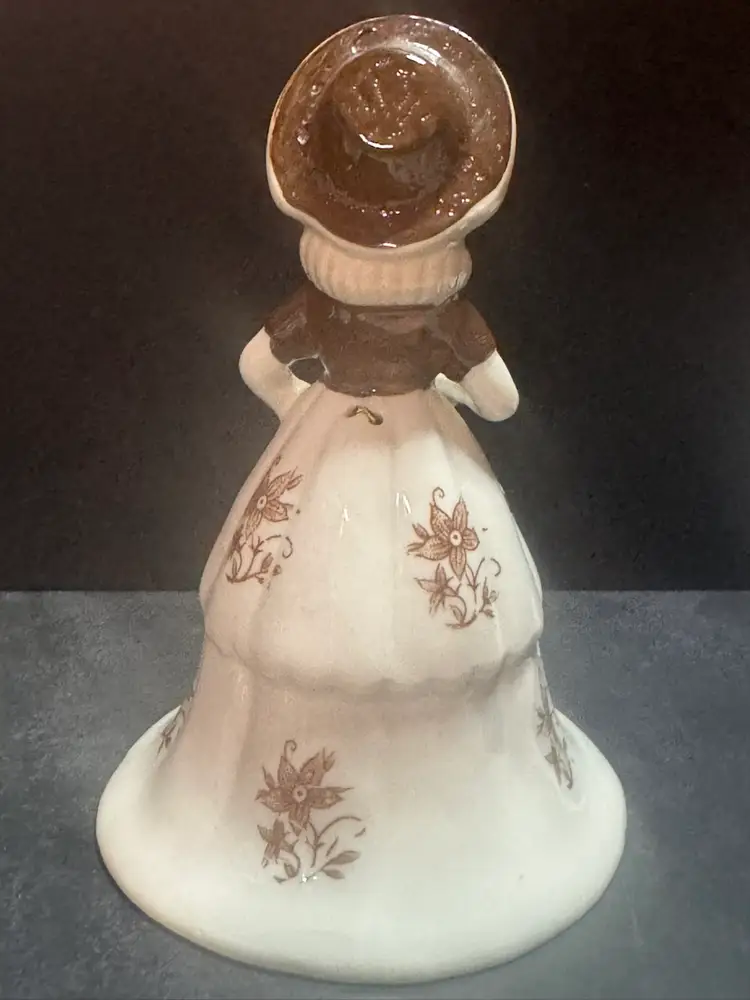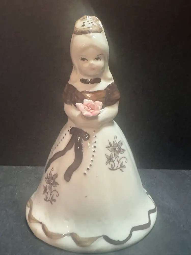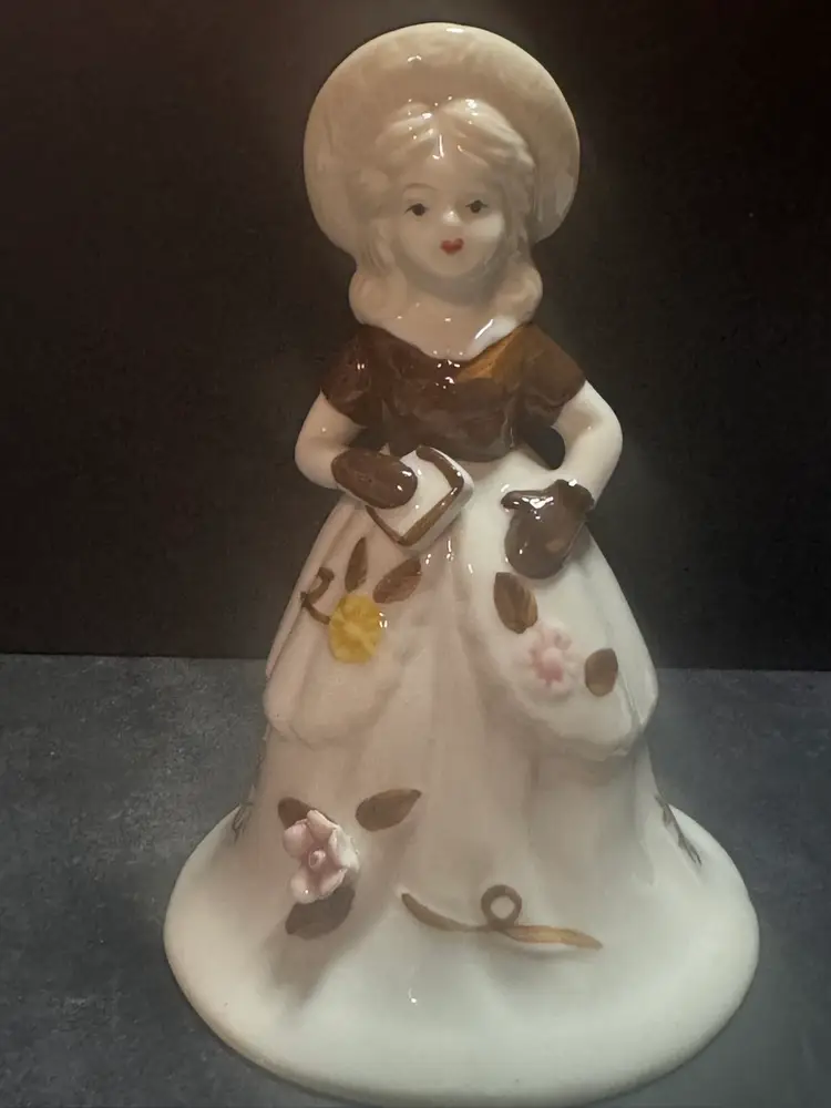 This is a vintage Brinn & Co. Victorian-style ceramic bell figurine of a girl holding a pink flower. It is made of glazed porcelain and features hand-painted details. The dress is primarily white or cream with brown accents, including floral and ribbon designs. It functions as both a decorative figurine and a working hand bell. No chips or cracks. Like new condition.