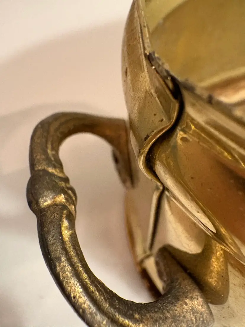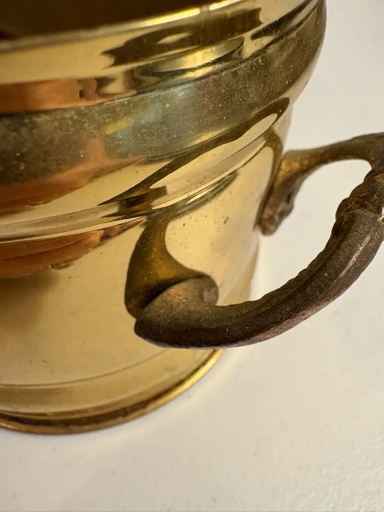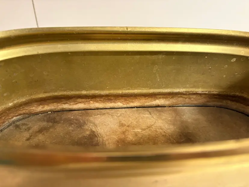 These planters were made in Bristol, Tennessee, often with a lacquered finish to resist tarnish. They are considered vintage items, with many dating back to the mid-century modern period or the 1970s and 80s. Measurements are 13 inches long, 5inches wide, and 3 3/4 inches high.