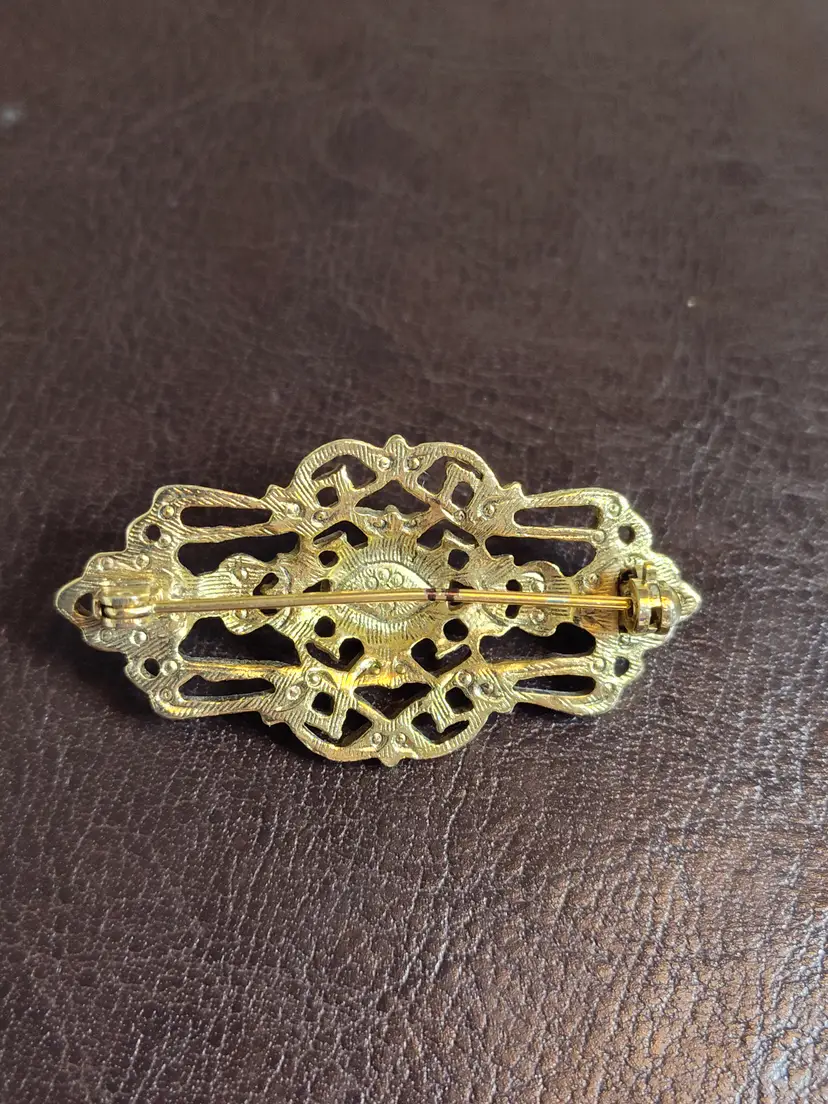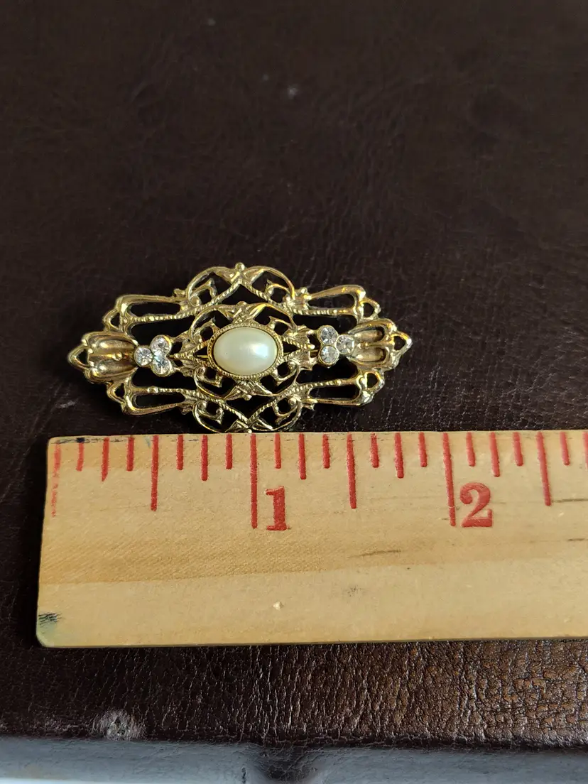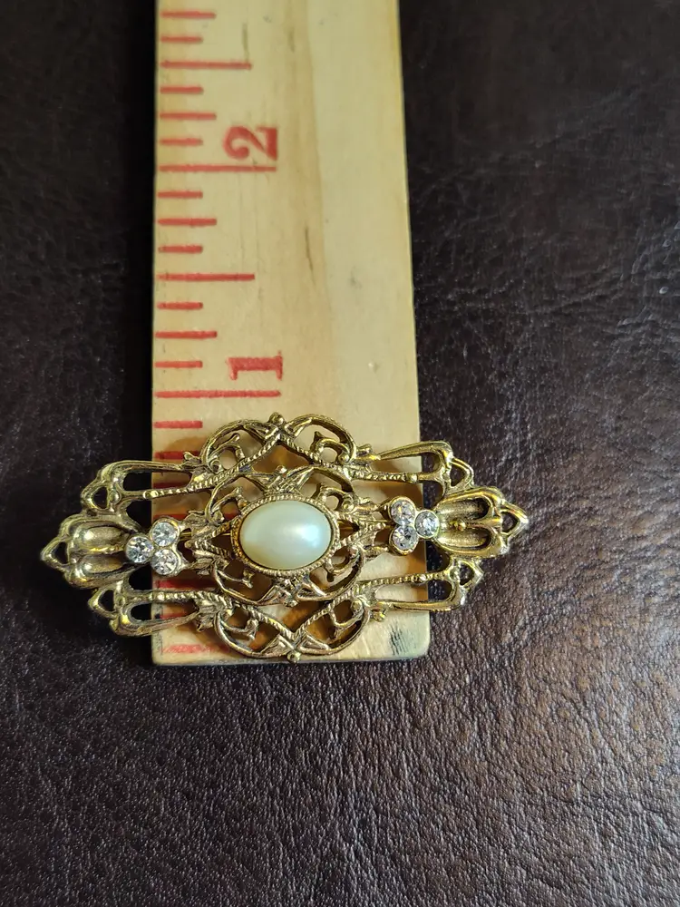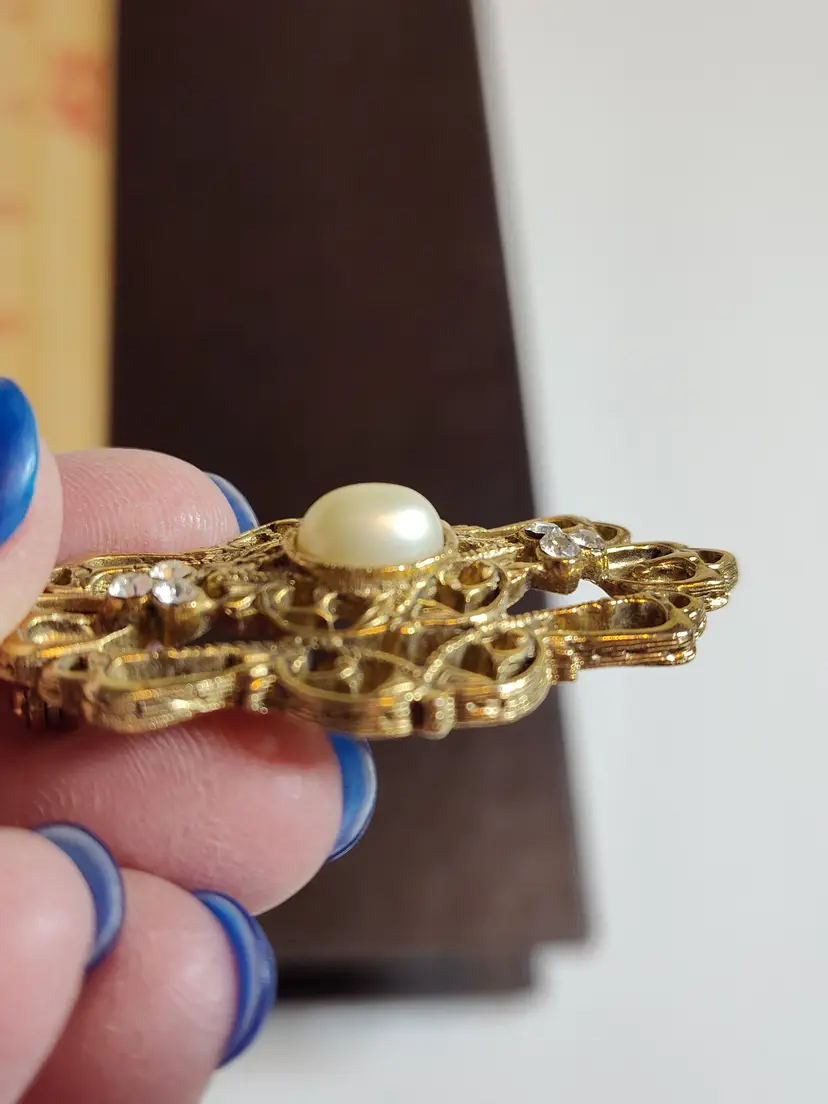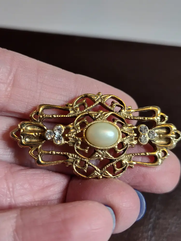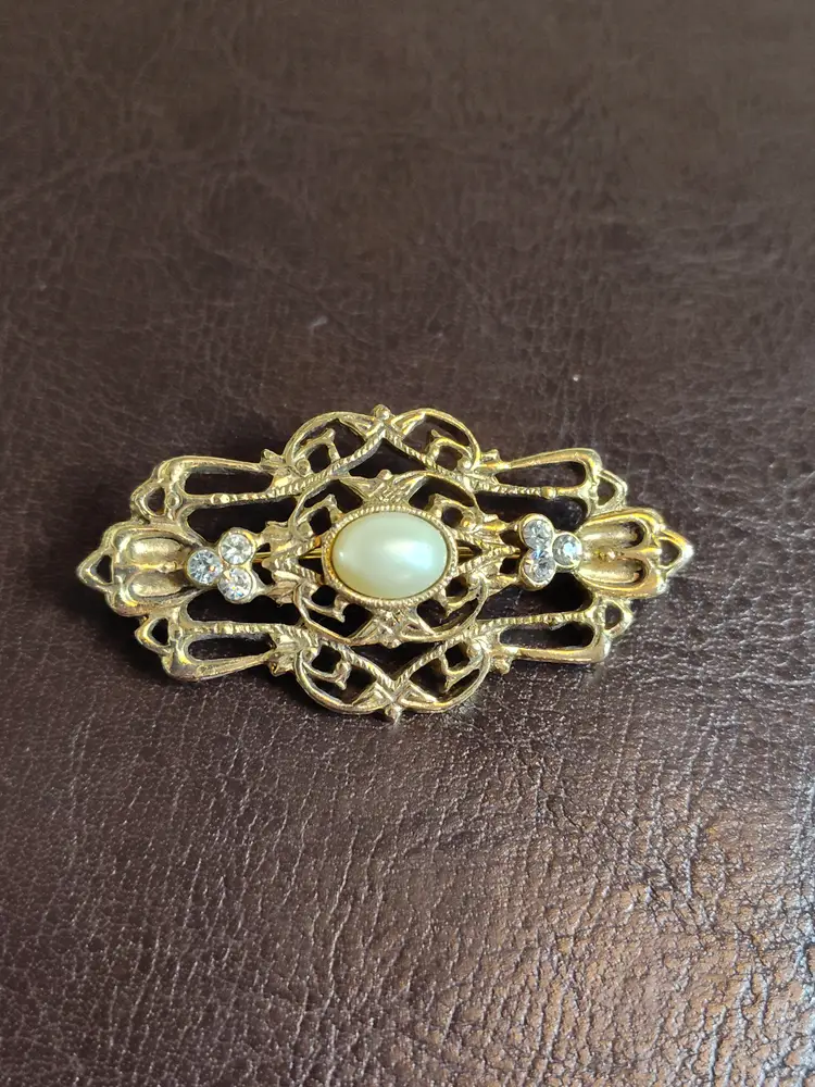 Gold tone filagree brooch with rhinestone accents & faux cabashon pearl center.