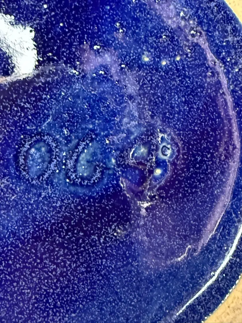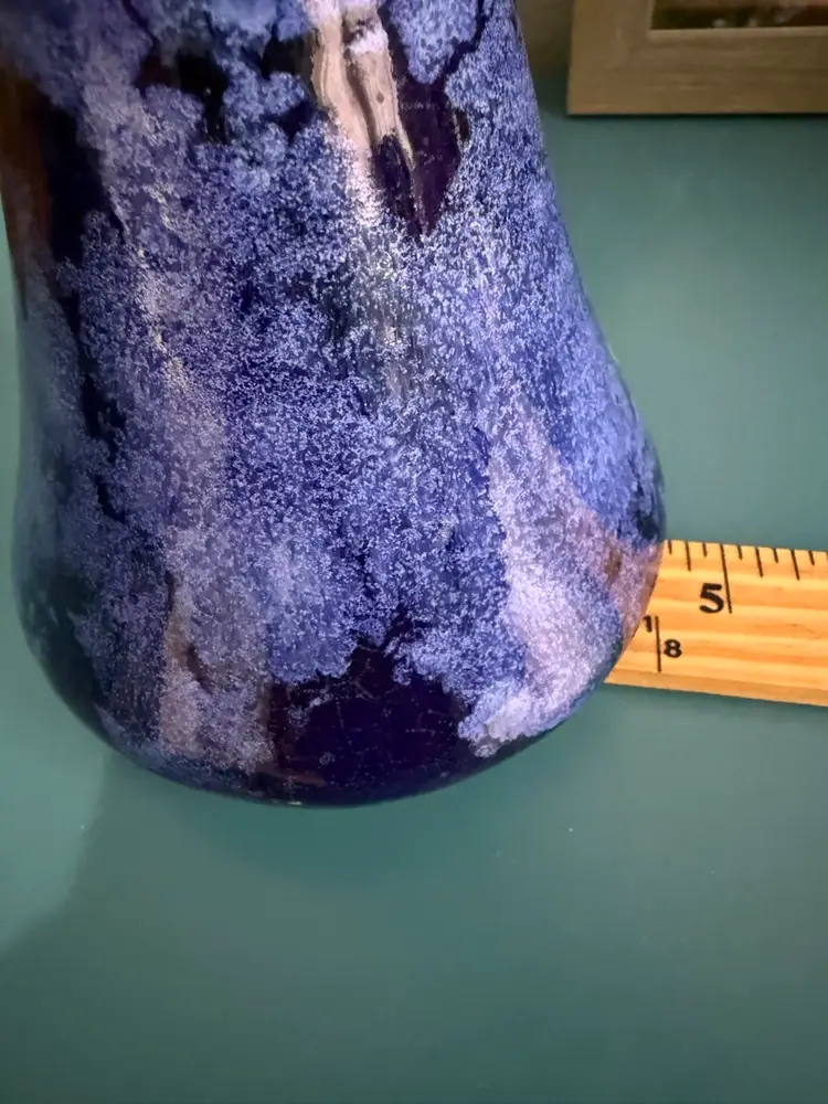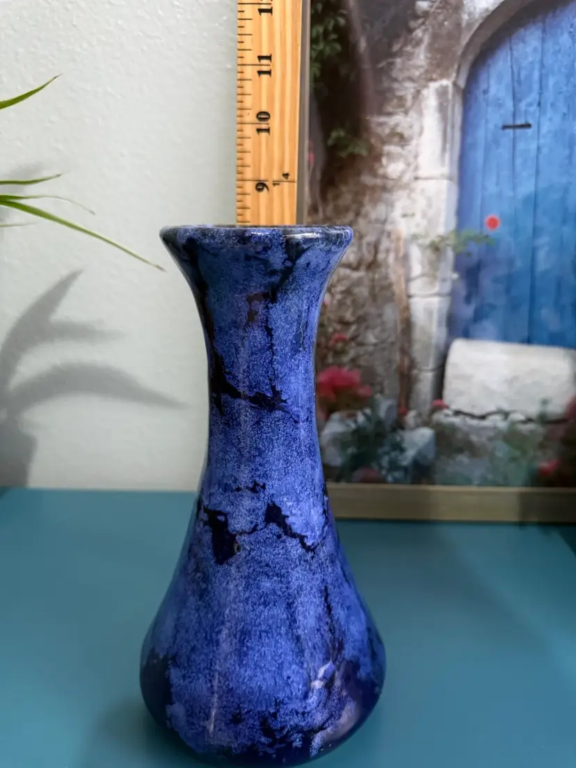 Brush McCoy (also known as Brush Pottery or Brush-McCoy Pottery Co.) Blue Onyx, which is characterized by a heavy or mottled blue glaze over a deeper cobalt or black background. The drip or flow effect is a signature of this line. These vases were typically produced circa the 1920s–1930s.