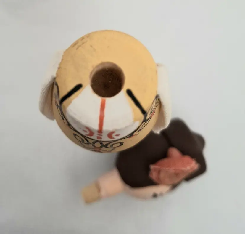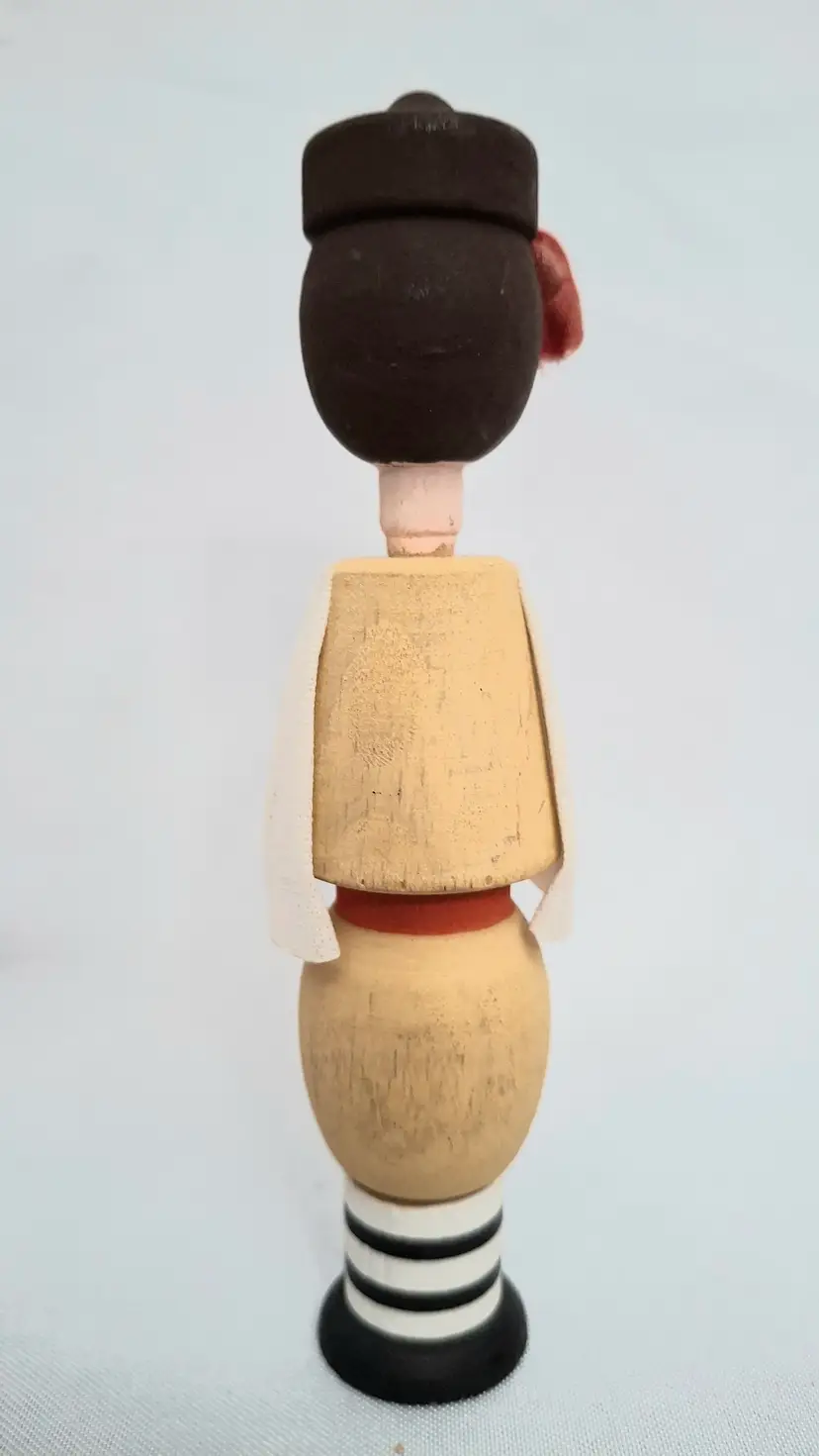 Vintage Bulgarian Wooden Doll Perfume Bottle – Natural Rose Perfume Container This charming hand-painted wooden doll is a beautifully crafted Bulgarian perfume bottle, standing 4¾ inches tall and in excellent condition. Made from natural wood and detailed with folk-inspired designs, she conceals a delightful secret — her head lifts off to reveal a wood dauber, and a glass perfume vial fits neatly through the bottom, but it is missing. Originally designed to hold 100% natural Bulgarian rose perfume, this piece combines artistry with functionality. A delicate fabric flower in her hair adds a lovely finishing touch, making her both a collectible display piece and a functional keepsake. A wonderful addition to any vintage perfume bottle collection, or a thoughtful gift for lovers of folk art and handcrafted European treasures.