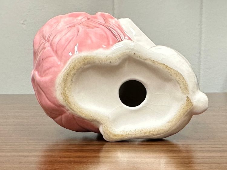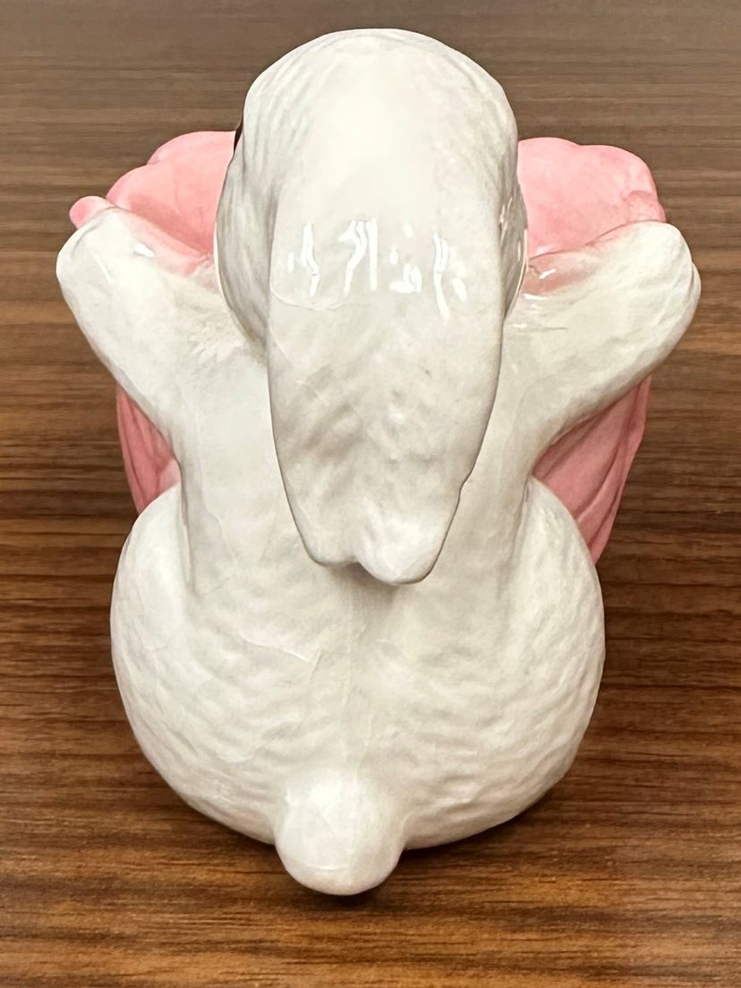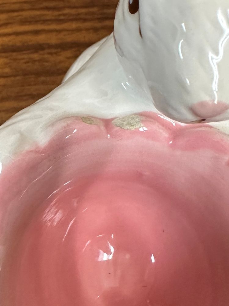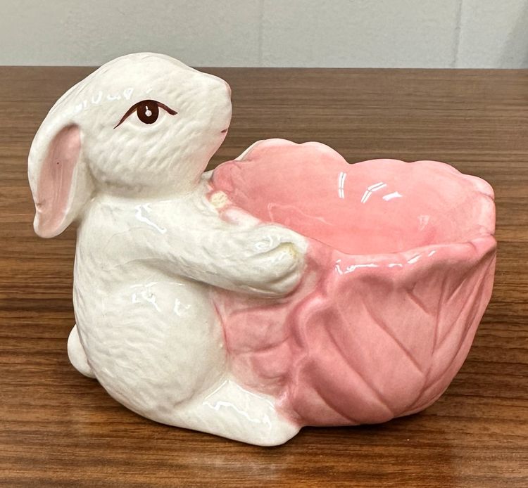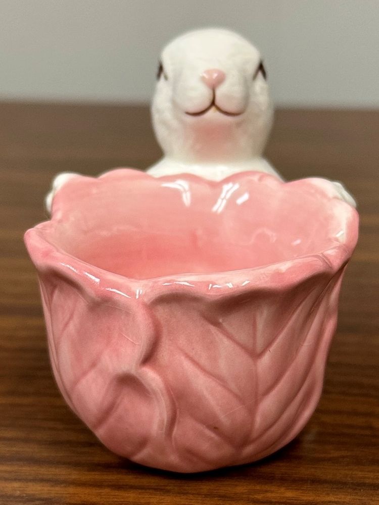 Beautifully colored pink & white vintage bunny rabbit egg holder or shallow vase. One small chip on top of bowl, as noted in photos and one small flea bite on left "paw" as shown. Rabbit is approx. 2 3/4" tall. Approx. 3 1/2" wide at widest point overall. Additional information and/or photos available upon request.