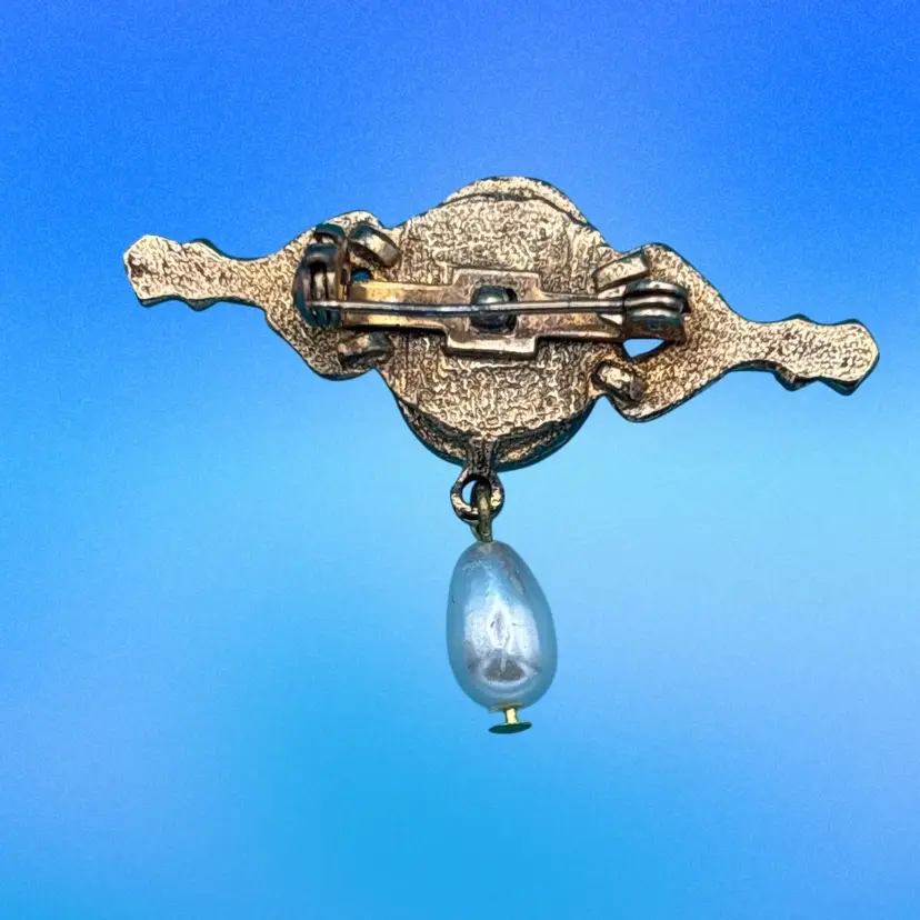 This piece reflects the Victorian Revival style popular in mid-to-late 20th-century costume jewelry.