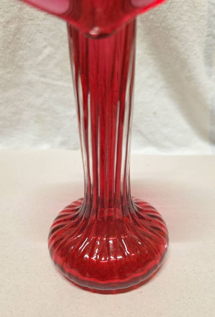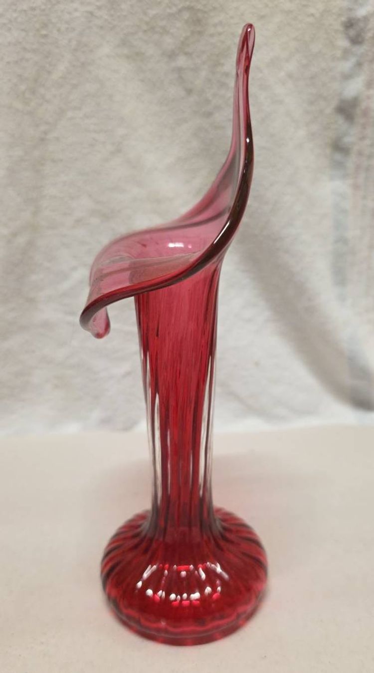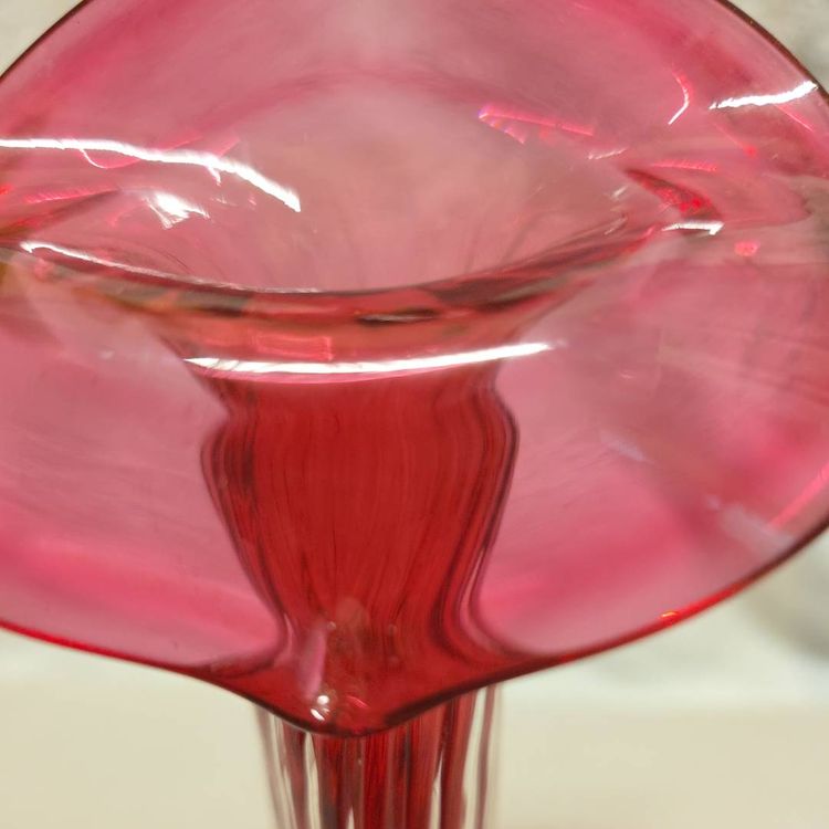 This Vintage Art Glass Cranberry Jack-in-the-Pulpit Vase from Canada is a unique and decorative piece that showcases traditional craftsmanship and a cranberry red color. Handmade in Canada in the mid-20th century, this vase features a solid pattern and a glossy finish, adding a touch of elegance to any room. Standing at 9 inches tall and unmarked with a brand, this hand-blown glass vase is perfect for displaying flowers or simply as a striking decorative piece.