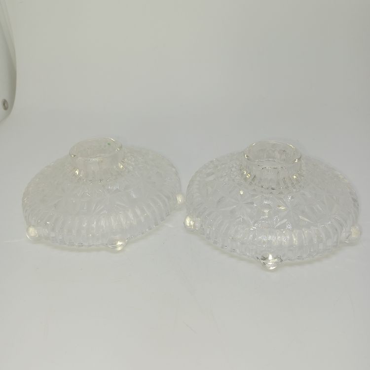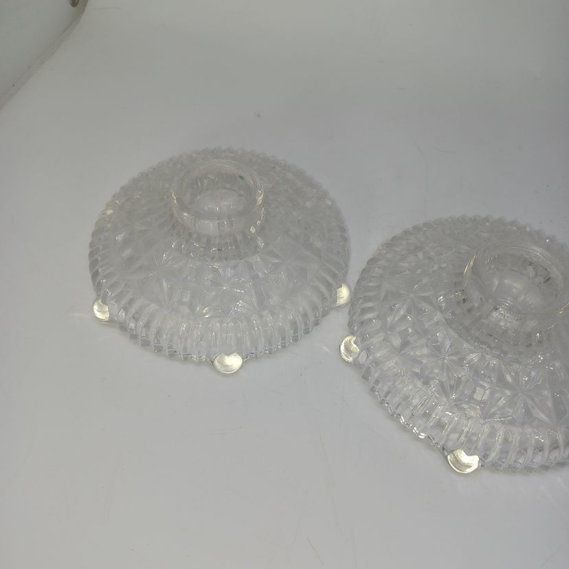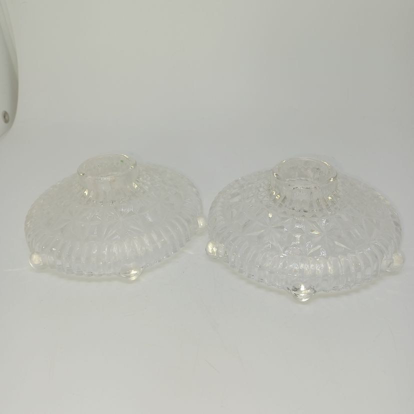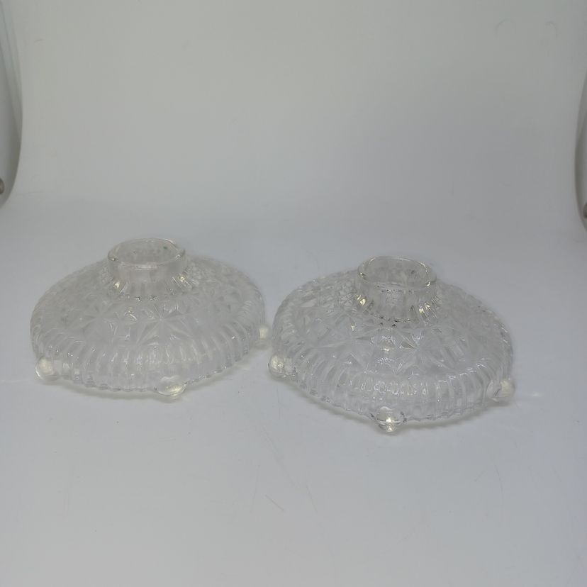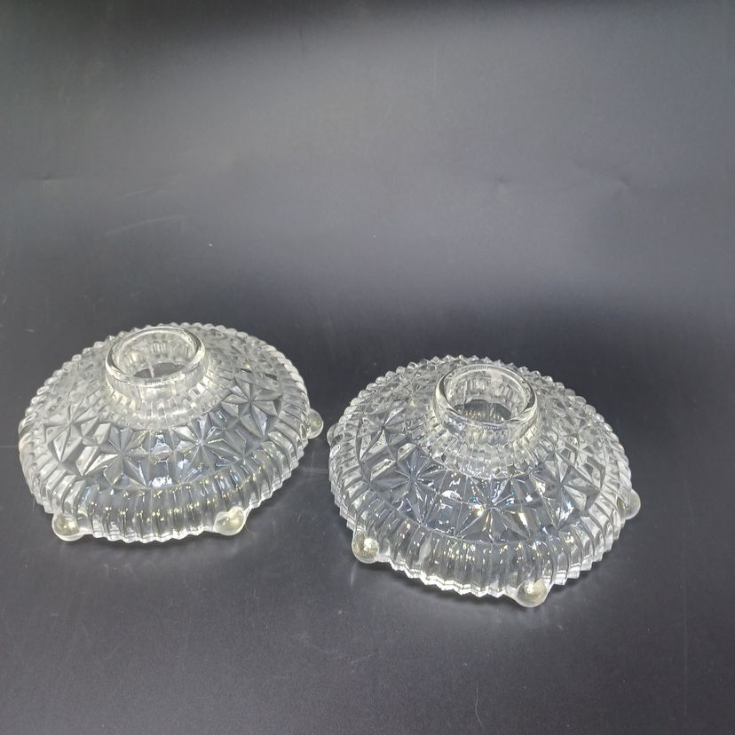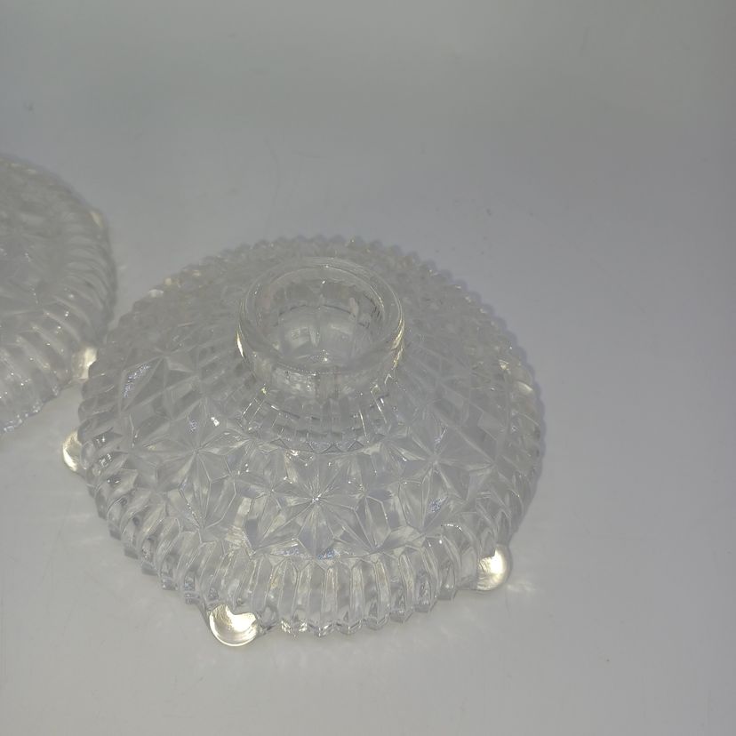This is a pair of pressed glass Stars And Bars pattern candle holders made by Anchor Hocking, USA in the 1950s. The pattern was made from 1924-1965, and is pattern #1000.