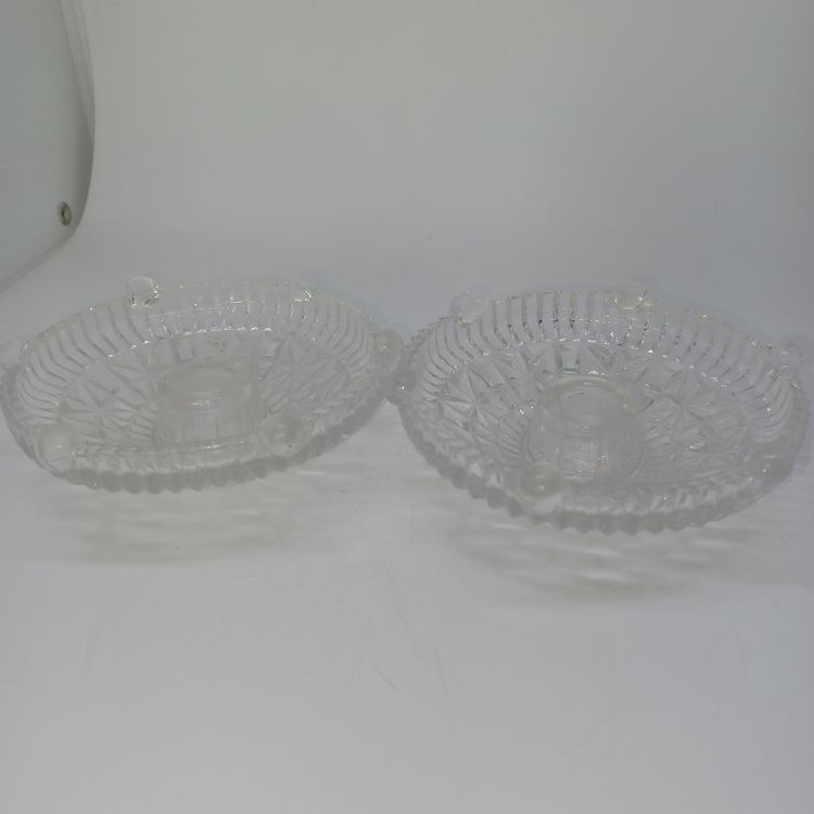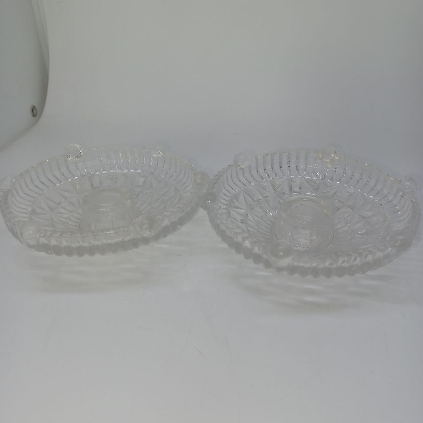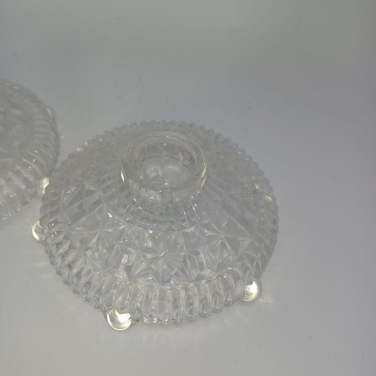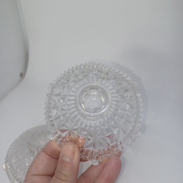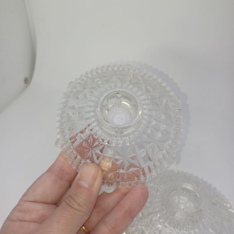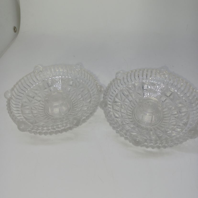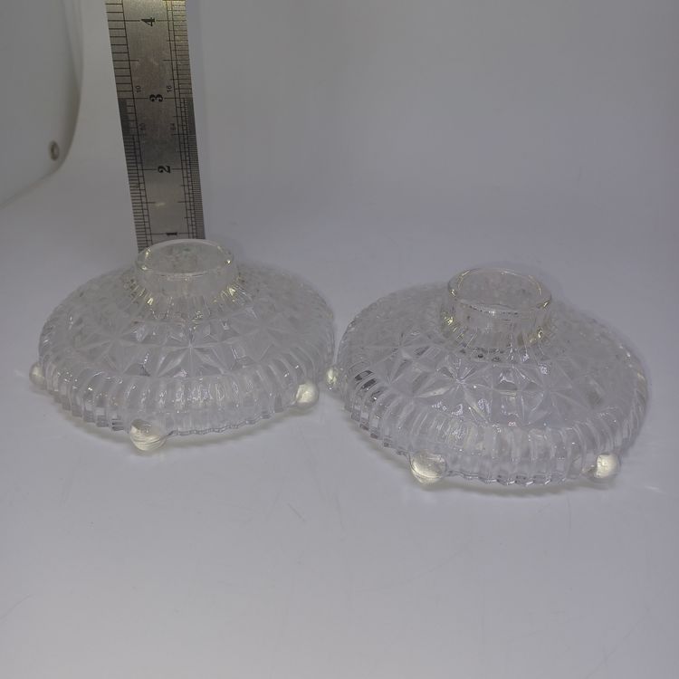 This is a pair of pressed glass Stars And Bars pattern candle holders made by Anchor Hocking, USA in the 1950s. The pattern was made from 1924-1965, and is pattern #1000.
