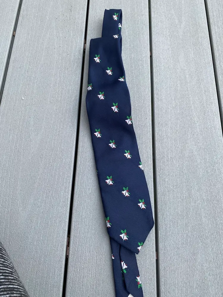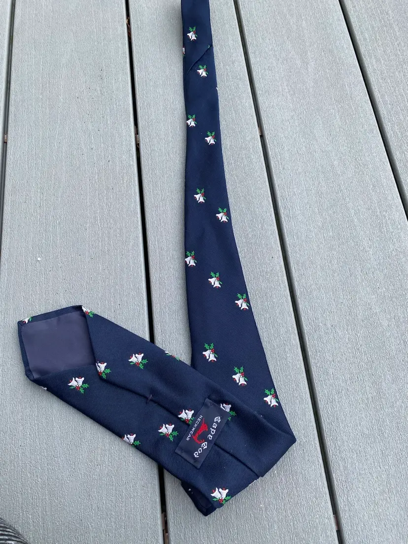 This is a vintage CAPE COD SILVER BELLS CHRISTMAS TIR. It has a dark navy blue background with little embroidered silver bells and red and green holly. This would be perfect to give as a Christmas gift or wear yourself for the holiday season. The tie measures approximately 60” long and 3.5” wide. The tie is very clean and in excellent vintage condition with no visible stains or damage.