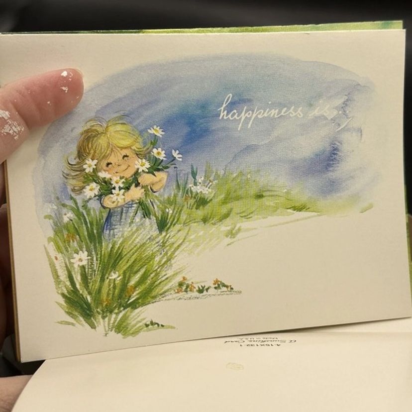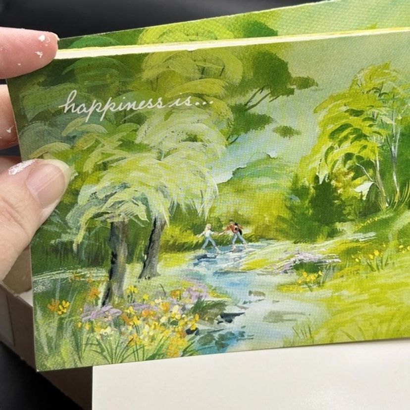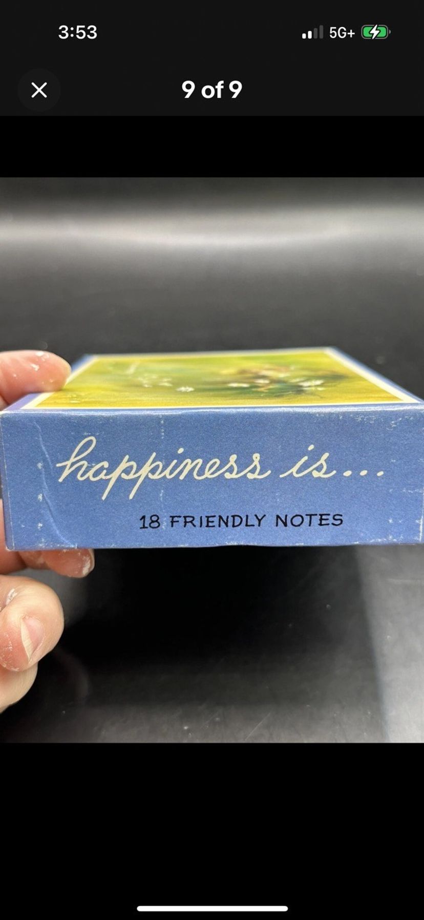 Add a touch of nostalgia to your card collection with these vintage greeting cards featuring the phrase "Happiness is." Each card comes with its own matching envelope, making them perfect for sending a heartfelt note to a loved one. The charming designs and unique style of these cards are sure to bring a smile to anyone's face. Whether you're a collector or just looking for a special way to show someone you care, these vintage cards are the perfect choice.