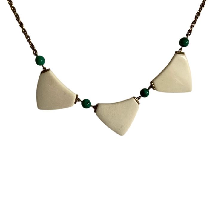 Vintage carved bone and Malachite bead necklace that is topped off with a gold tone chain. Length measures 16”.