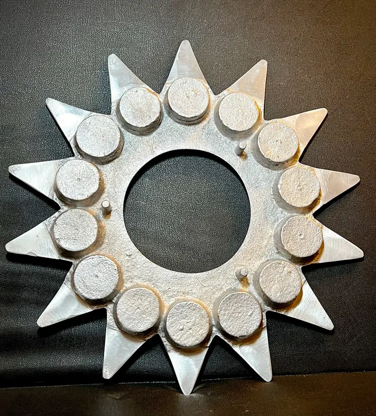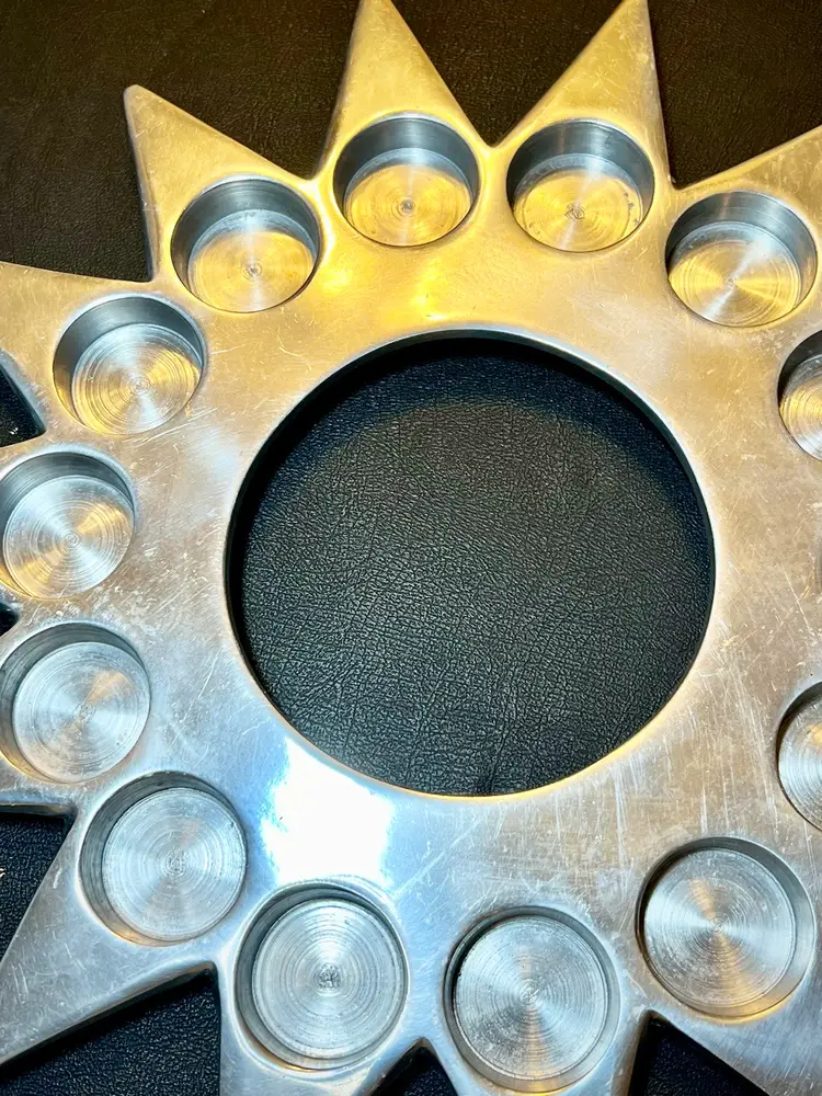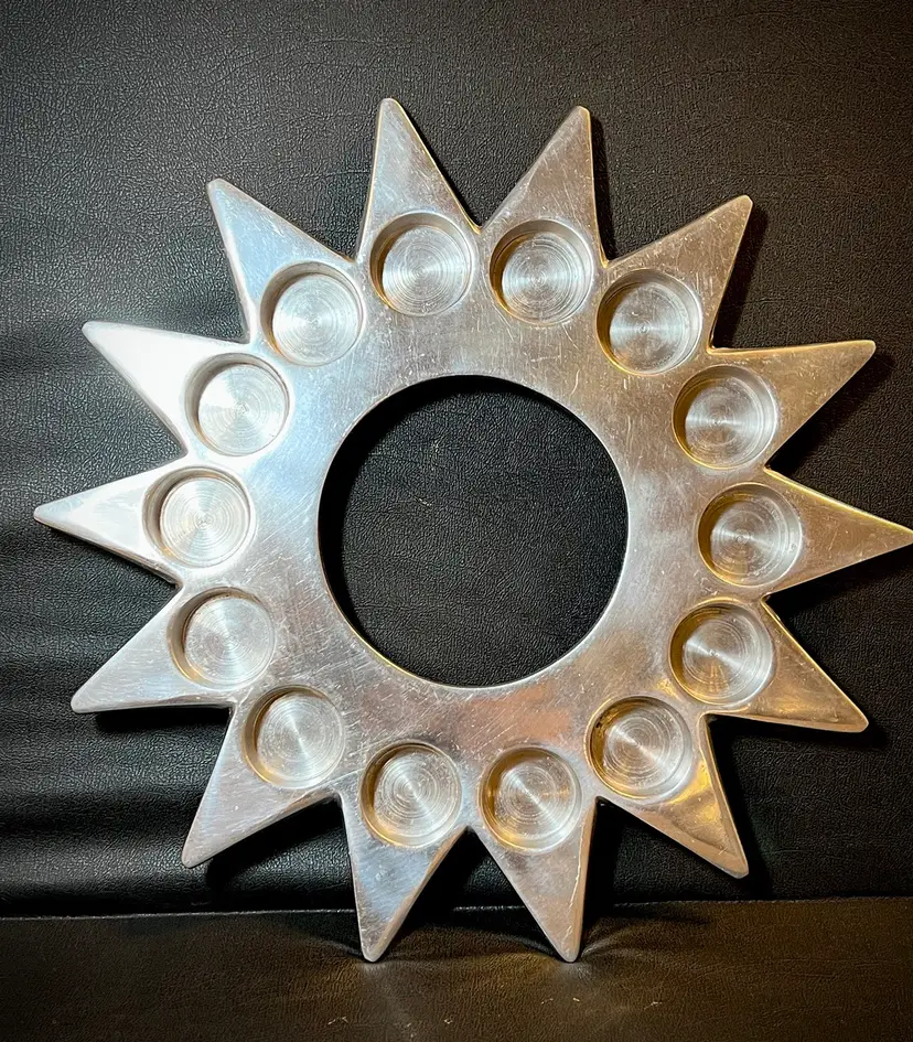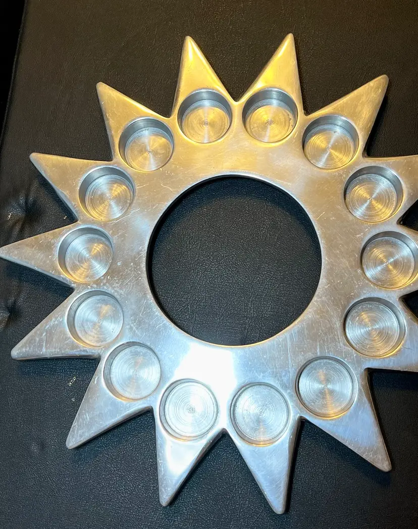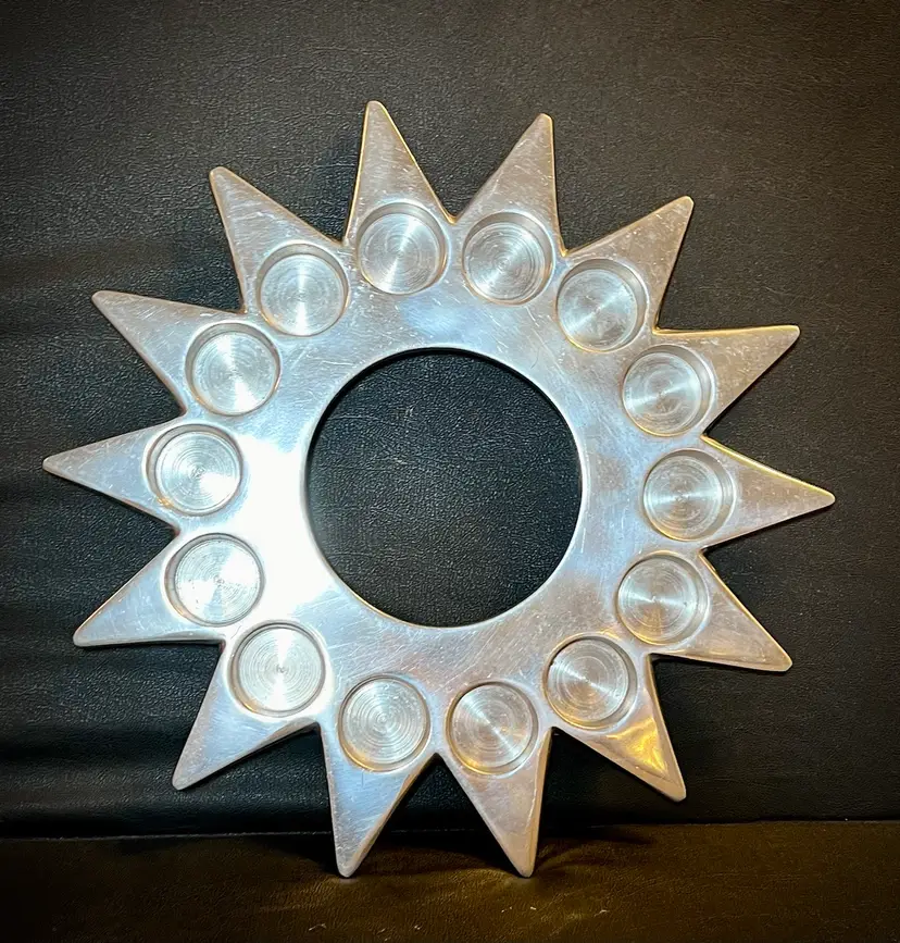 ☀️The perfect celestial centerpiece! Constructed of cast aluminum, this gorgeous sunburst holds 14 votive or tea light candles. This would be exquisite as a holiday table centerpiece! GVC, with age appropriate wear (light scuffs and scratches). 14.5” diameter, sits 1” high.