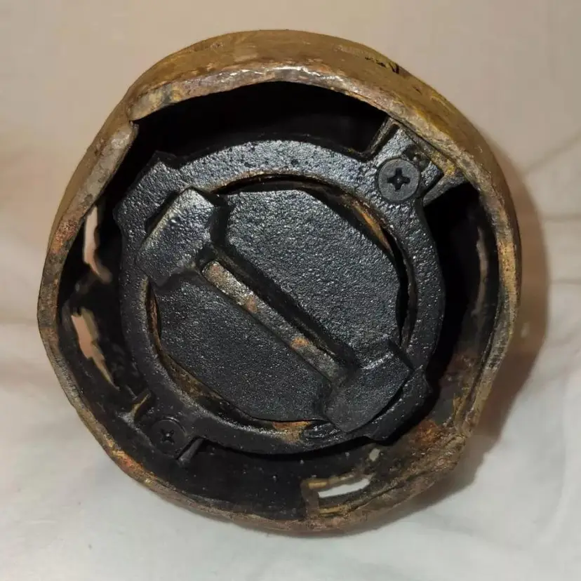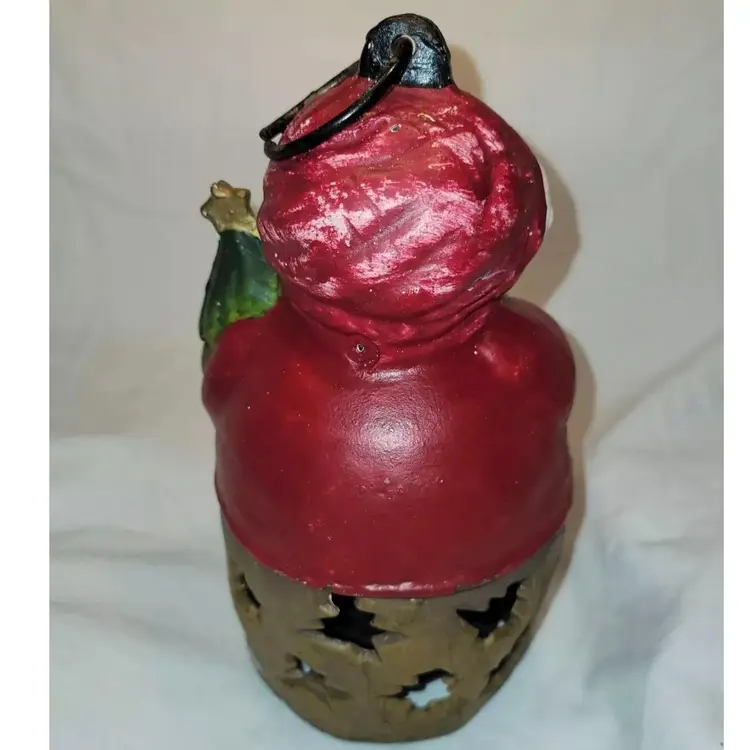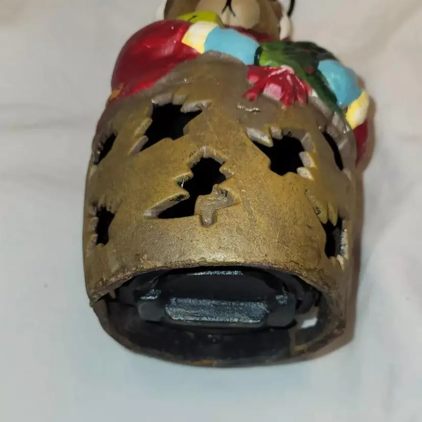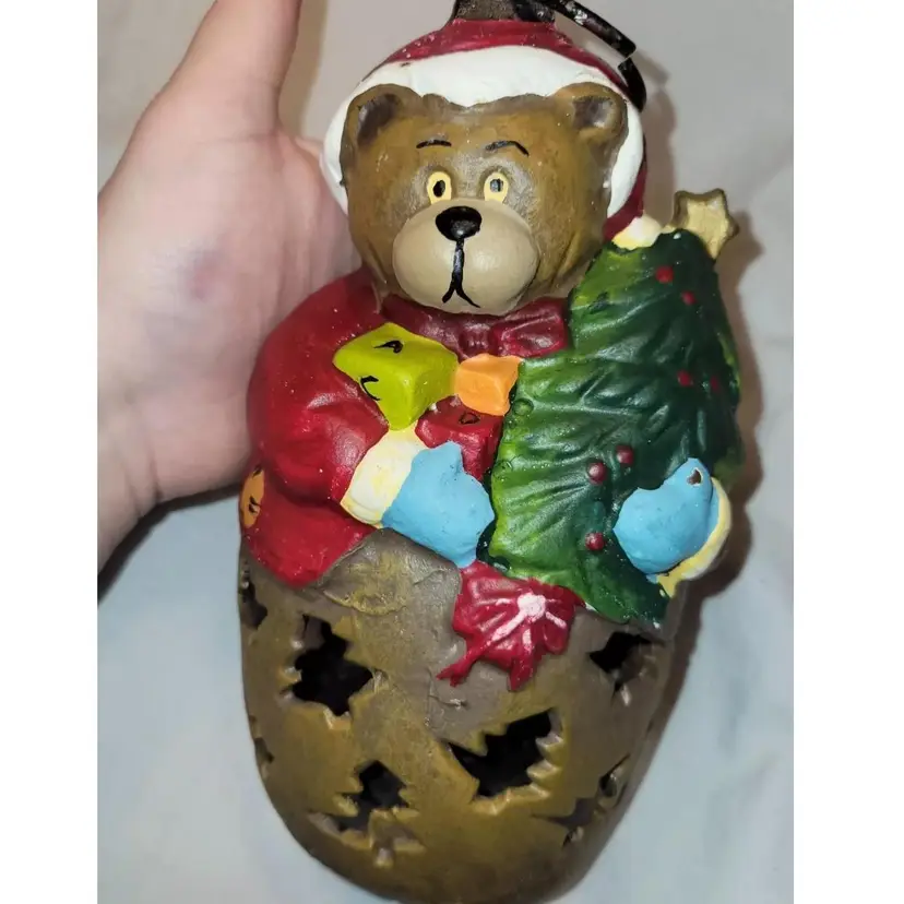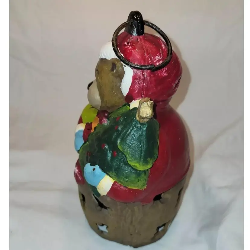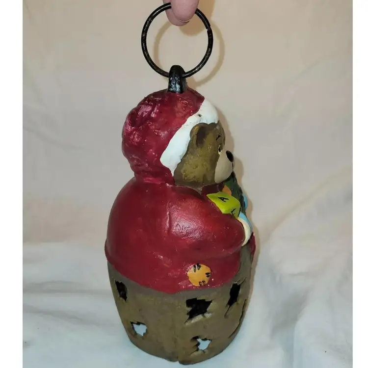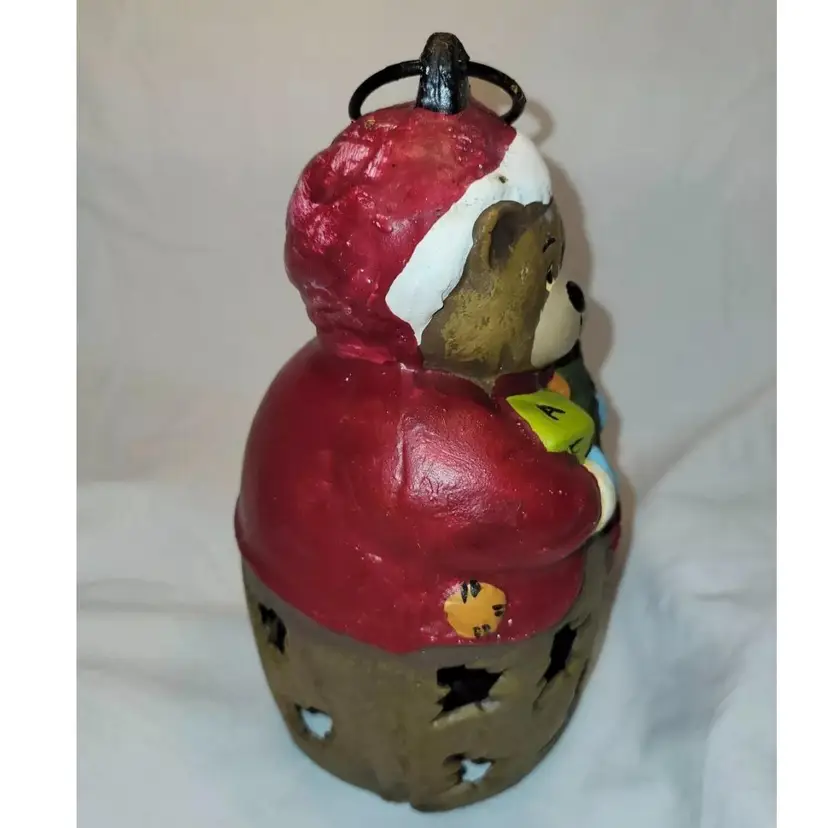 Heavy, hand painted, beautiful vintage Cast Iron tealight lantern. Has detachable screw off base that would hold the tealight candle. Does show some rust on the inside. There appears to be a signature, but it is very worn, and I can not say for sure if it is one or not. The bear is wearing a Santa hat, holding alphabet blocks, and a Christmas tree. It has a red bow and patched jacket on with blue mittens. On the body part of the bear, there are tree cutouts to let the light out. Very cute and rustic vintage decor! Love, love, love!