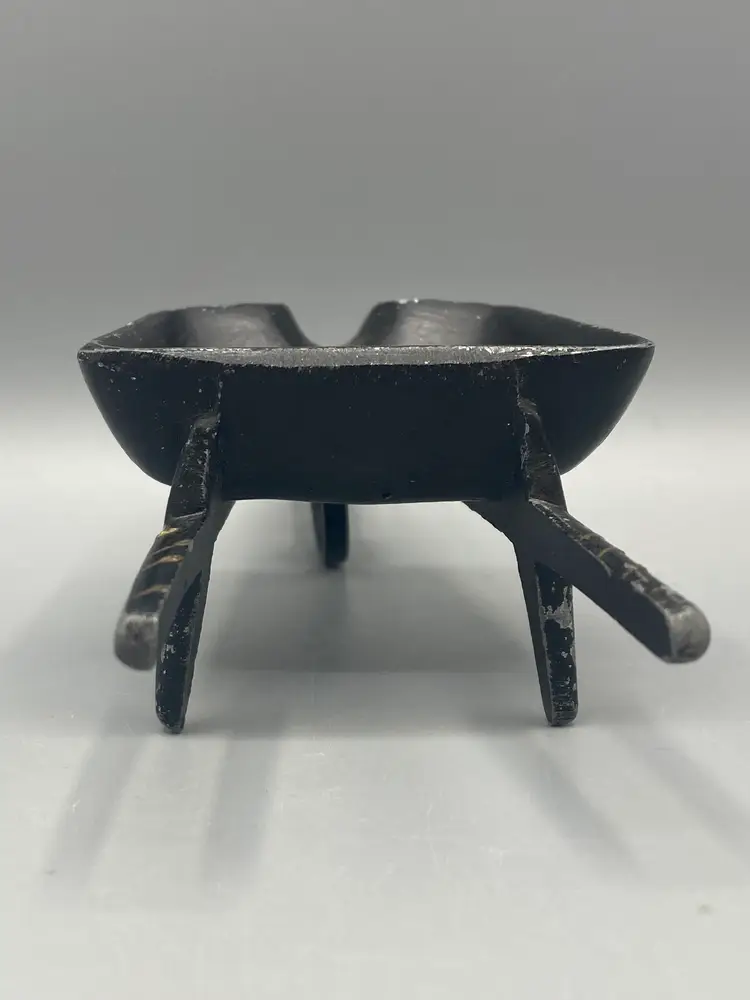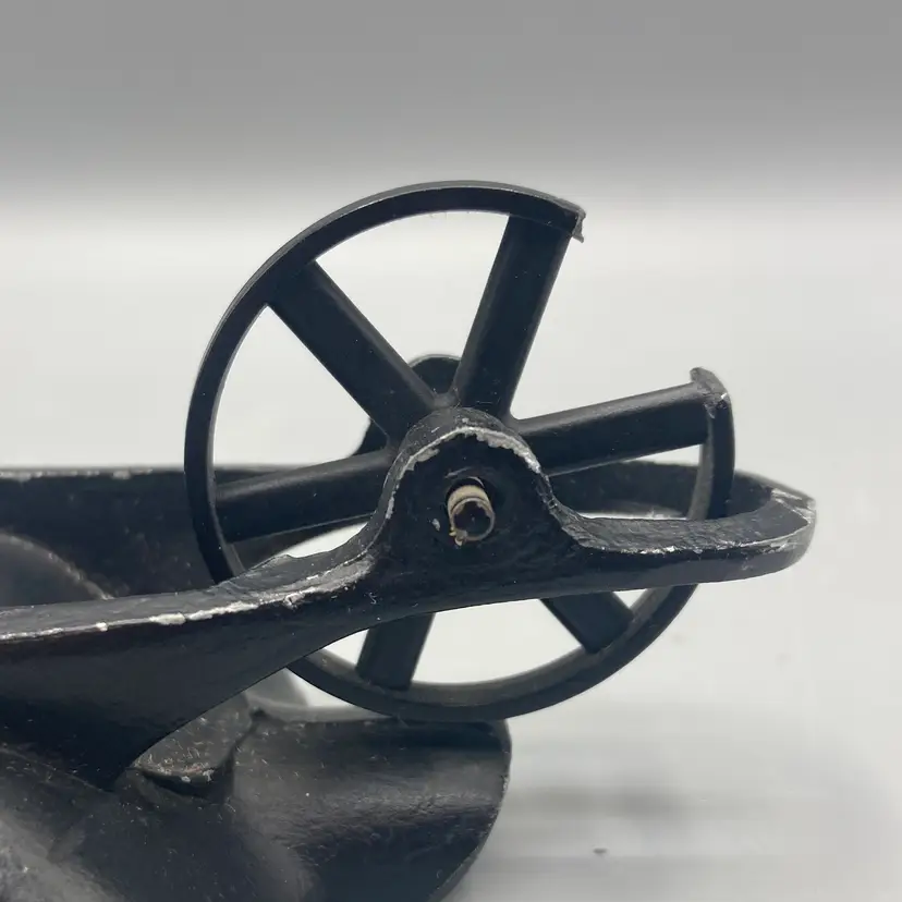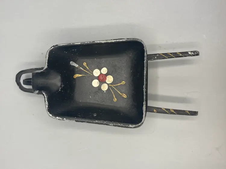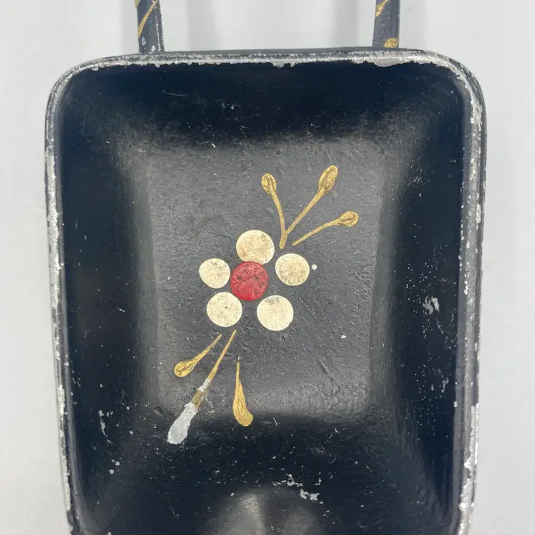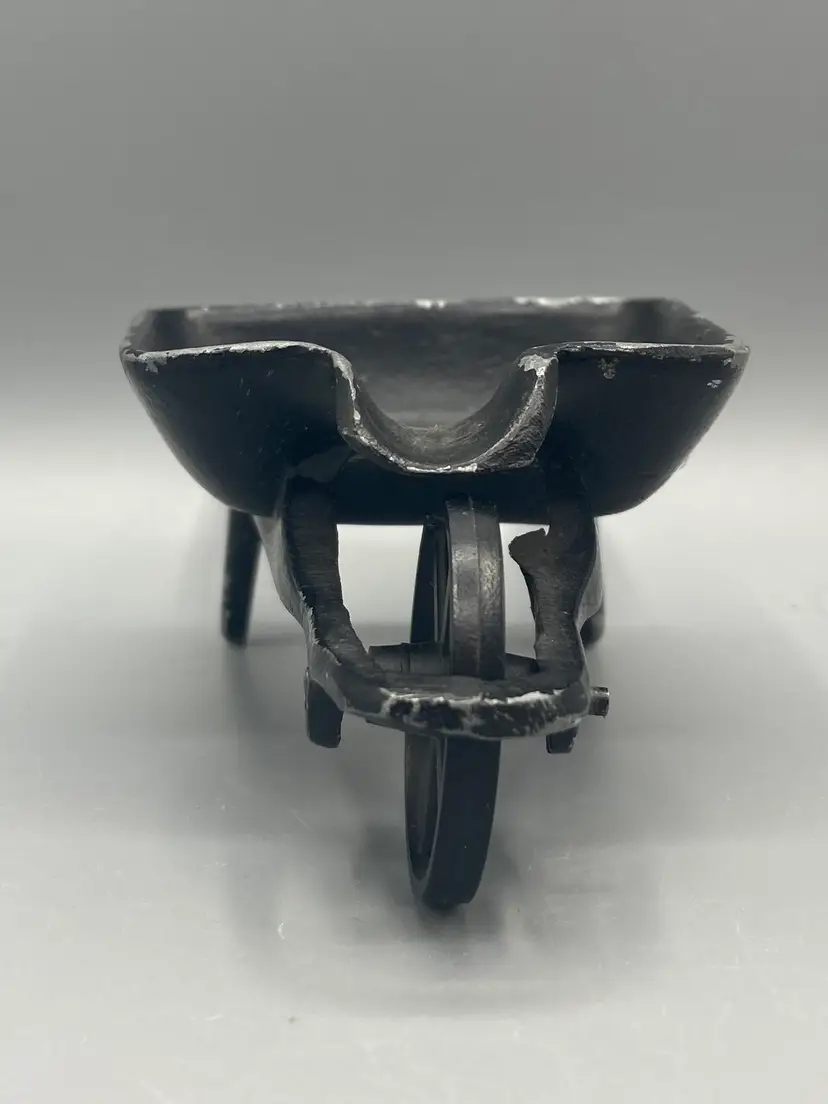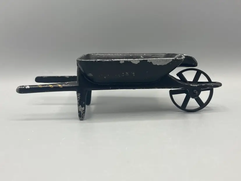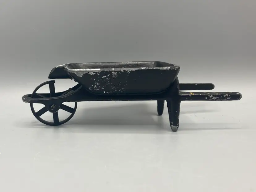 This wheelbarrow is in good overall condition; it does have a small section of the wheel that has broken off, see the last picture for details; as well as some of the black paint missing. It measures approximately 1 3/4" tall x 6" long x 2 3/4" wide.