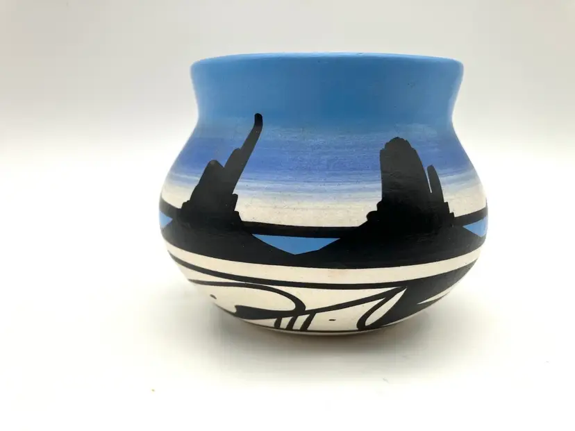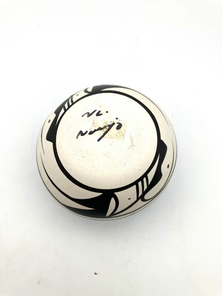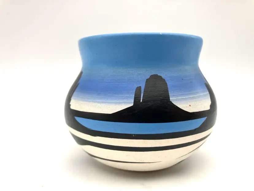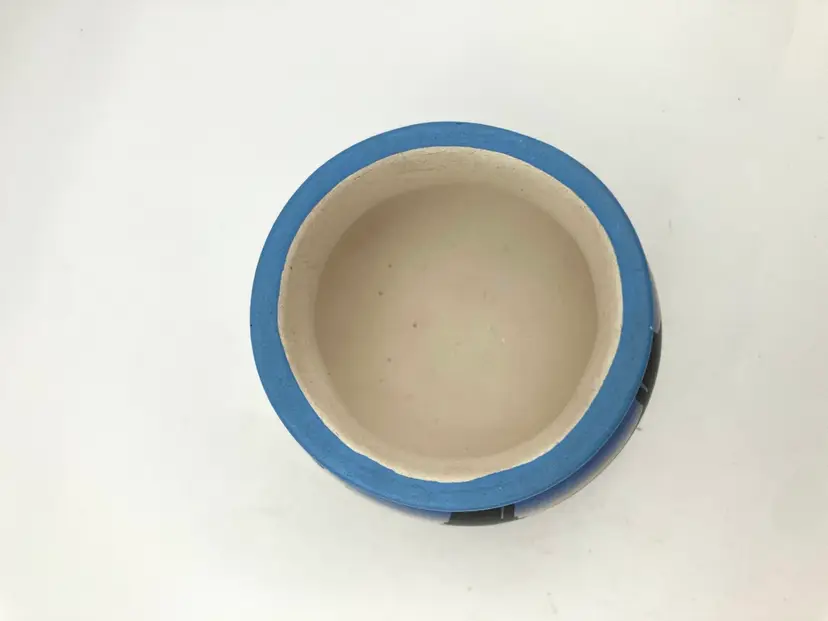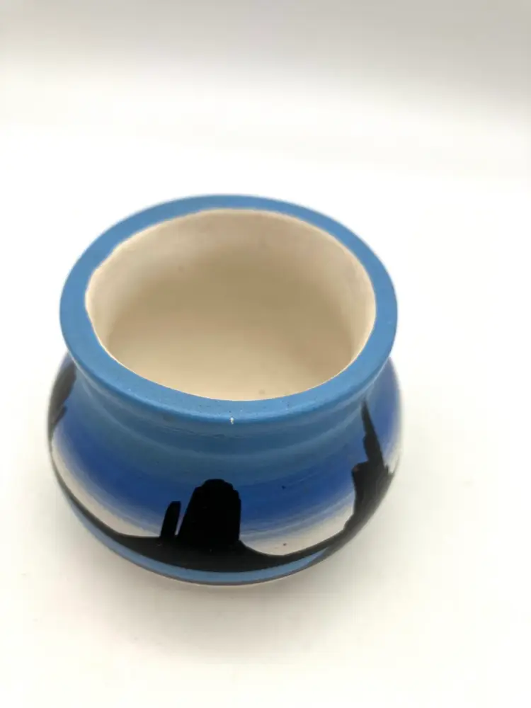 Measures 3.5” diameter and 2.5” tall great condition. A little sticker residue on base I didn’t want to scrub too hard as it is over the signature. One teeny paint chip on the rim that could be touched up.