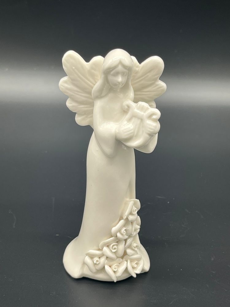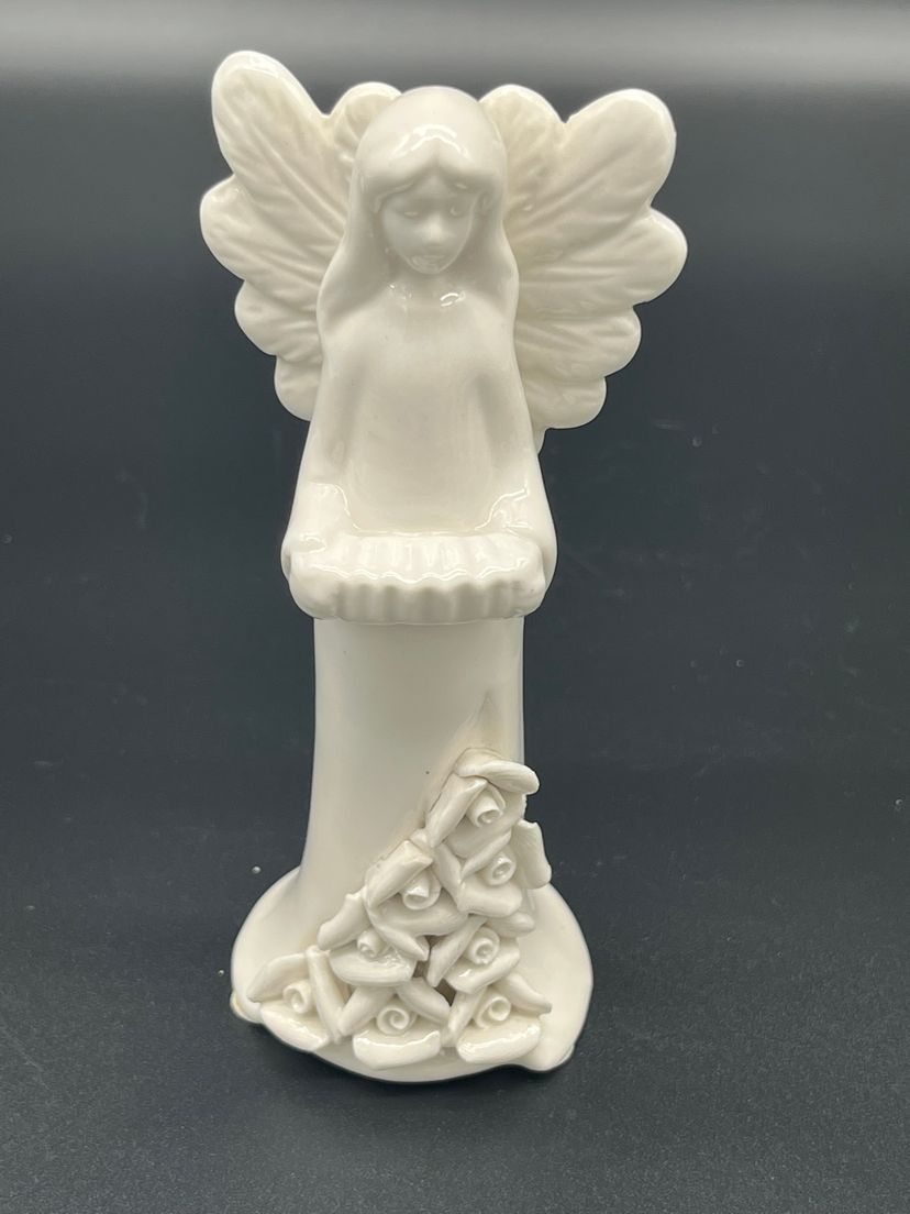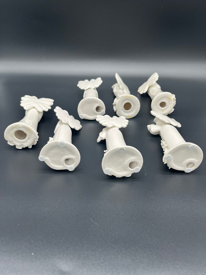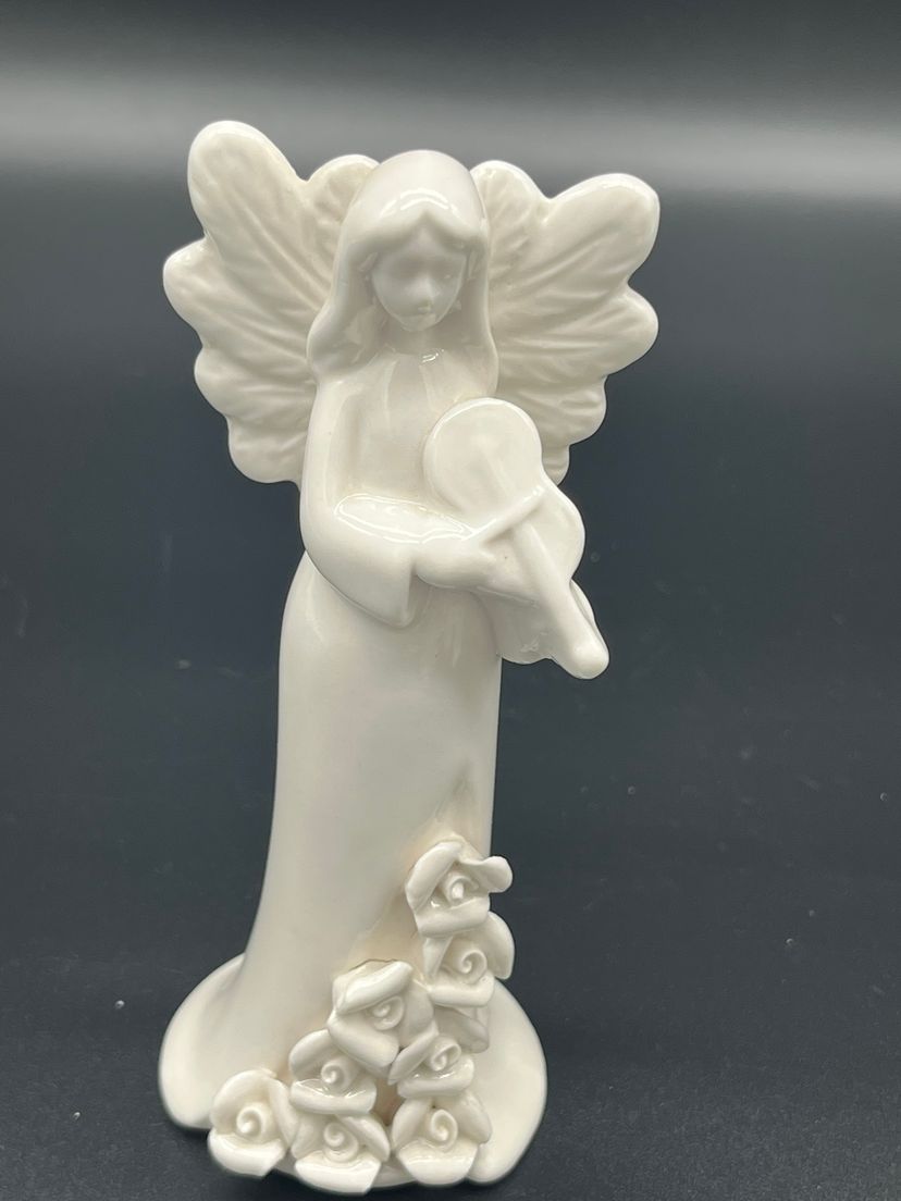 Create a heavenly holiday display with this set of 7 vintage ceramic angel figurines, each uniquely styled with instrument or symbolic item. Standing 5" tall, these angels feature delicate wings, flowing robes and floral base detailing. Their serene expressions and varied poses evoke a peaceful, nostalgic charm - perfect for mantel styling, nativity scenes or vintage Christmas vignettes.