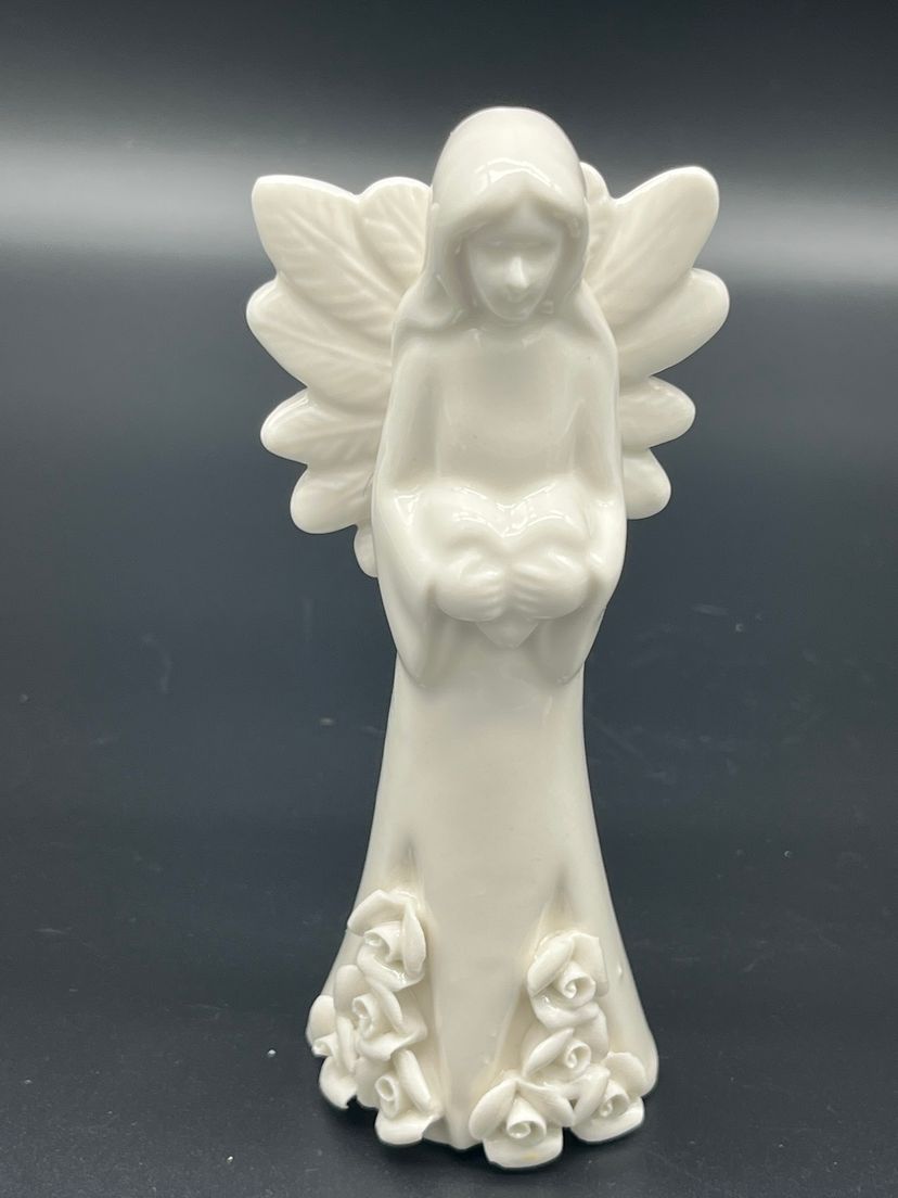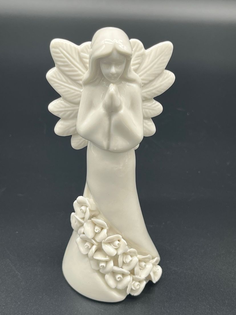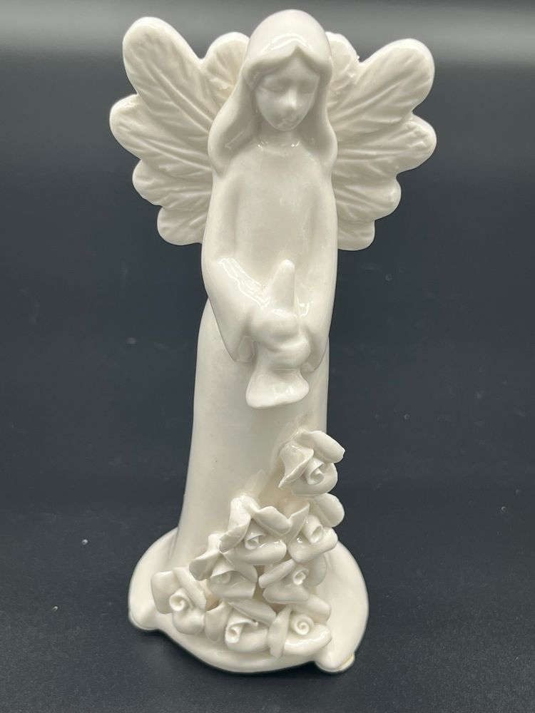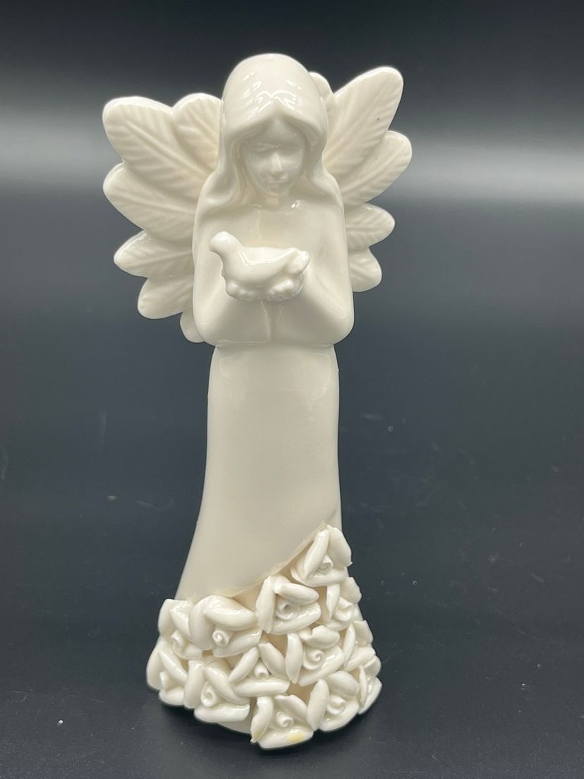 Create a heavenly holiday display with this set of 7 vintage ceramic angel figurines, each uniquely styled with instrument or symbolic item. Standing 5" tall, these angels feature delicate wings, flowing robes and floral base detailing. Their serene expressions and varied poses evoke a peaceful, nostalgic charm - perfect for mantel styling, nativity scenes or vintage Christmas vignettes.