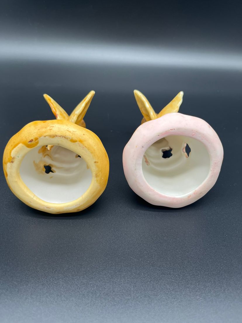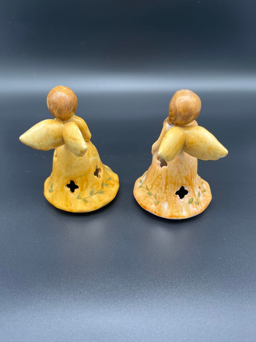 Add a warm glow to your holiday decor with this matching pair of vintage ceramic angel votive covers. Each angel features braided hair, crescent moon and floral motifs and delicate star-shaped cutouts designed to let candlelight shine through. Hollow interiors suggest they were crafted as luminaries - perfect for tealights or small LED candles. Painted in soft earth tones with hand-detailed accents, they bring a peaceful, celestial vibe to mantels, shelves or spiritual displays. Shipping is included. Each angel measures approximately 5" tall and 3" wide. Good condition - One angel is slightly more saturated in color under bright light.