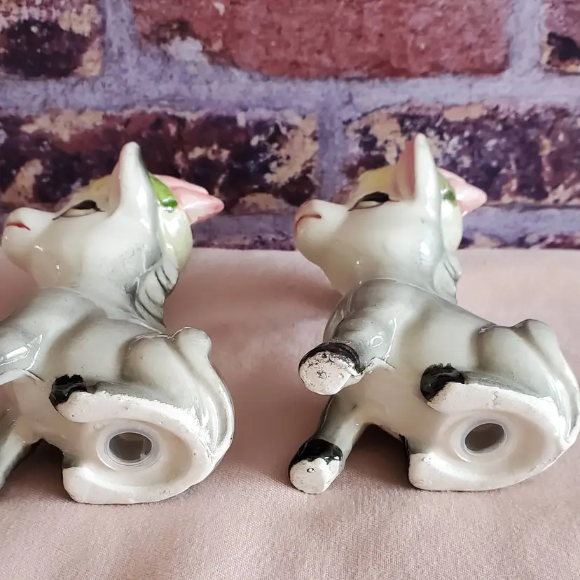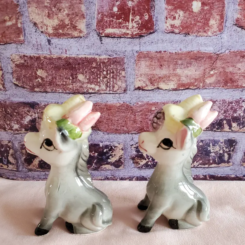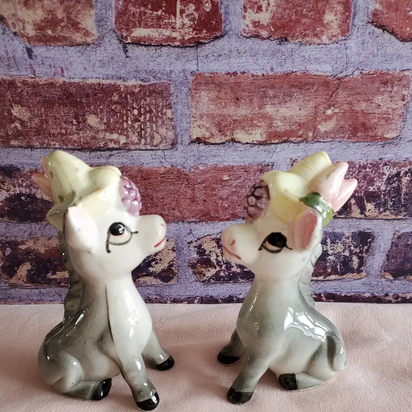 Vintage Ceramic Anthropomorphic Donkey Salt and Pepper Shakers with Fruit Hats Kitsch