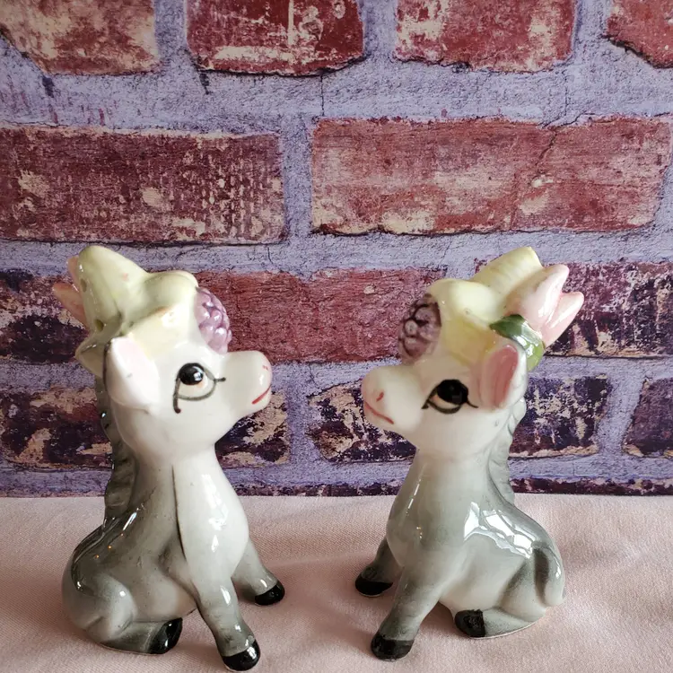 Vintage Ceramic Anthropomorphic Donkey Salt and Pepper Shakers with Fruit Hats Kitsch- GUC (see photos).