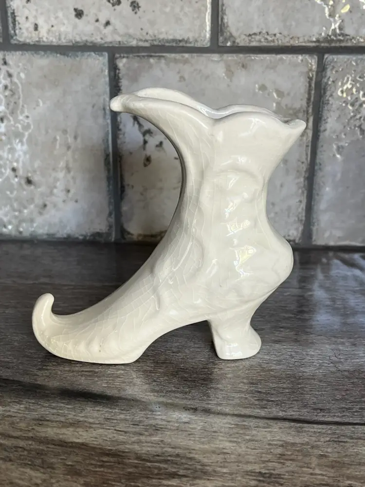 A beautiful old ceramic boot! 4 1/2 inches tall and wide and 1 1/2 inches in dimension. Crazing. A couple dings in the mouth. Displays beautifully!