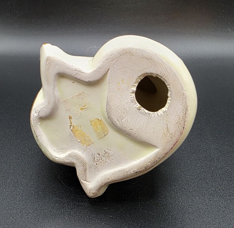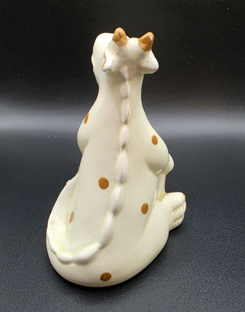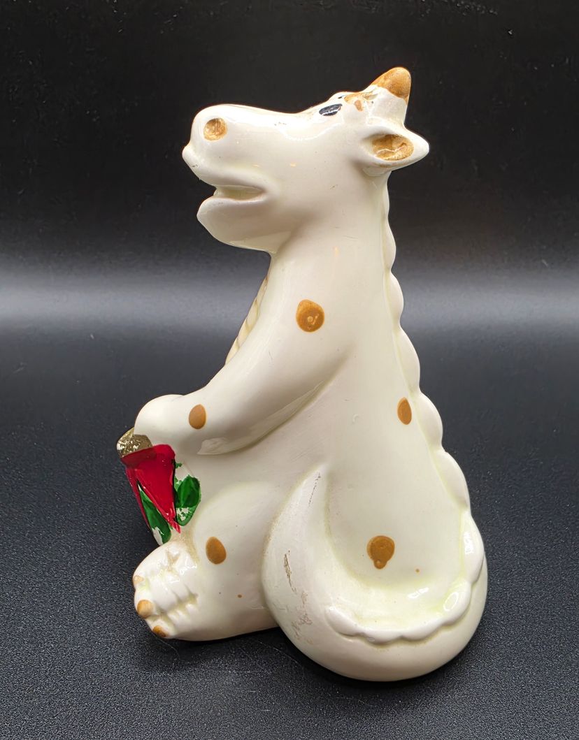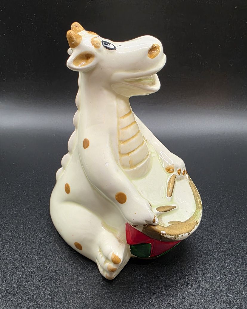 Add a playful touch to your collection with this charming vintage ceramic dragon, joyfully playing a colorful drum. With its cream-colored body, cheerful orange spots, and expressive face, this seated dragon radiates personality. The hand-painted details—wide eyes, raised eyebrows, and vibrant drum—make it a delightful conversation piece for any shelf, curio cabinet, or whimsical décor theme.
