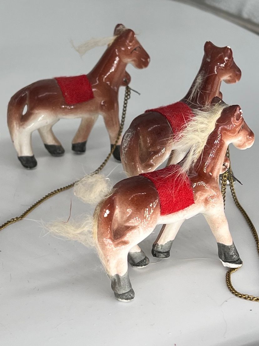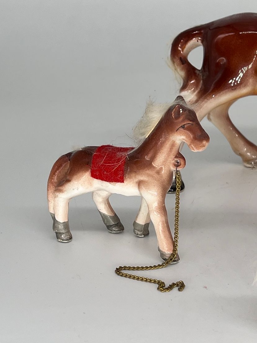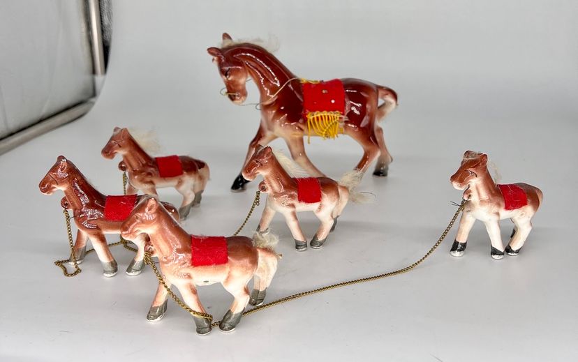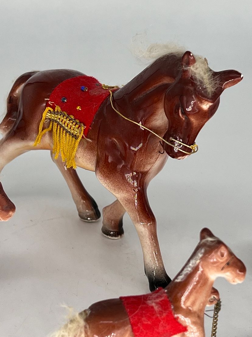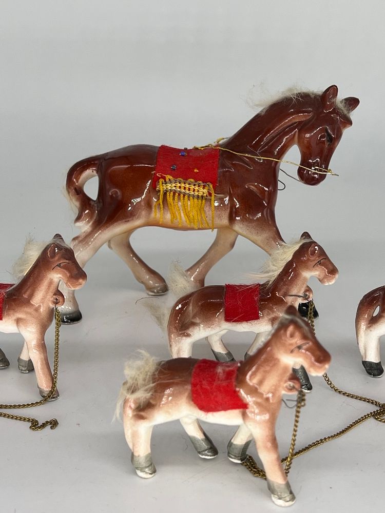 Vintage set of six ceramic horse figurines. Circus horse and ponies/colts wearing red saddle blankets one with gold fringe.