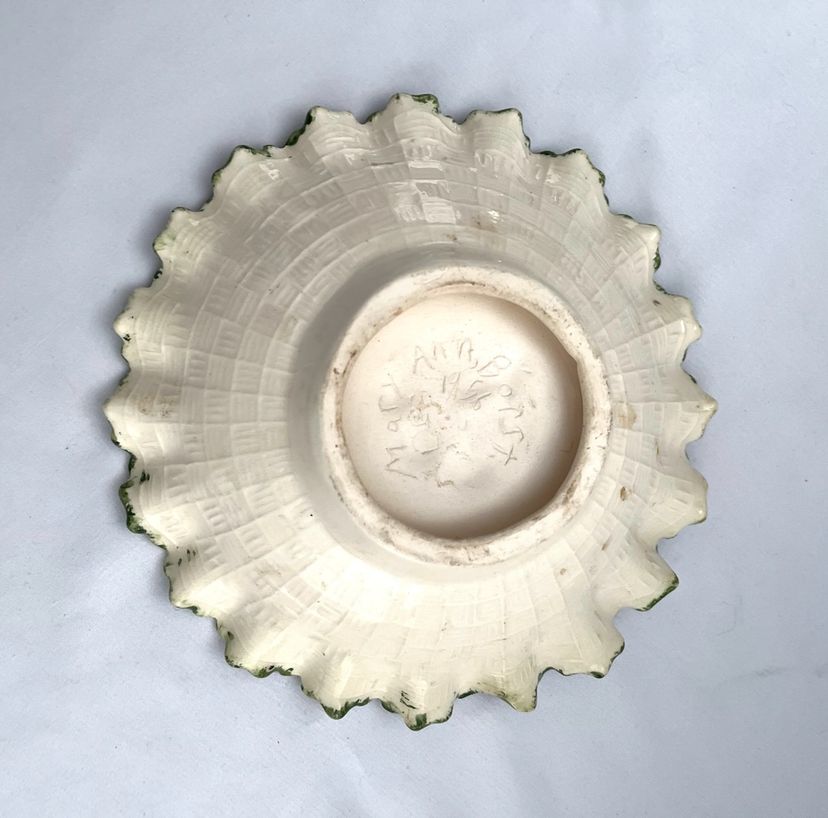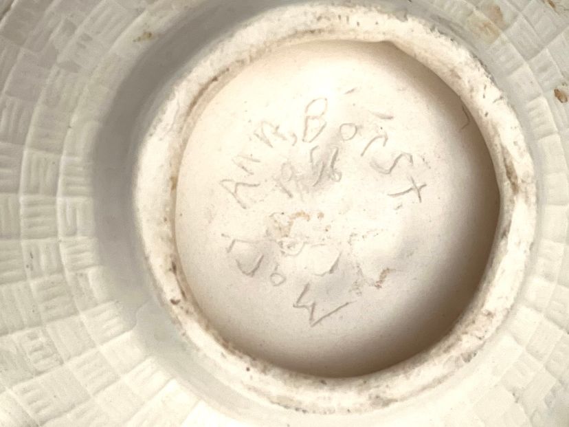 A pretty vintage hand painted and possibly hand crafted as well. It's very hard to tell. I cannot find Mary's name when searching. Cherries, pears and apples. Basket weave pattern on the underside. Mary Ann Borst Dec. 1956. I wish I knew more about this darling bowl. It looks as though it was a cherished but lightly used bowl. Approximately 2 inches tall and 7 inches wide at the top tapering down to 3 inches. No chips, flea bites or such.