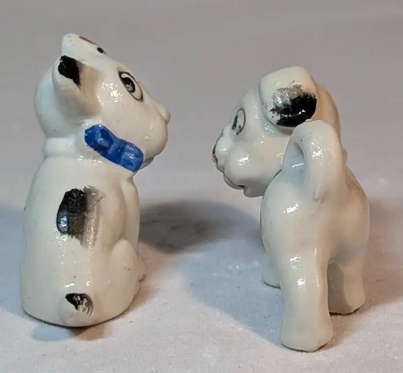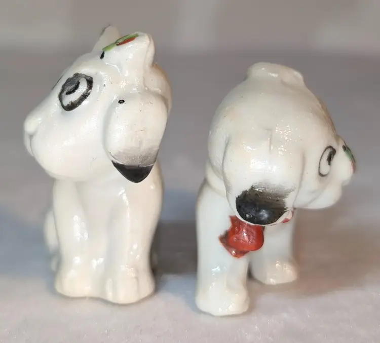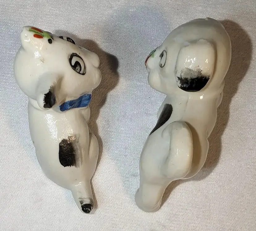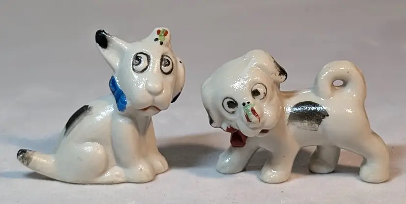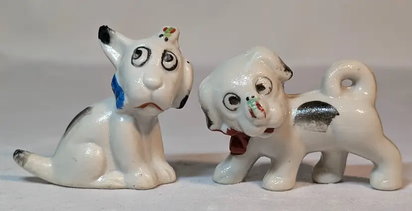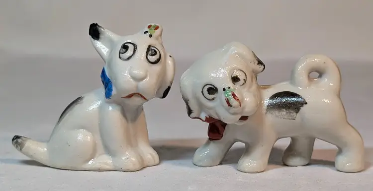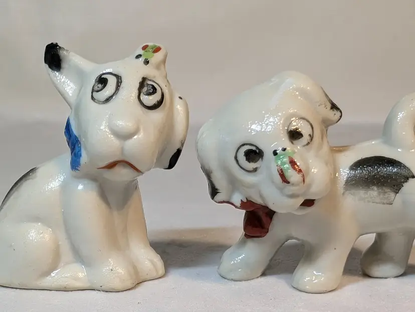 Charming pair of vintage ceramic dog figurines with hand-painted details. Each dog features a cricket on nose or top of head. Perfect for collectors or as a whimsical addition to your decor. No chips or cracks. Slight wear to painting. See pictures for details. Each measures approx 2 inches tall.