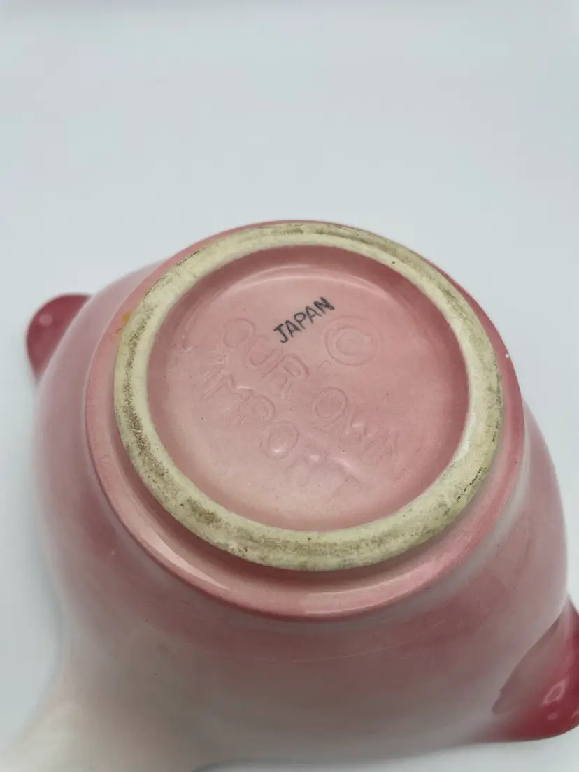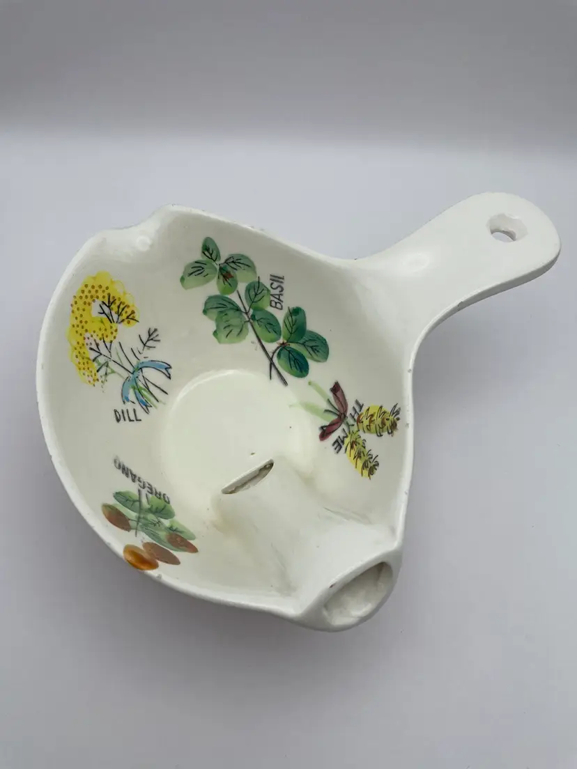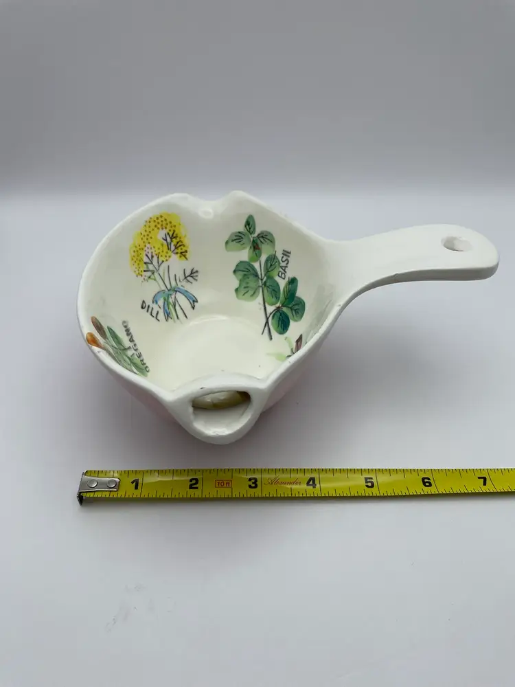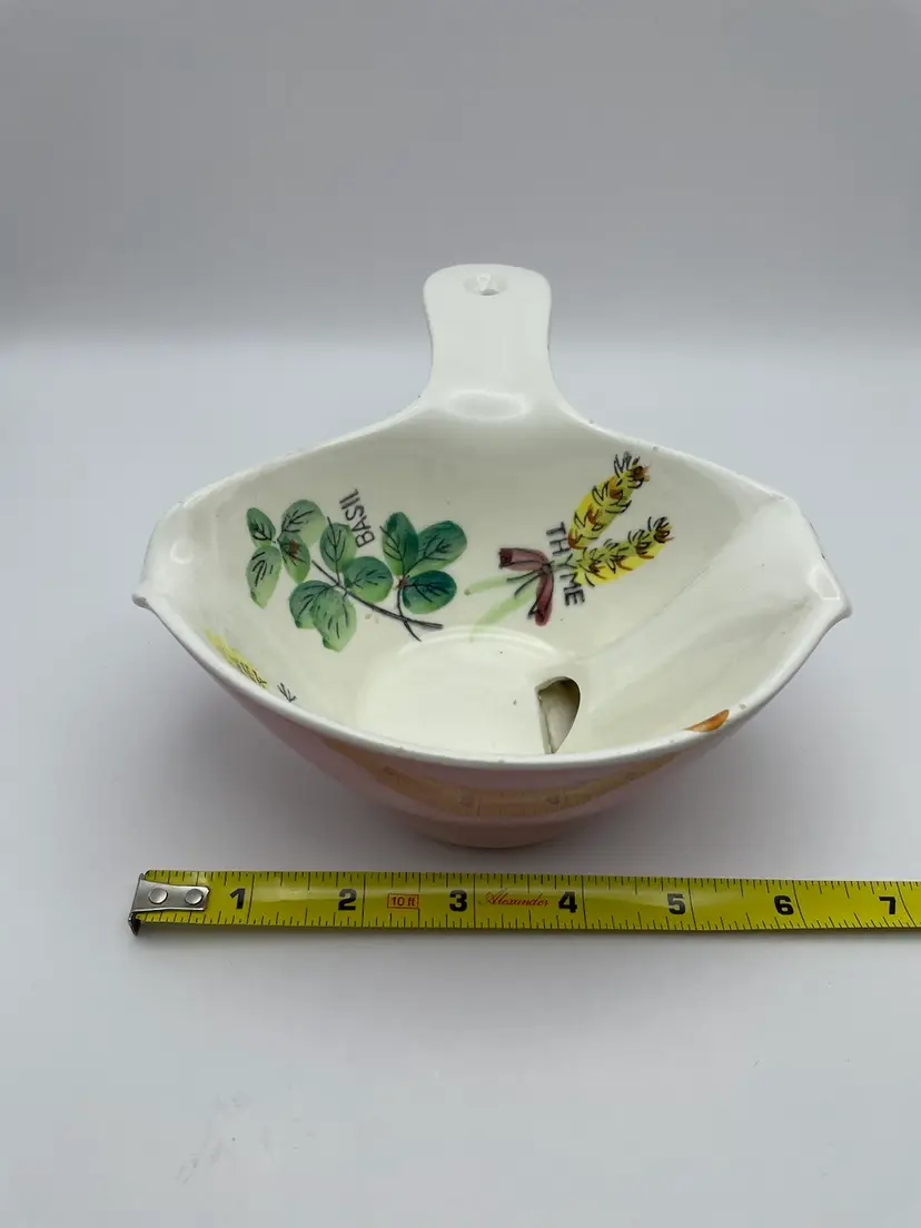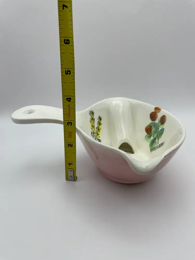 Vintage, Ceramic, Gravy Separator/Boat, Herbs, Pink Base, Our Own Import, Japan (Crazing, due to age) Please see pictures for measurements.