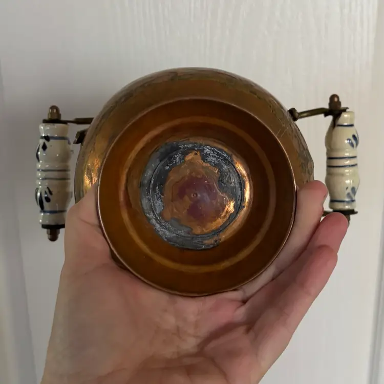 9”wide including handles, 5 1/2”diameter x 6”tall Vintage wear & patina- one handle is chipped, turned in so not very noticeable