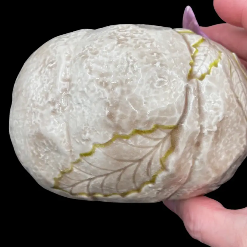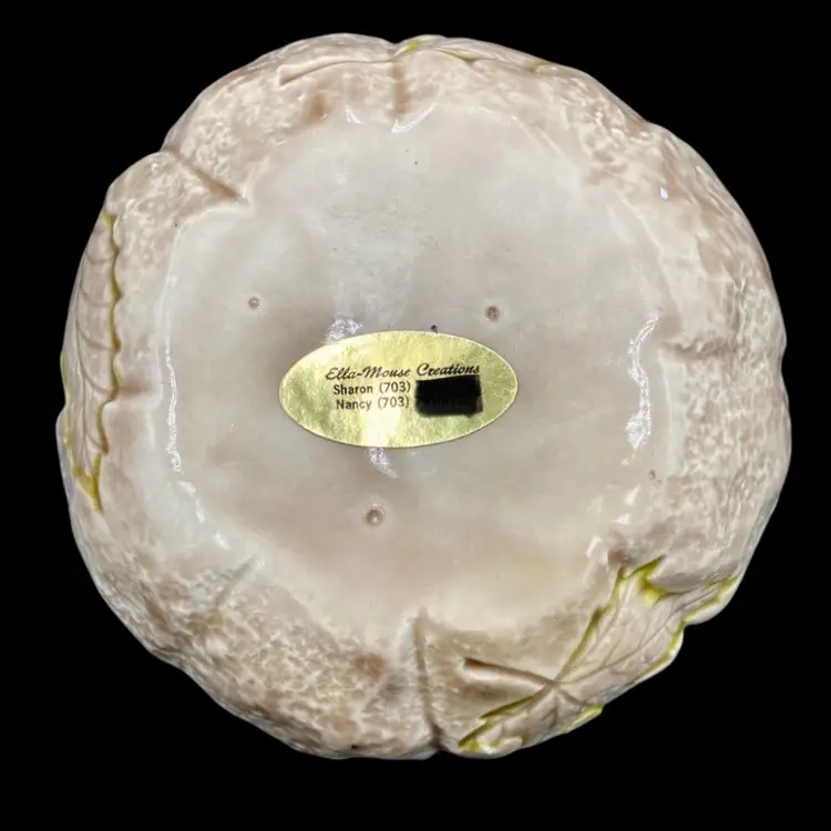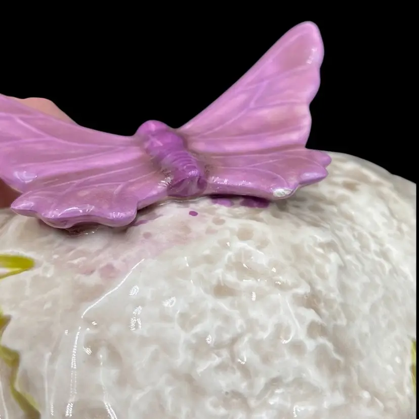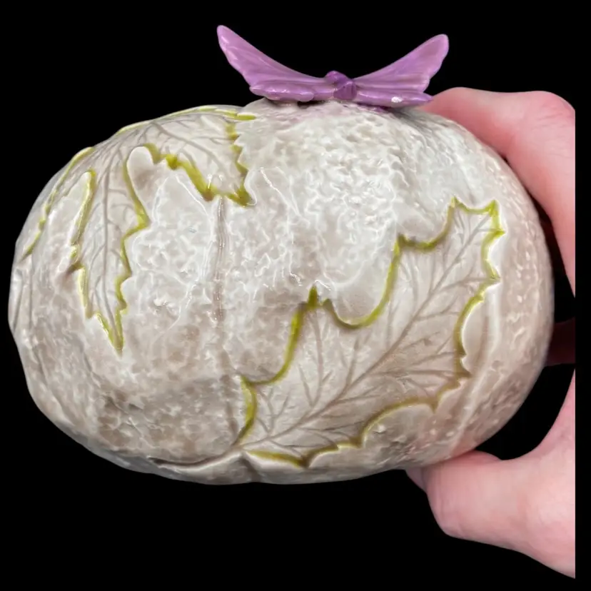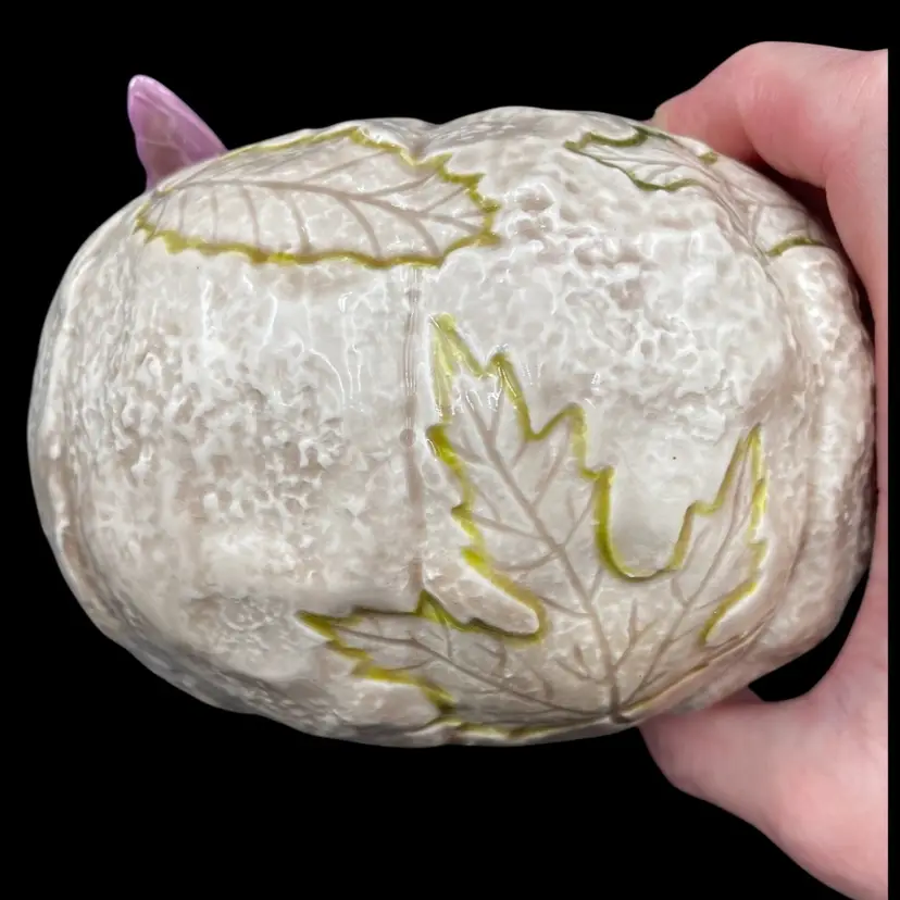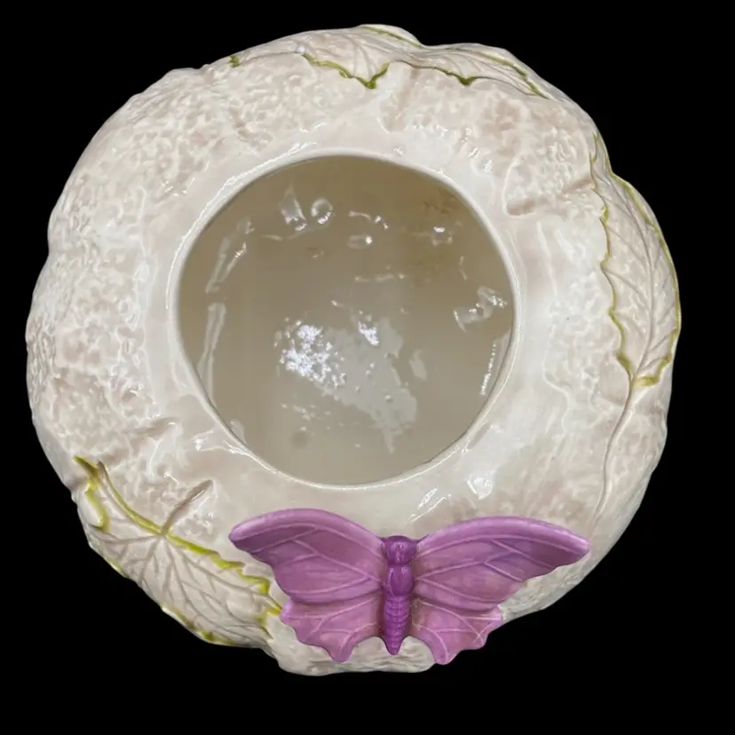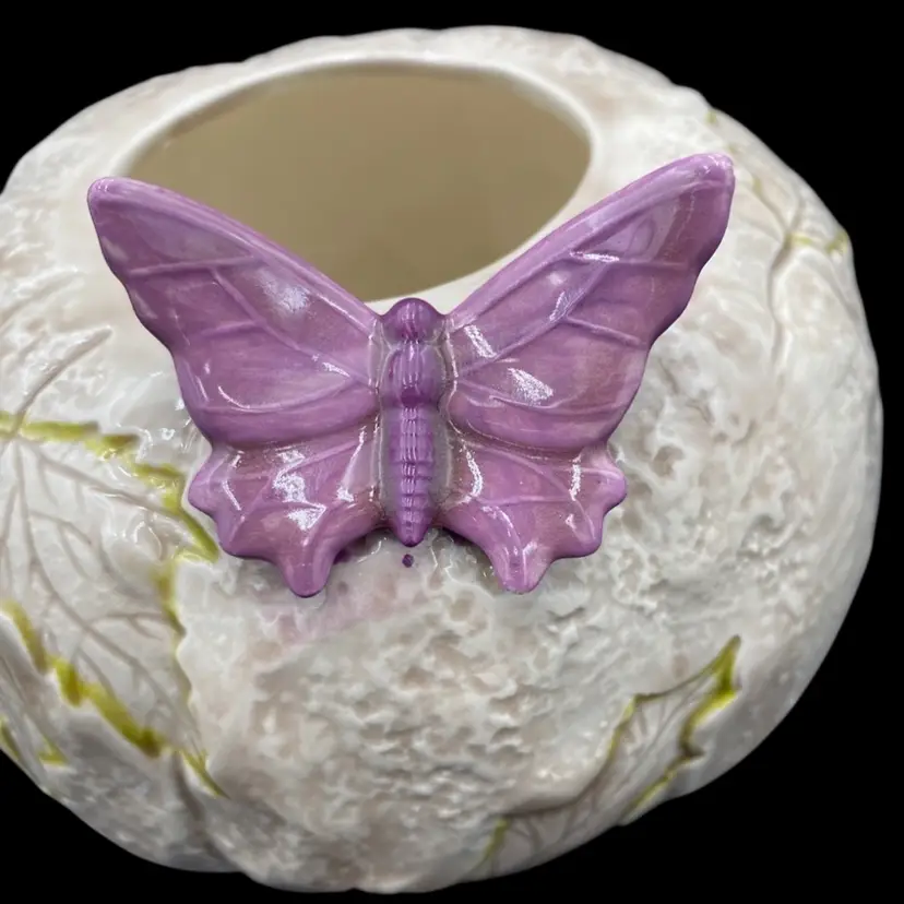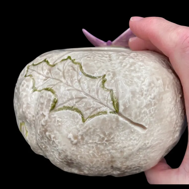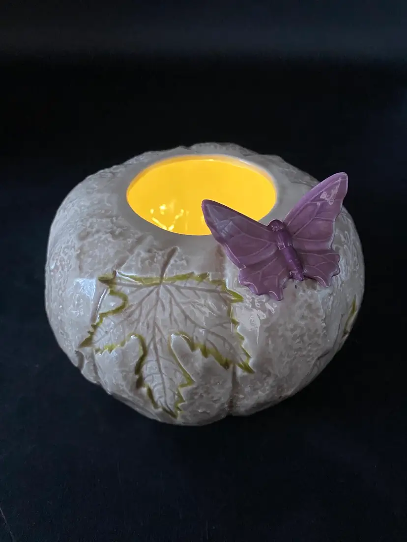 This vintage ceramic candle holder features a pumpkin-shaped bowl with an impressed leaf pattern outlined in green and an attached purple butterfly. The glossy finish and natural colors make it a suitable addition to any decor. Measuring 4.25 inches in height and 5.5 inches in width, this candle holder is perfect for holding pillar candles and is suitable for all occasions. This would also make an excellent potpourri bowl. Finally, it weighs just under one pound (14.4 ounces).